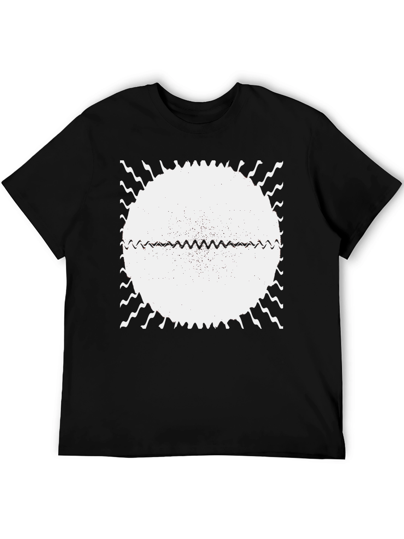 Elevate your wardrobe with this unique black t-shirt, featuring an eye-catching abstract graphic. The bold white design is centered on the chest, creating a striking visual impact. The design includes a large circular form with internal details, surrounded by abstract patterns. Made from a comfortable and breathable fabric, this tee is perfect for everyday wear. Pair it with jeans or shorts for a casual yet stylish look. Make a statement with this distinctive and trendy t-shirt.