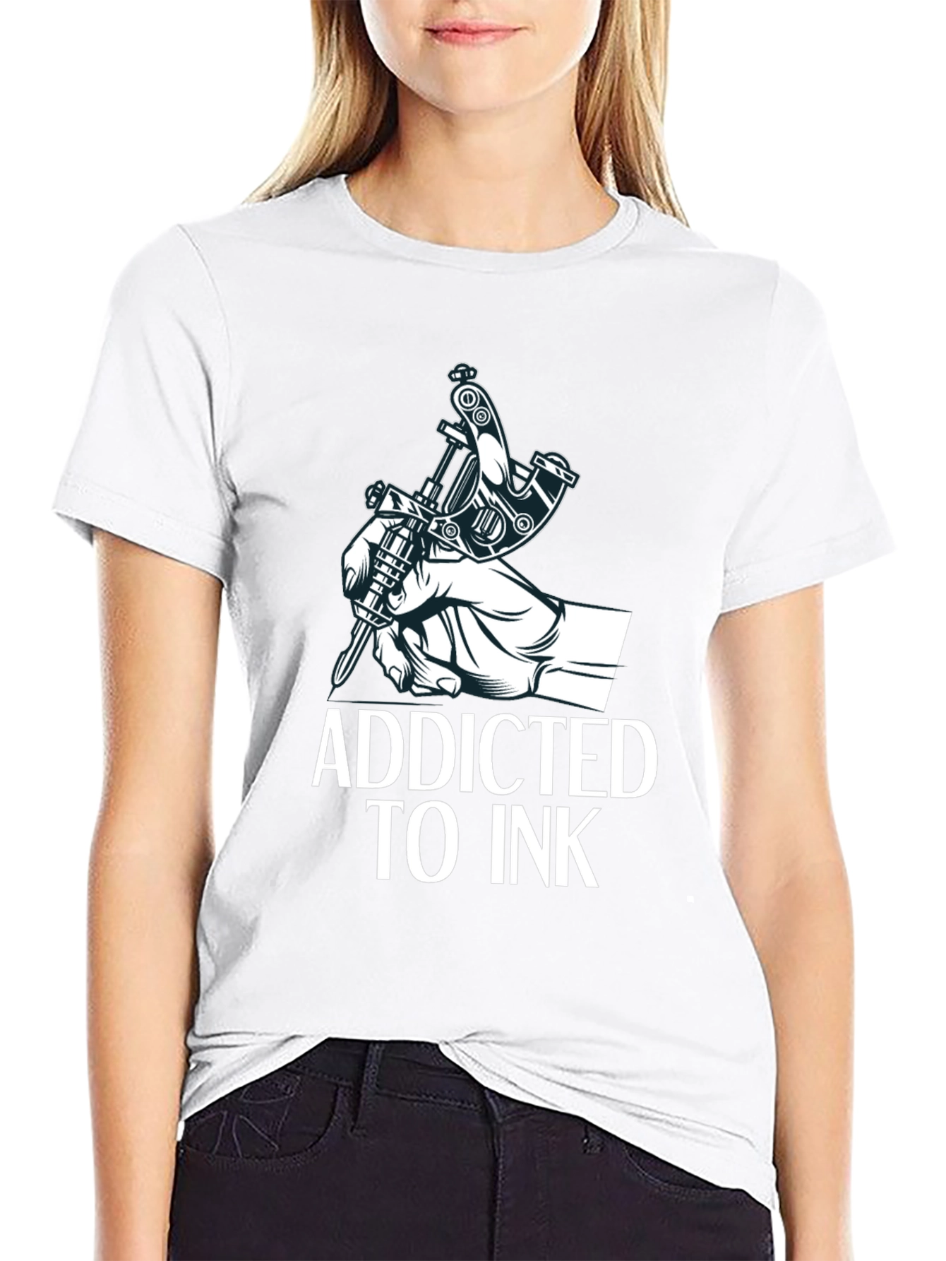 Showcase your love for ink with this bold graphic tee. This black t-shirt features a detailed tattoo machine design, held by a hand and the text "ADDICTED TO INK". Crafted from a comfortable fabric, it's perfect for everyday wear or for showing off your passion at tattoo conventions. The classic fit makes it a versatile addition to any wardrobe. Ideal for tattoo artists, enthusiasts, or anyone who appreciates unique graphic designs. Make a statement with this standout tee.