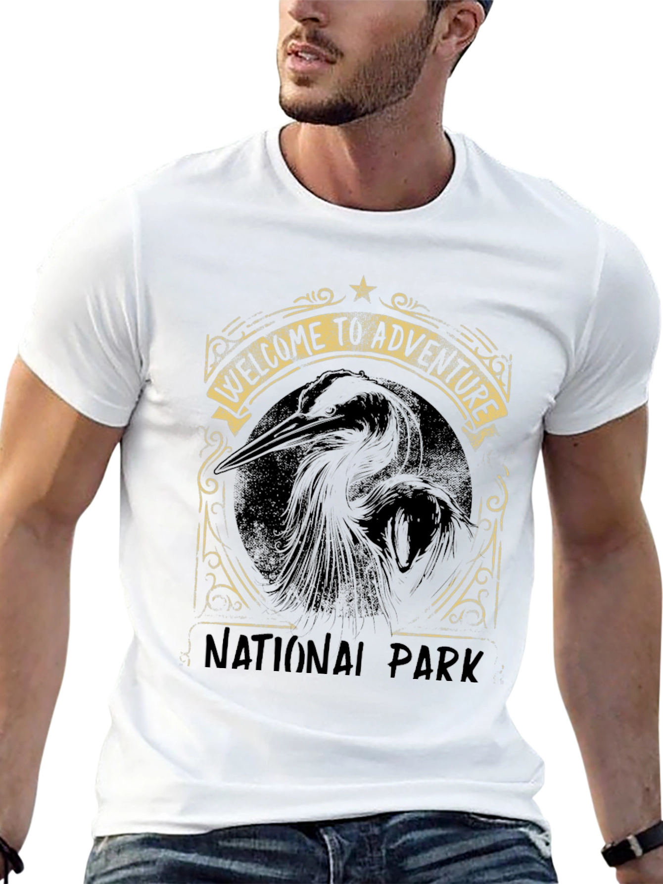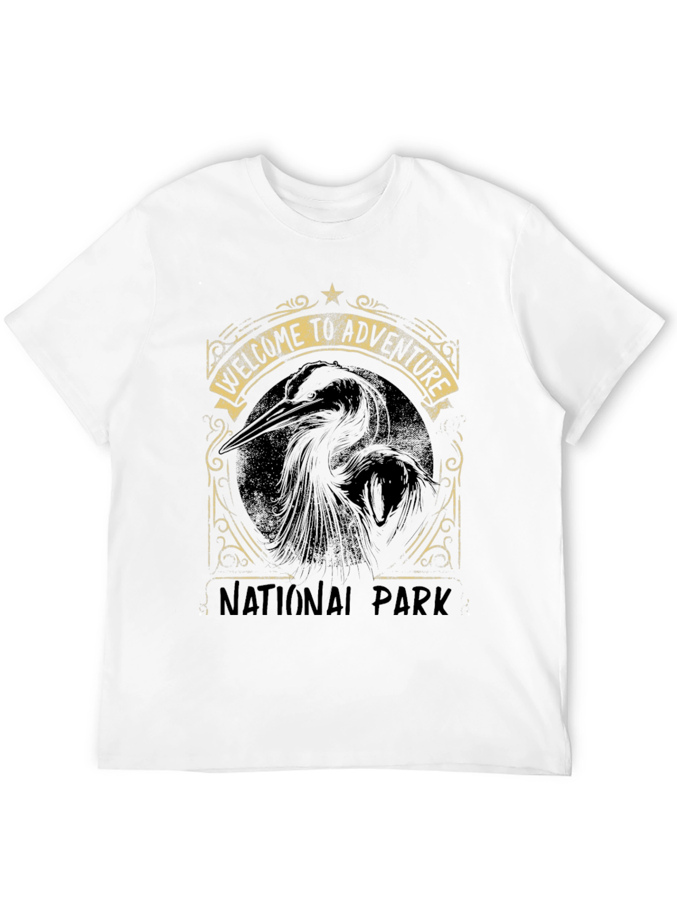 Showcase your love for the great outdoors with this striking black graphic tee. The shirt features a unique design centered around a majestic bird, possibly a heron, framed within an elaborate, vintage-style border. The words "WELCOME TO ADVENTURE" arch gracefully above, while "NATIONAL PARK" grounds the design below. The graphic itself has a distressed, worn look, giving it a cool, retro vibe. Made from a soft, comfortable fabric, this tee is perfect for everyday wear or your next outdoor excursion. Whether you're hiking in the mountains, exploring a new park, or simply relaxing at home, this shirt is a stylish way to express your passion for adventure and nature. The unique design is sure to be a conversation starter!