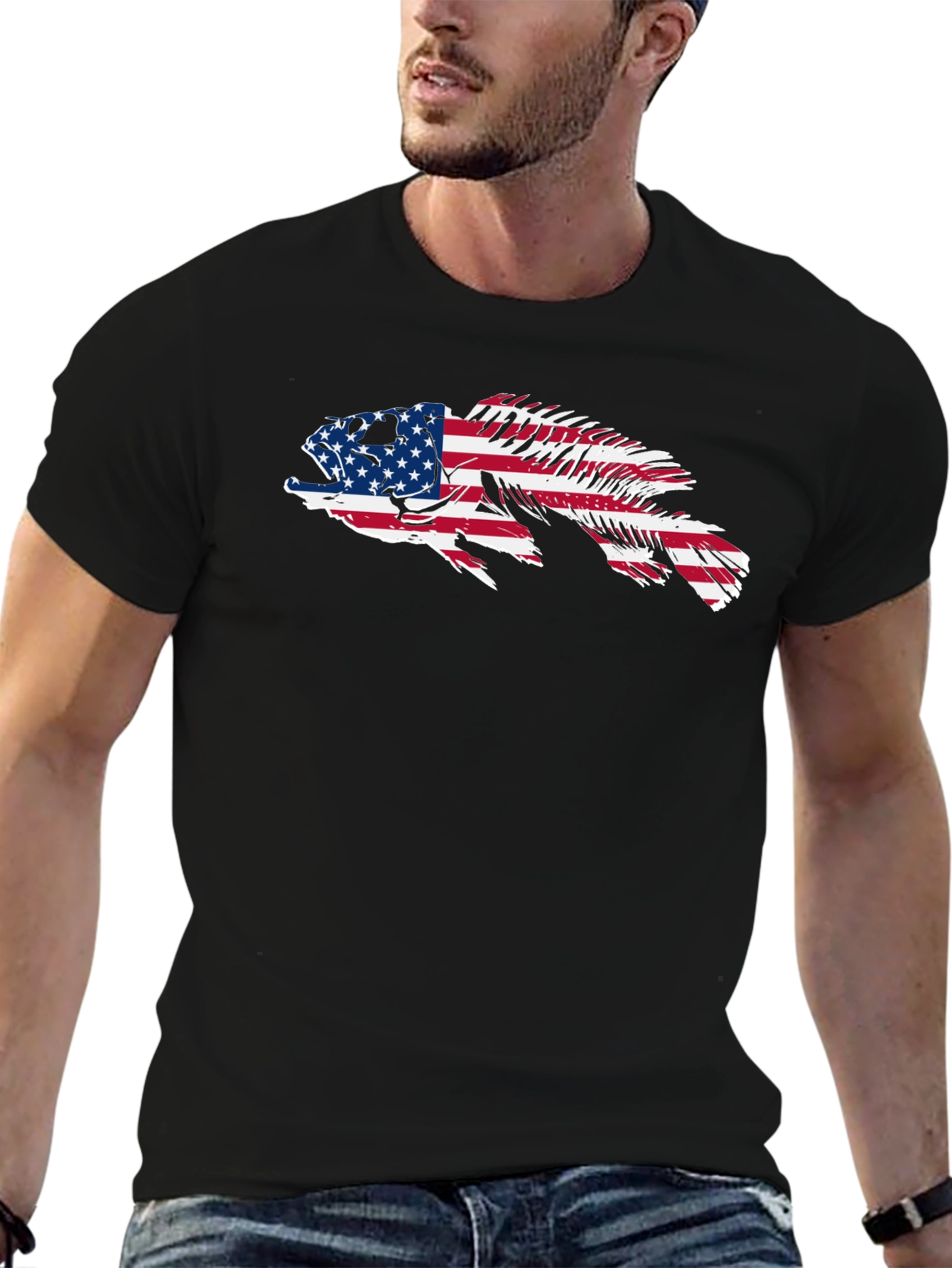 Show off your love for fishing and your country with this unique graphic tee! This black t-shirt features a bold and eye-catching design of a fish silhouette filled with the iconic stars and stripes of the American flag. The distinct design incorporates a distressed, slightly edgy look, making it a standout piece in any casual wardrobe. Crafted from a comfortable and breathable fabric, this tee is perfect for everyday wear, whether you're heading out on the water, grilling with friends, or simply showing off your patriotic spirit. The classic crew neck and short sleeves offer a timeless style that pairs well with jeans, shorts, or khakis. Ideal for anglers and proud Americans alike!