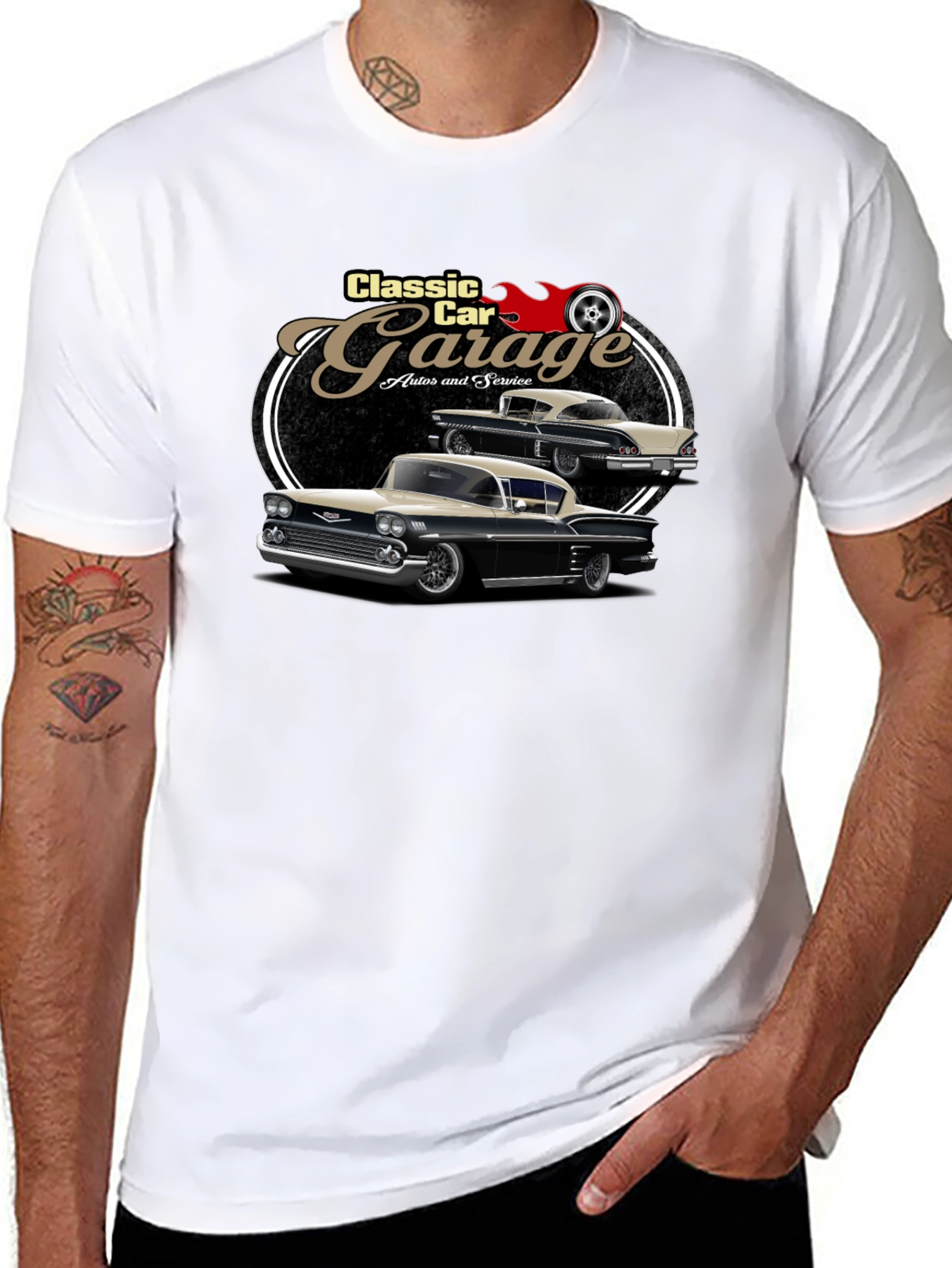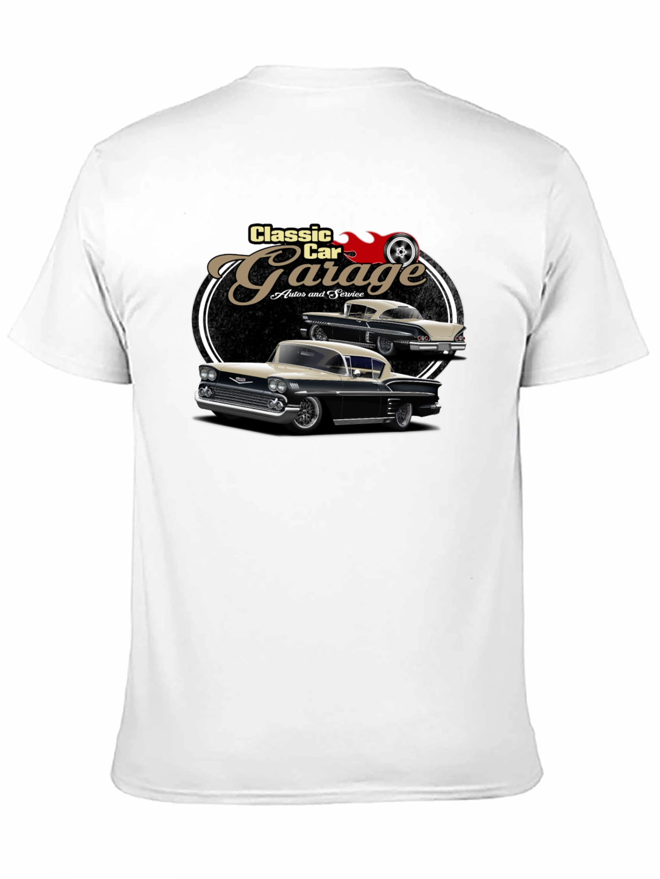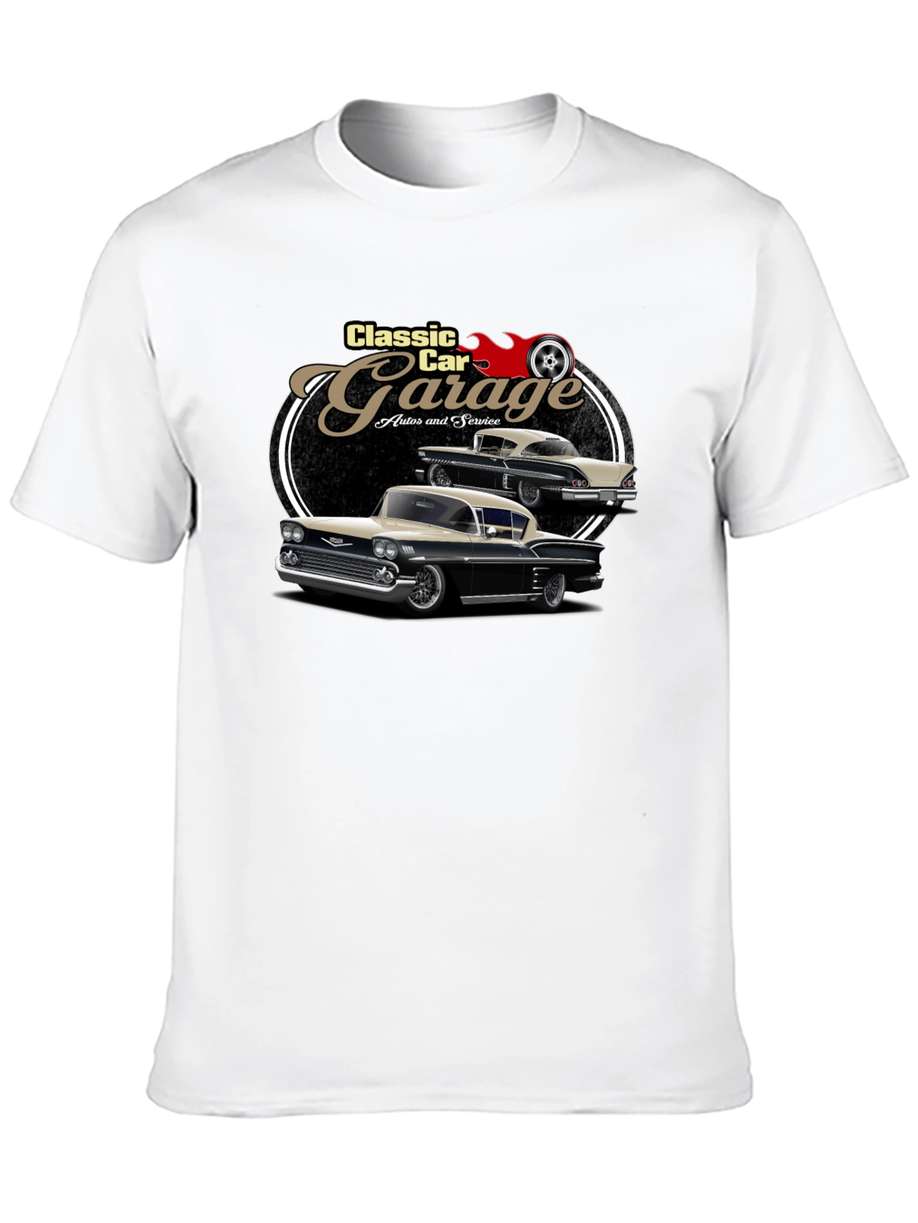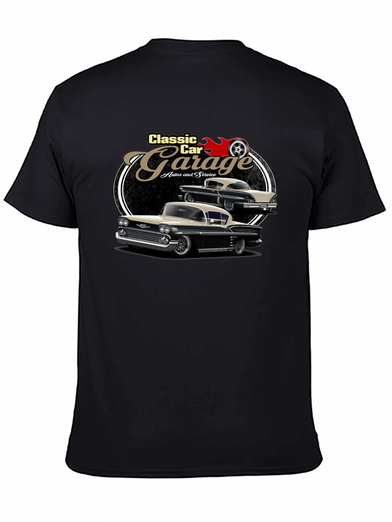 Show off your love for classic cars with this stylish black t-shirt. This comfortable tee features a vibrant graphic of vintage cars with the words 'Classic Car Garage Autos and Service' emblazoned across the front. The design includes detailed illustrations of iconic car models, perfect for any car enthusiast or vintage lover. Made with a soft and breathable fabric, it's ideal for casual wear, car shows, or garage work. Makes a great gift for anyone who appreciates automotive history and cool, retro designs. Get yours today!