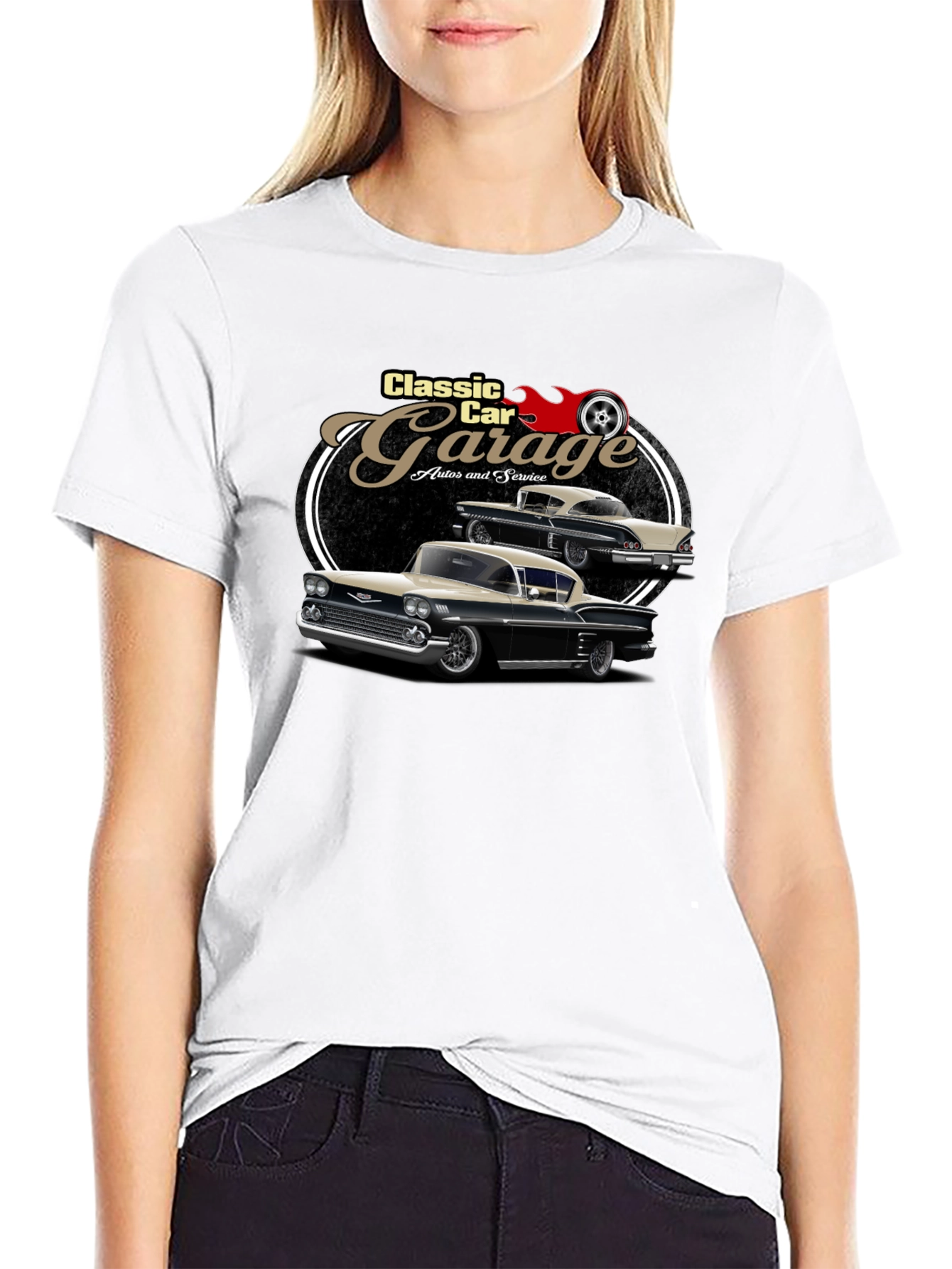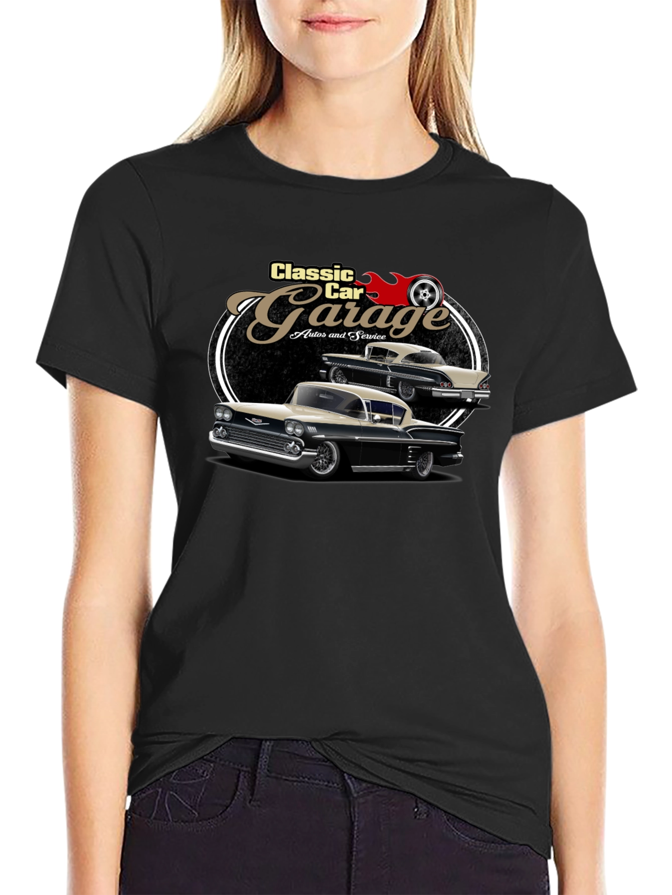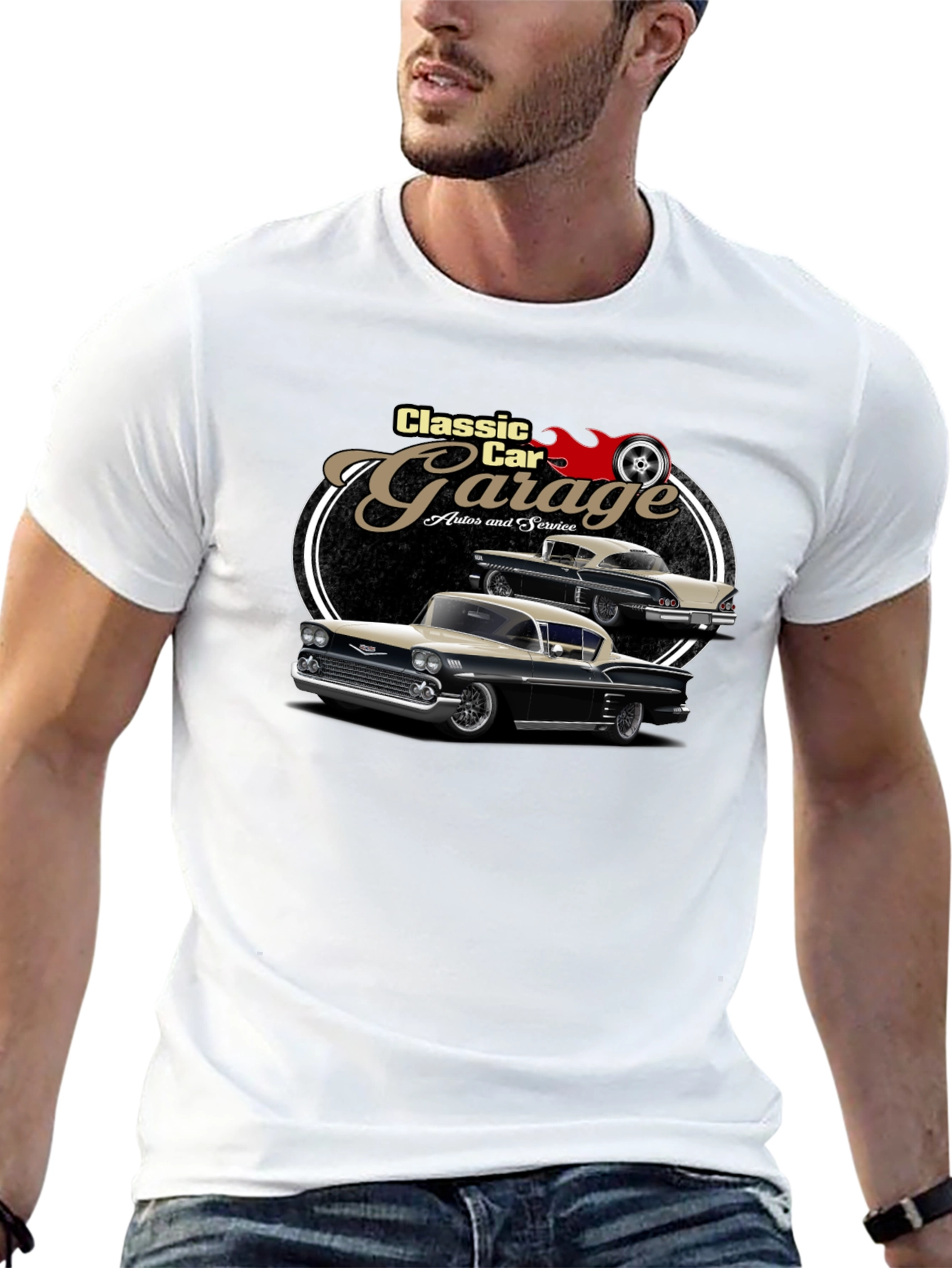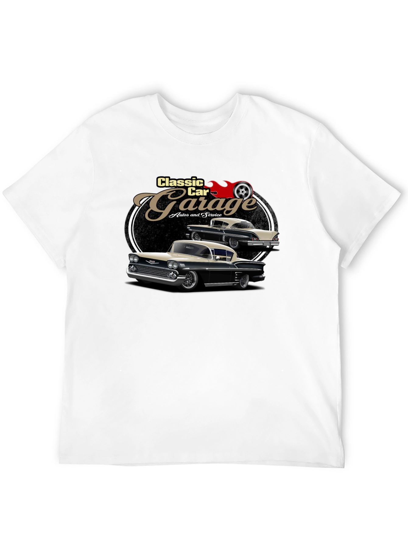 Show off your love for classic cars with this stylish black t-shirt. This comfortable tee features a vibrant graphic of vintage cars with the words 'Classic Car Garage Autos and Service' emblazoned across the front. The design includes detailed illustrations of iconic car models, perfect for any car enthusiast or vintage lover. Made with a soft and breathable fabric, it's ideal for casual wear, car shows, or garage work. Makes a great gift for anyone who appreciates automotive history and cool, retro designs. Get yours today!