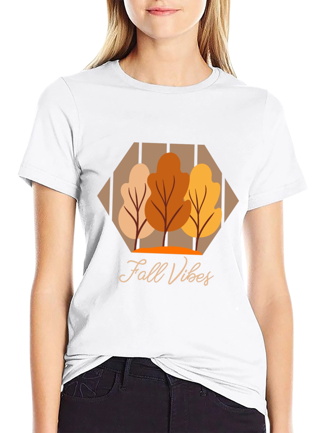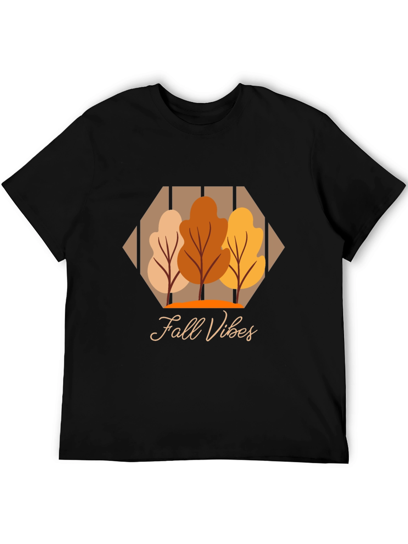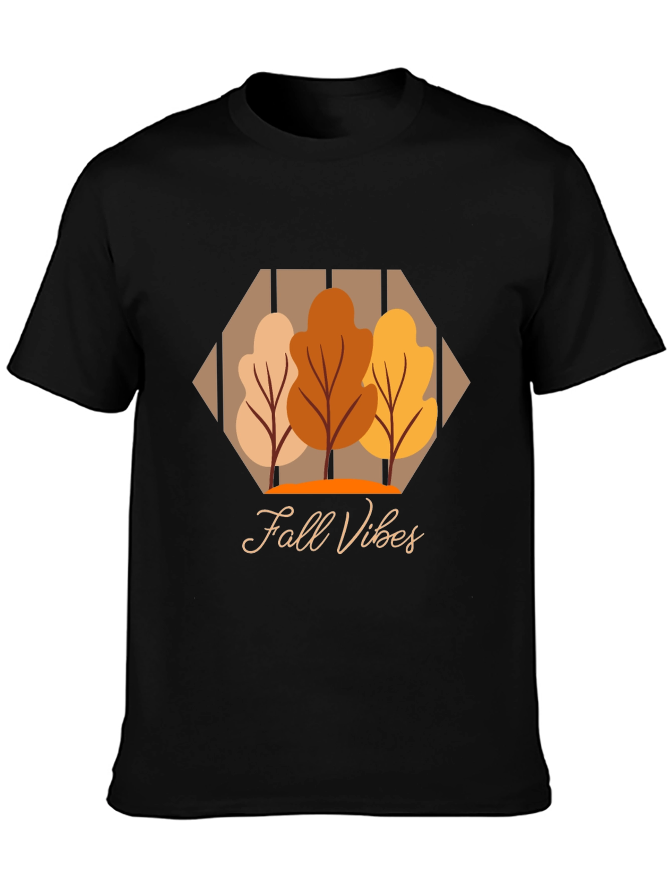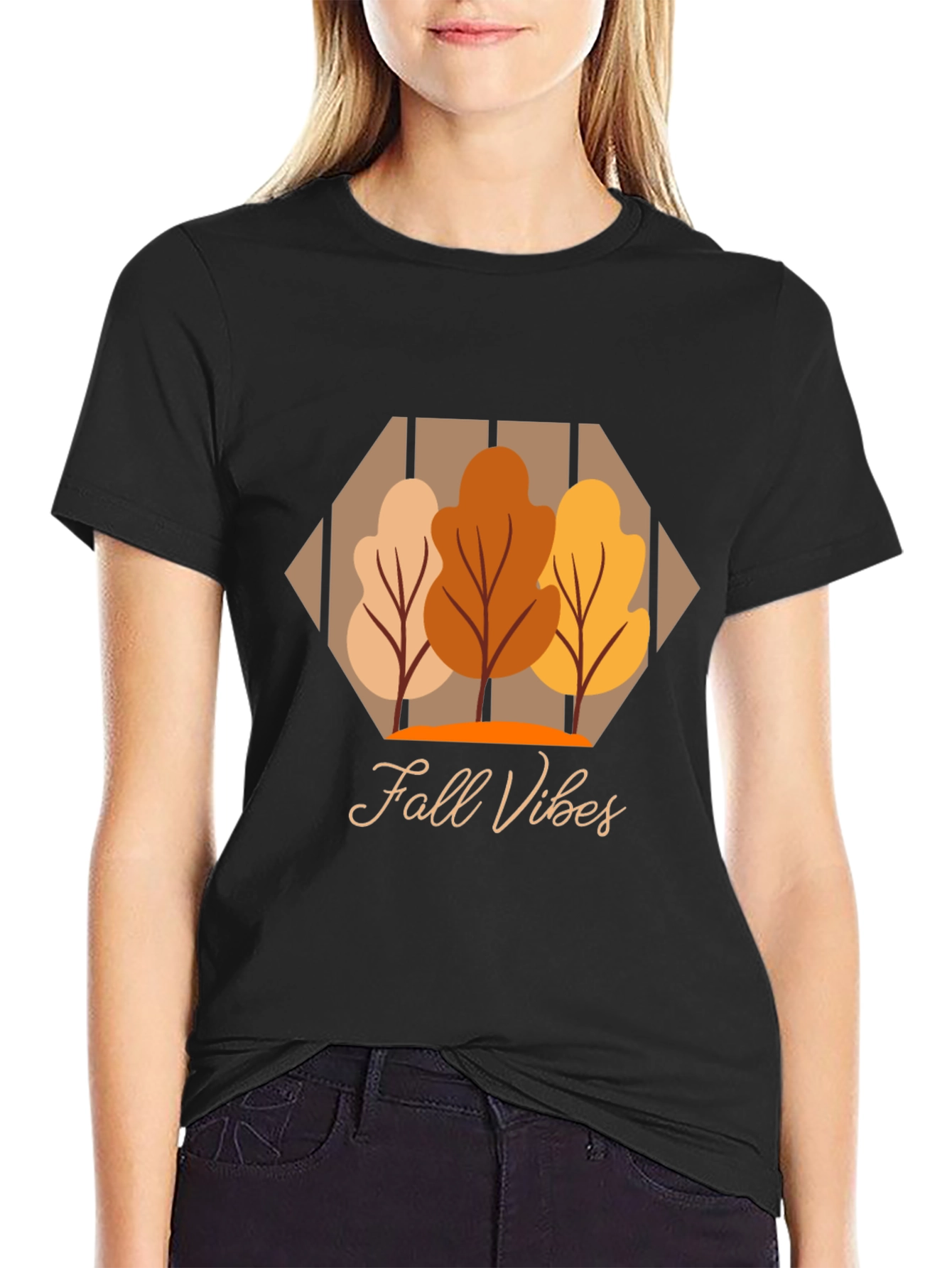Embrace the autumn season with this stylish black graphic t-shirt. The design features three distinct fall-colored trees, enclosed in a rustic, wooden-style hexagonal frame. Underneath, the words "Fall Vibes" are scripted in a warm, inviting font, adding a touch of seasonal charm. This tee is perfect for casual outings, fall festivals, or cozy nights in. Made from a comfortable-looking fabric, it's ideal for everyday wear. Show off your love for the fall season with this unique and fashionable t-shirt, a great addition to your wardrobe!