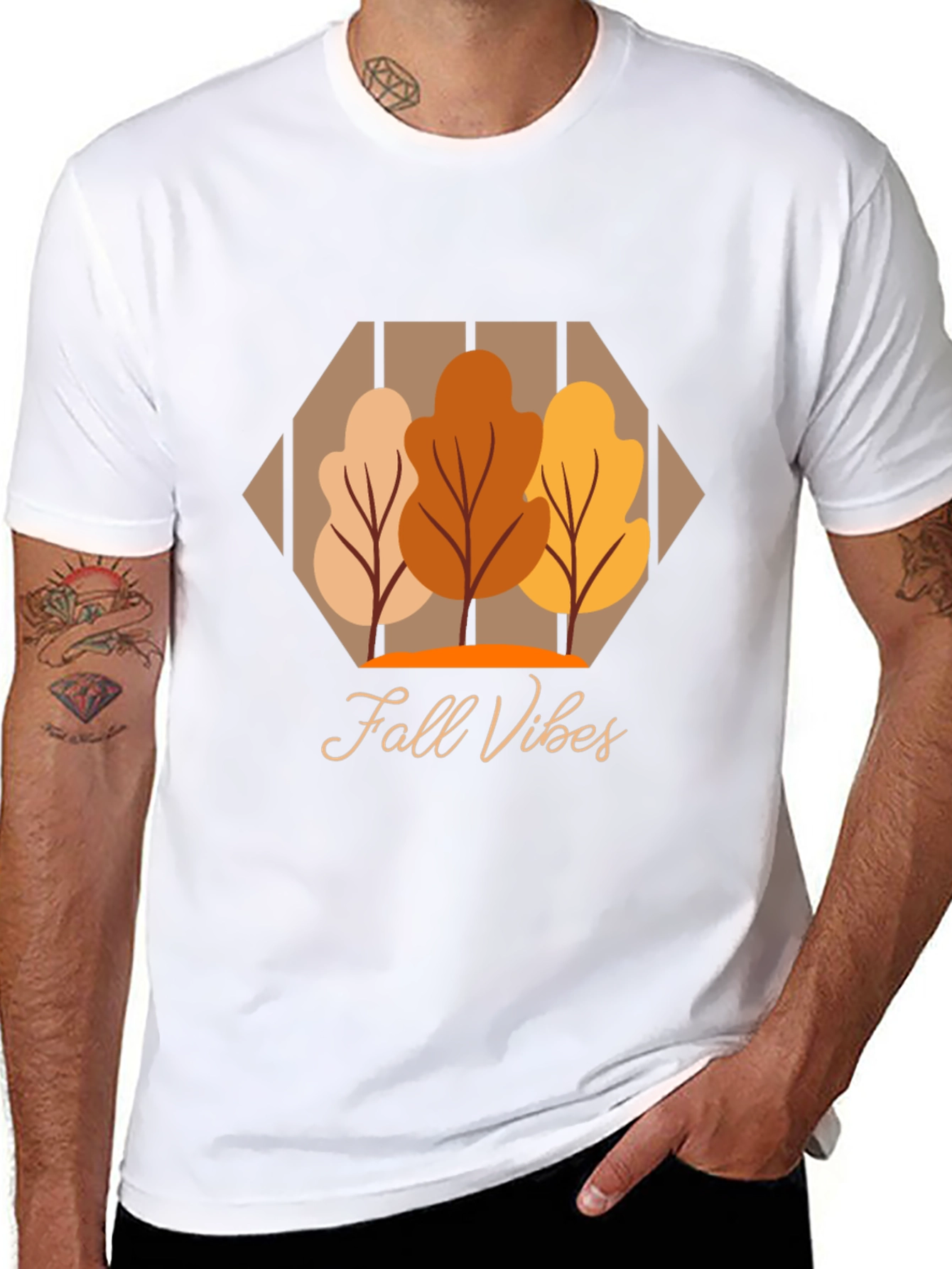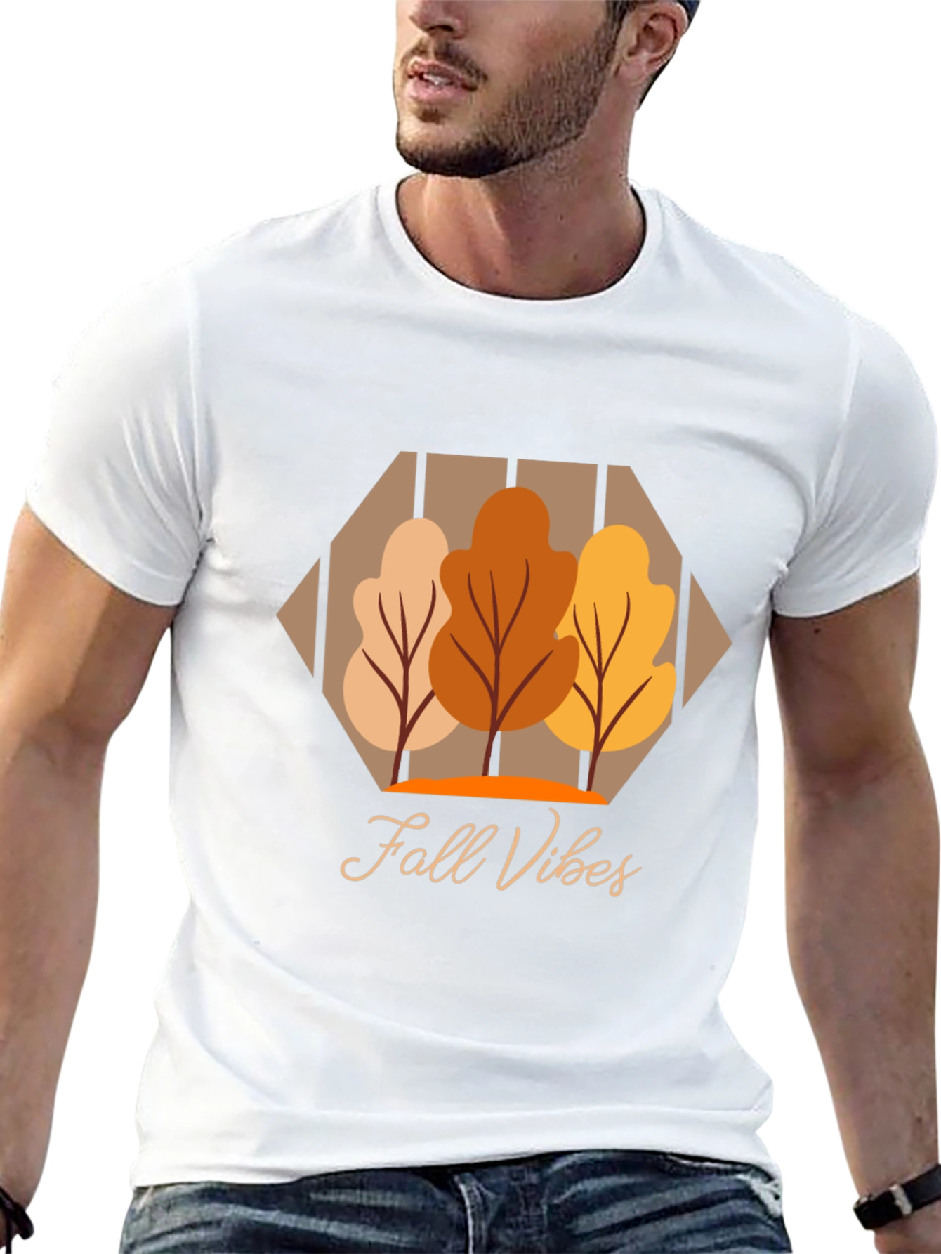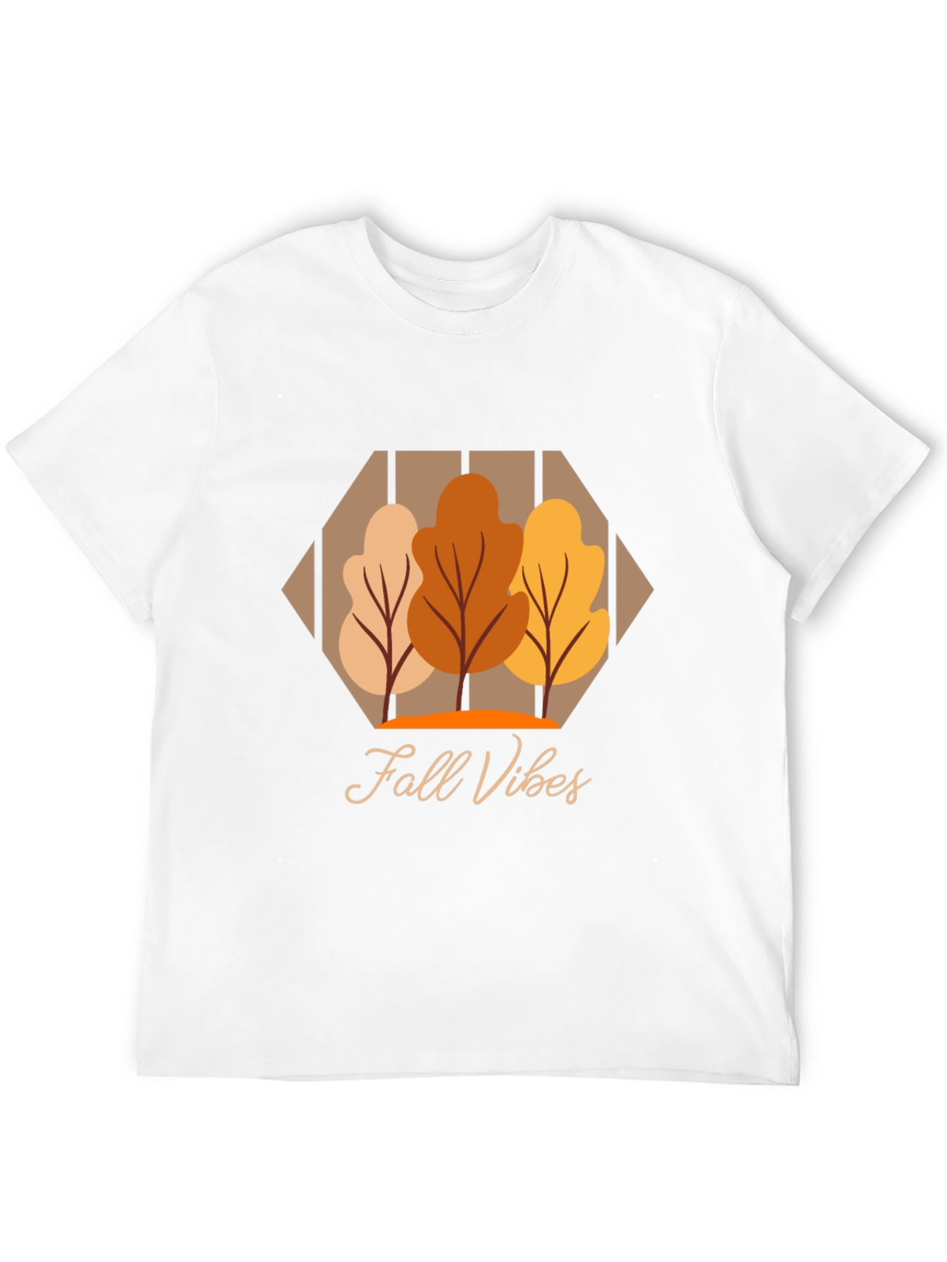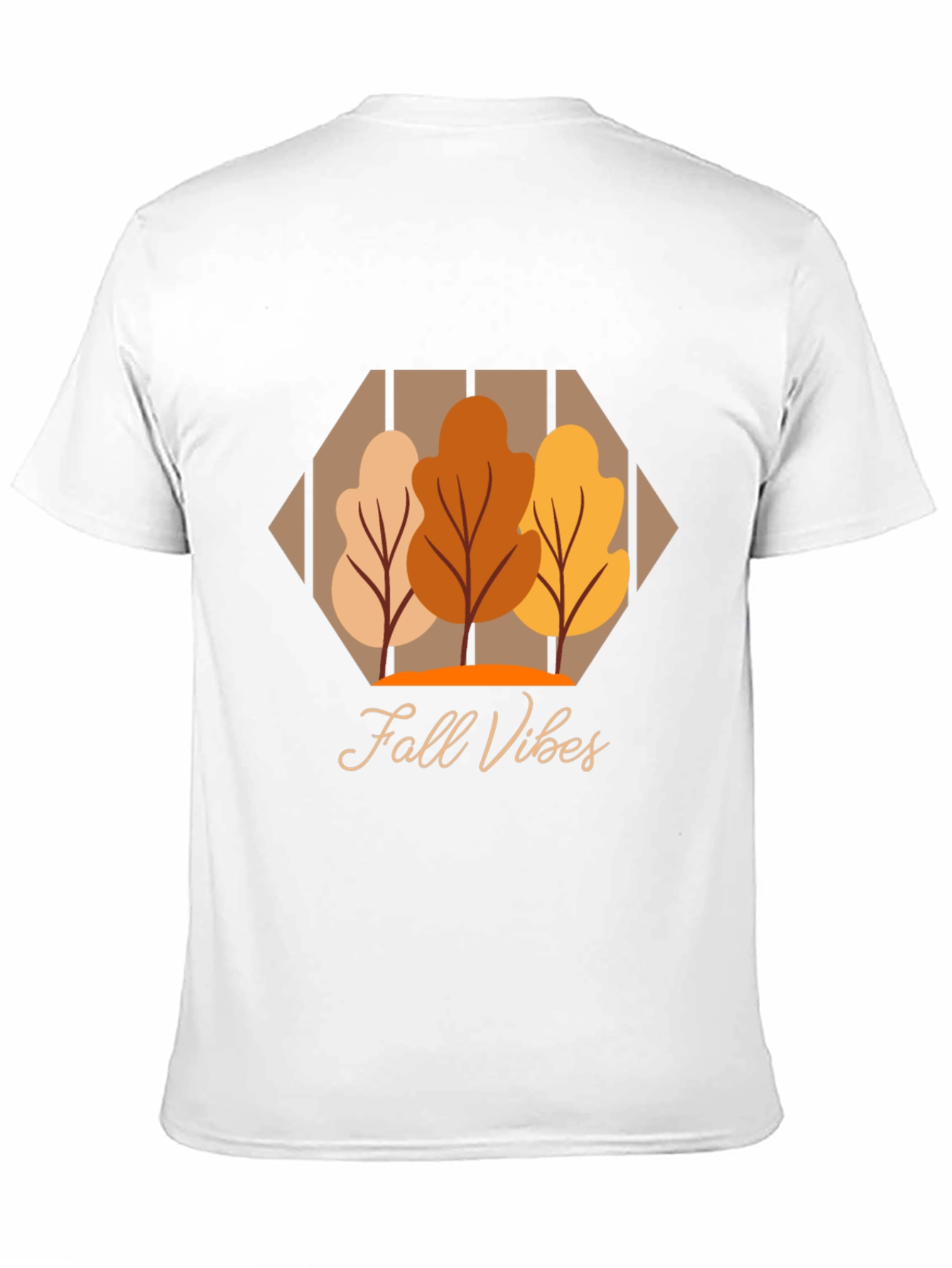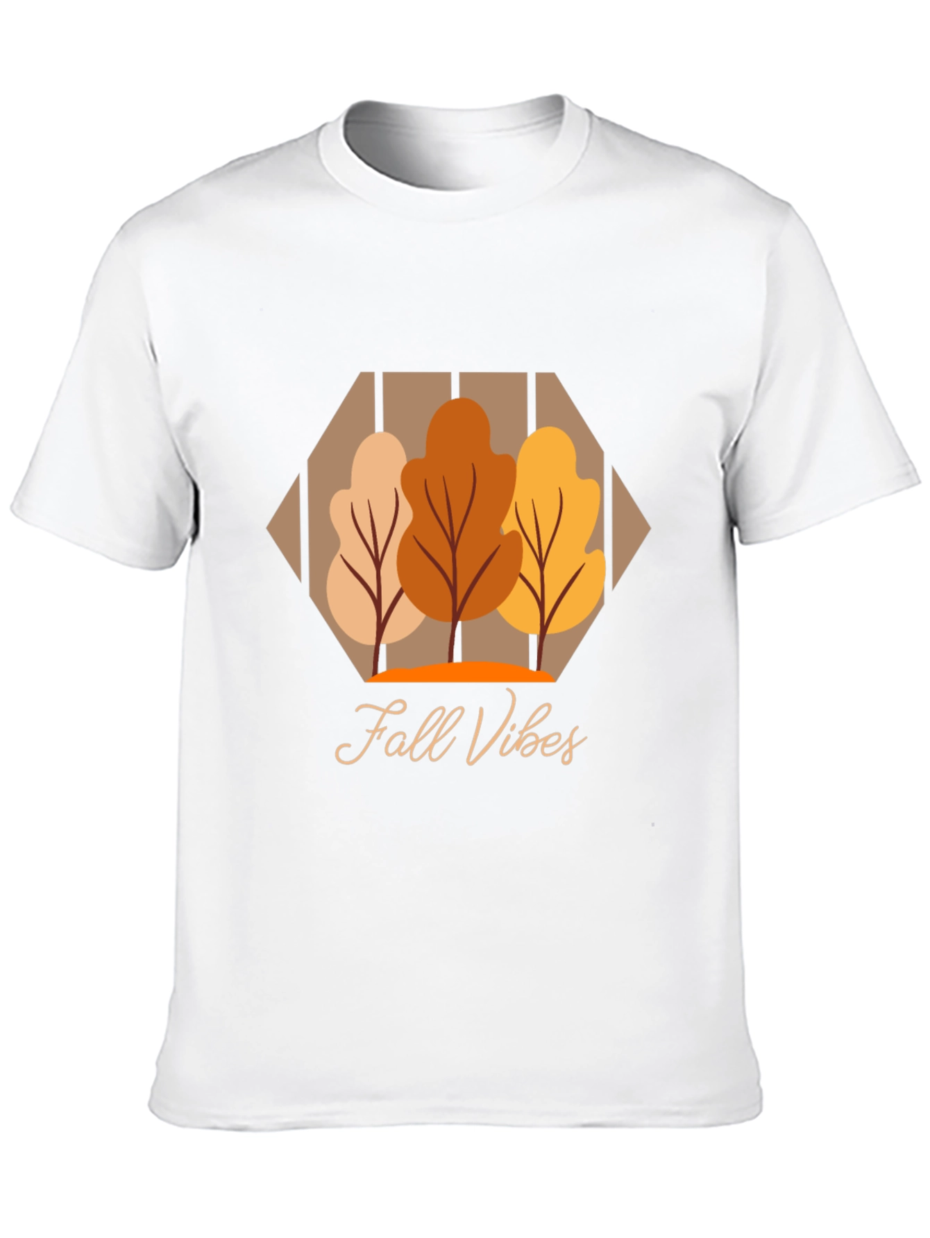 Embrace the autumn season with this stylish black graphic t-shirt. The design features three distinct fall-colored trees, enclosed in a rustic, wooden-style hexagonal frame. Underneath, the words "Fall Vibes" are scripted in a warm, inviting font, adding a touch of seasonal charm. This tee is perfect for casual outings, fall festivals, or cozy nights in. Made from a comfortable-looking fabric, it's ideal for everyday wear. Show off your love for the fall season with this unique and fashionable t-shirt, a great addition to your wardrobe!
