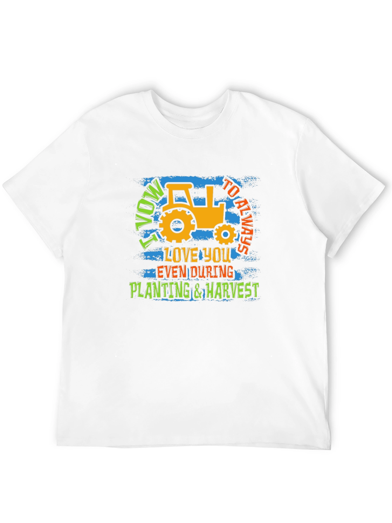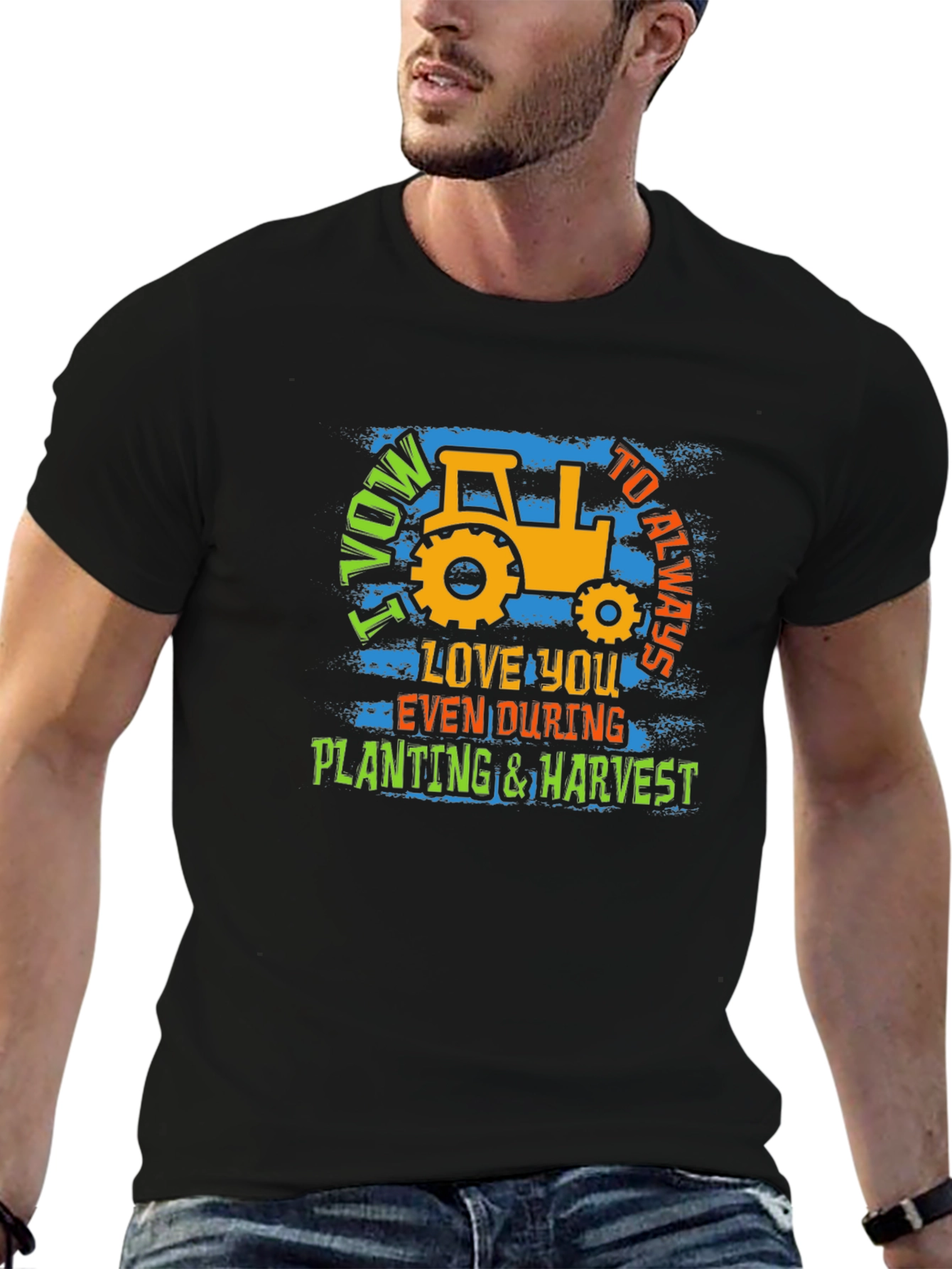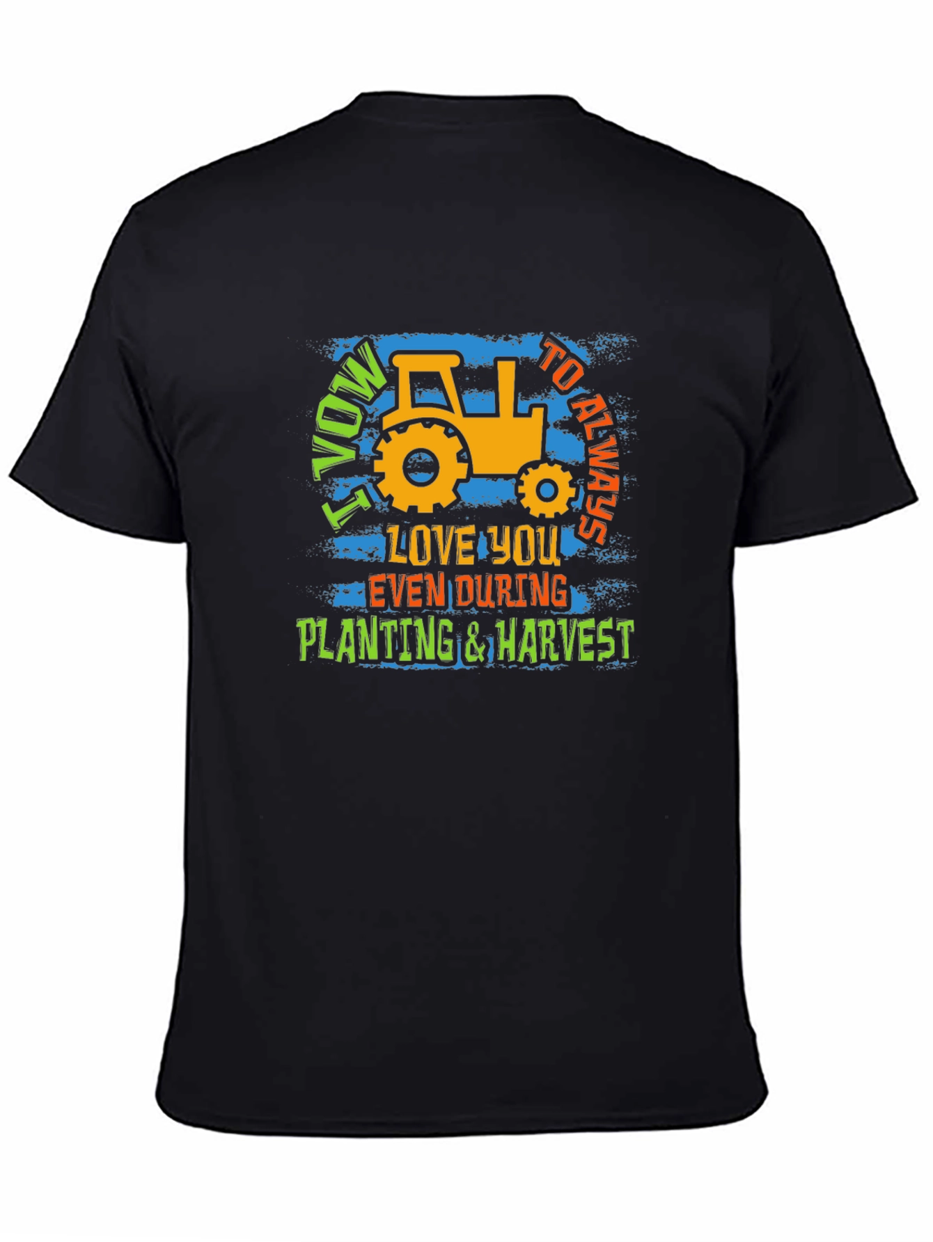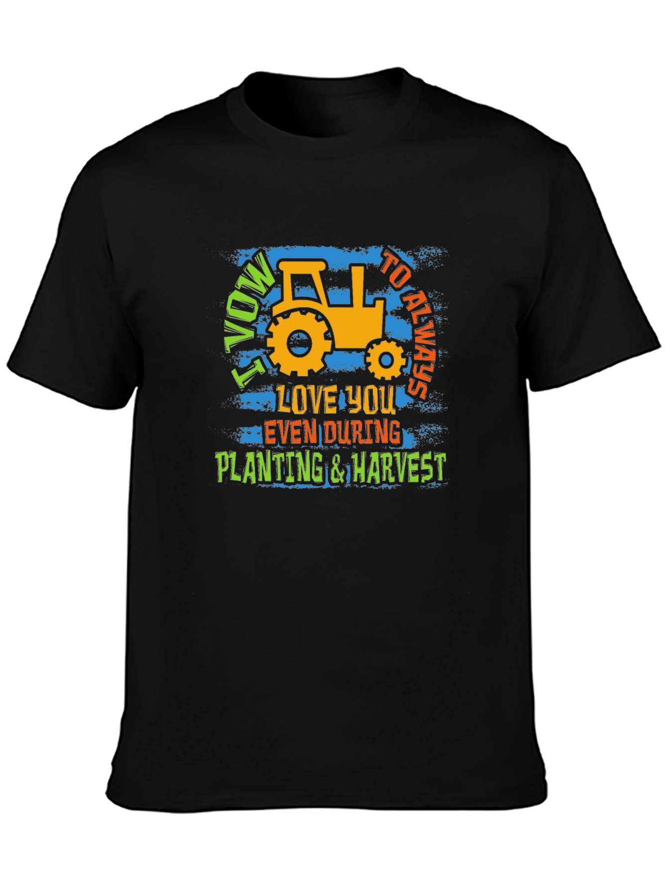 Show your love for farming and commitment with this unique graphic tee. The black shirt features a bold, eye-catching design with a vintage-style tractor, perfect for farmers and agriculture enthusiasts. It showcases the playful yet sincere message "I Vow to Always Love You Even During Planting & Harvest." Made from a soft, breathable fabric, this t-shirt is comfortable for all-day wear whether you're working in the field or relaxing at home. The vibrant colors and distressed texture add a touch of character, making it a standout piece in any casual wardrobe. Great as a gift for the dedicated farmer in your life.