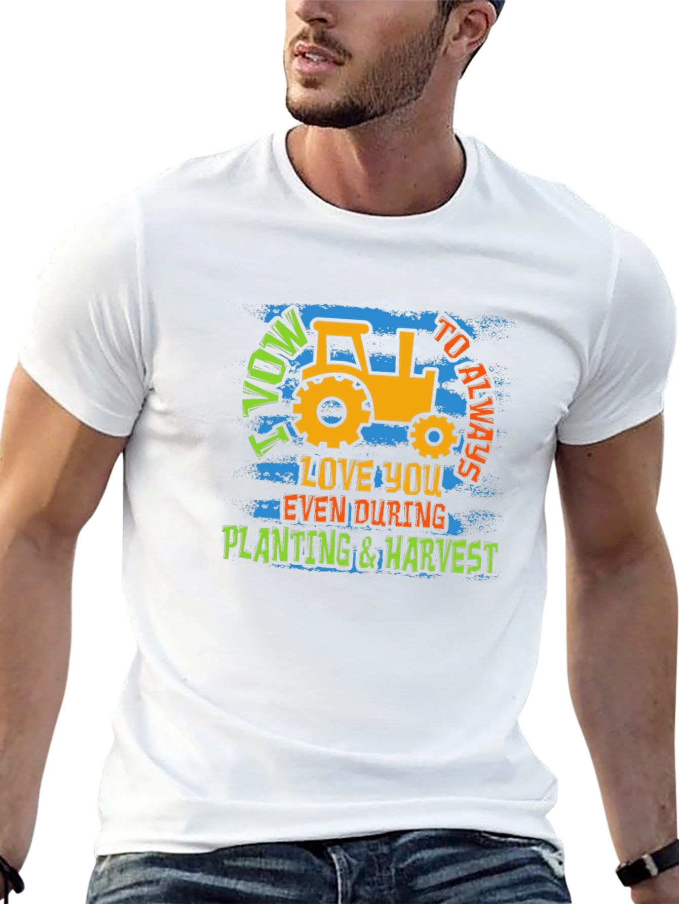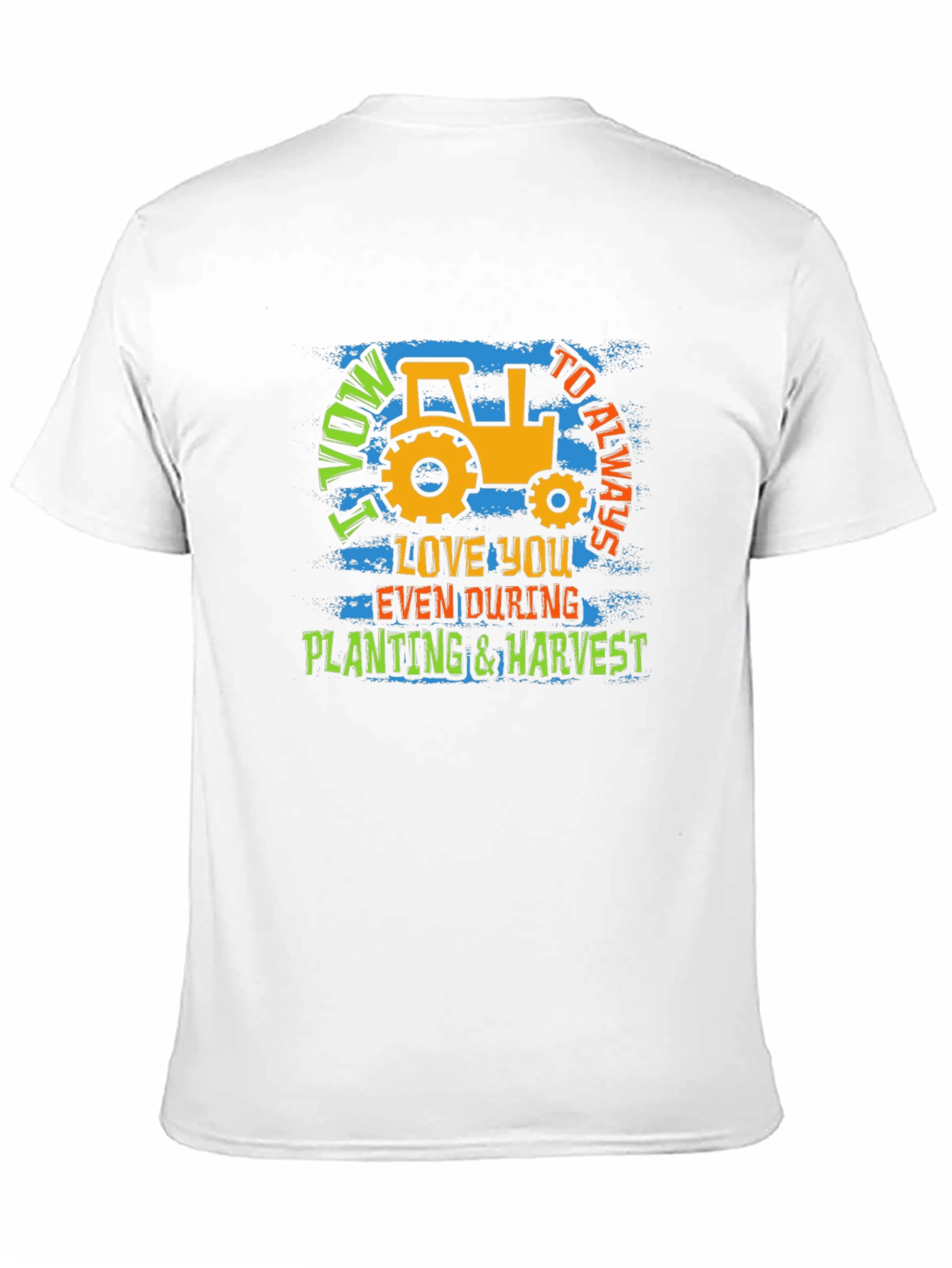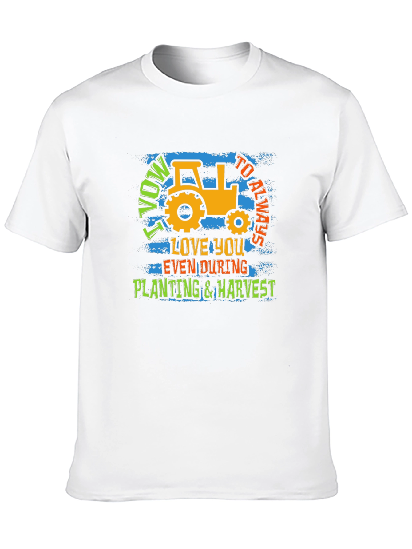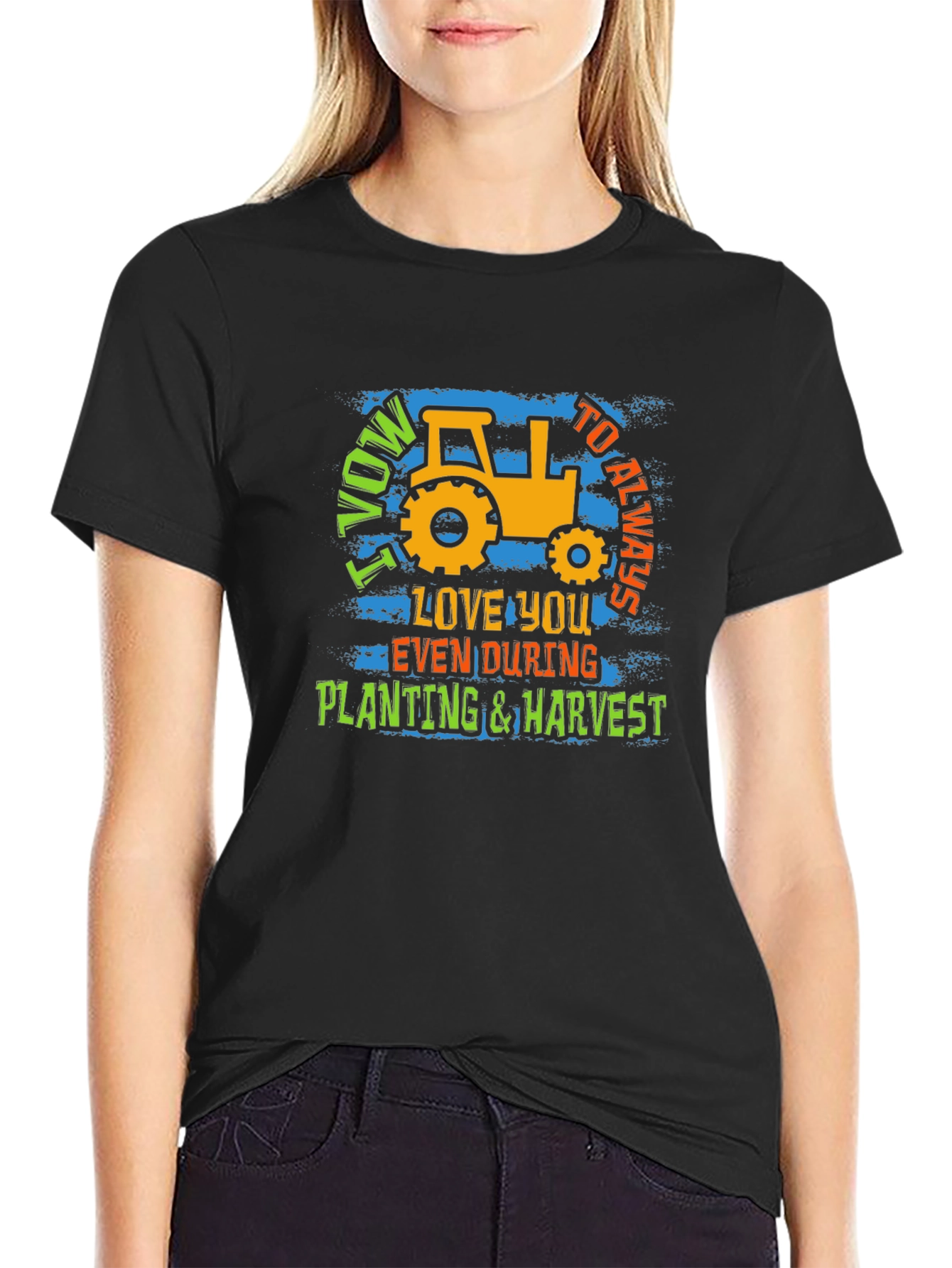 Show your love for farming and commitment with this unique graphic tee. The black shirt features a bold, eye-catching design with a vintage-style tractor, perfect for farmers and agriculture enthusiasts. It showcases the playful yet sincere message "I Vow to Always Love You Even During Planting & Harvest." Made from a soft, breathable fabric, this t-shirt is comfortable for all-day wear whether you're working in the field or relaxing at home. The vibrant colors and distressed texture add a touch of character, making it a standout piece in any casual wardrobe. Great as a gift for the dedicated farmer in your life.