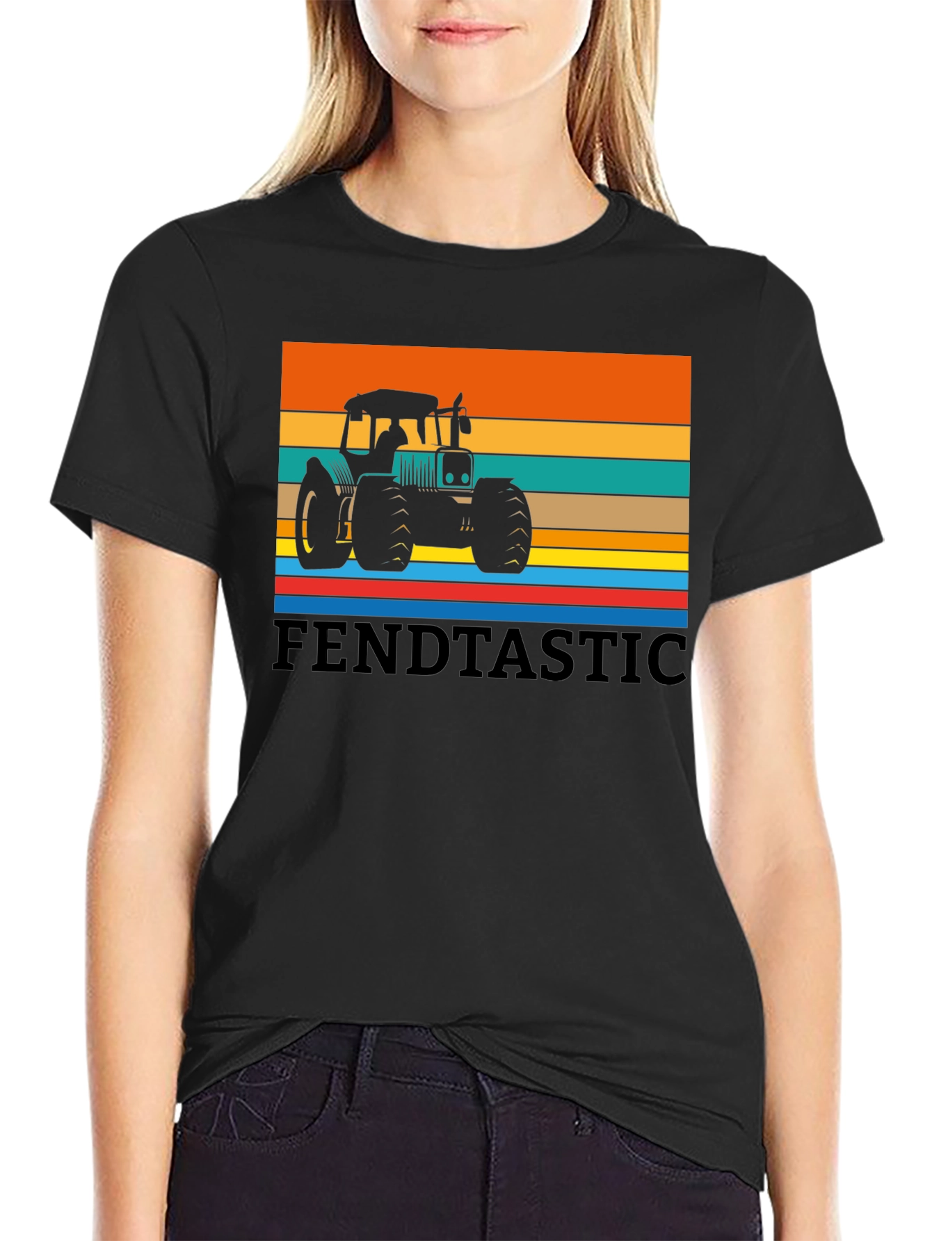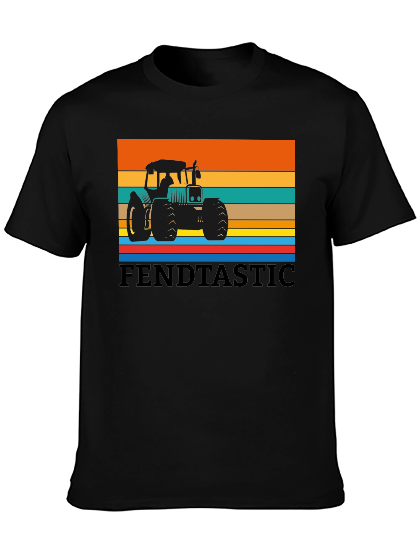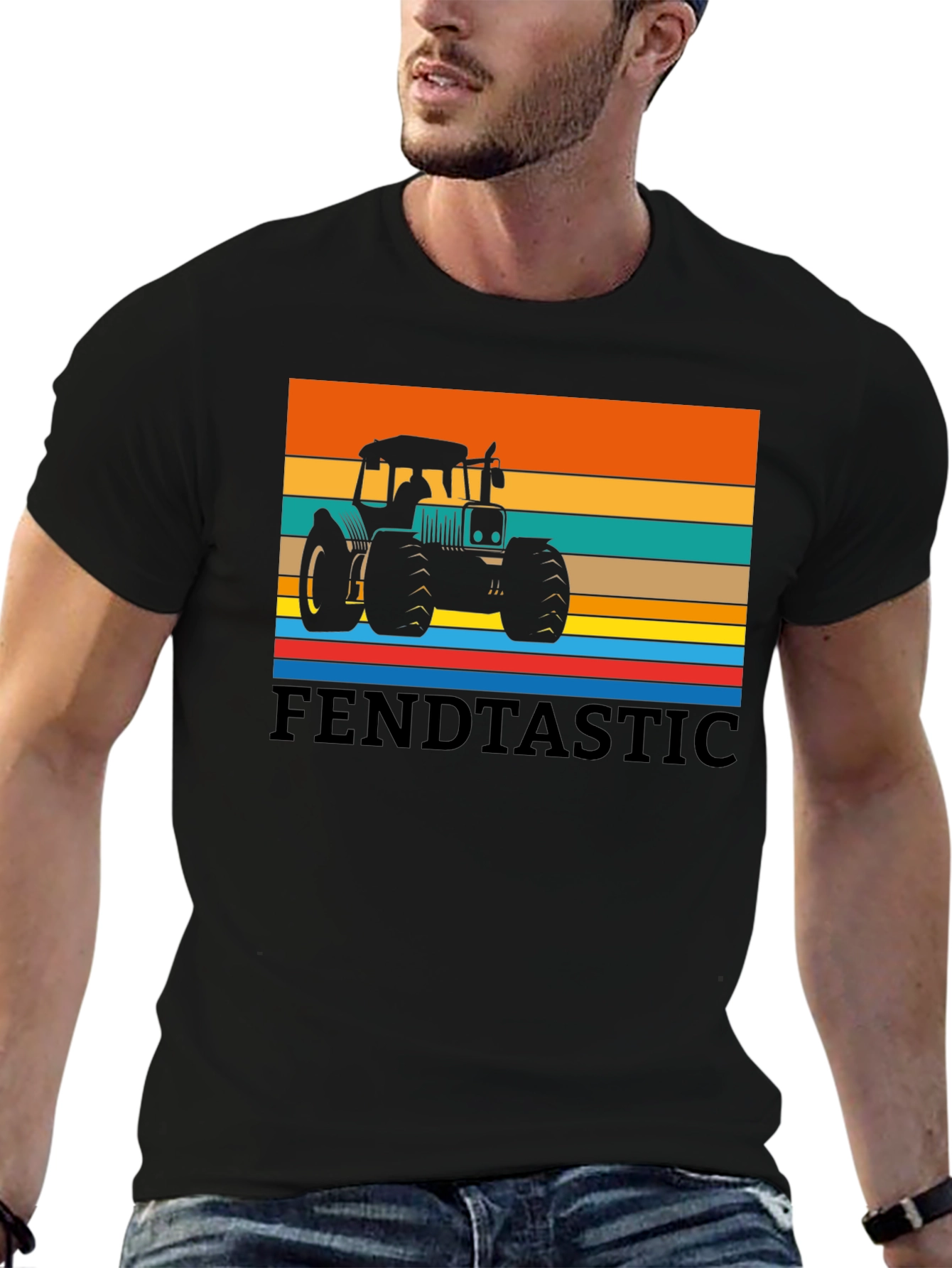 Show off your love for tractors with this stylish "Fendtastic" t-shirt! The black tee features a bold graphic of a blue tractor set against a retro striped background of orange, yellow, and brown hues. The graphic design extends vertically on the tee for a clean look. Made from a soft and comfortable fabric, this shirt is perfect for casual wear, farming events, or just lounging around. A great gift for farmers, tractor enthusiasts, and anyone who appreciates vintage designs.