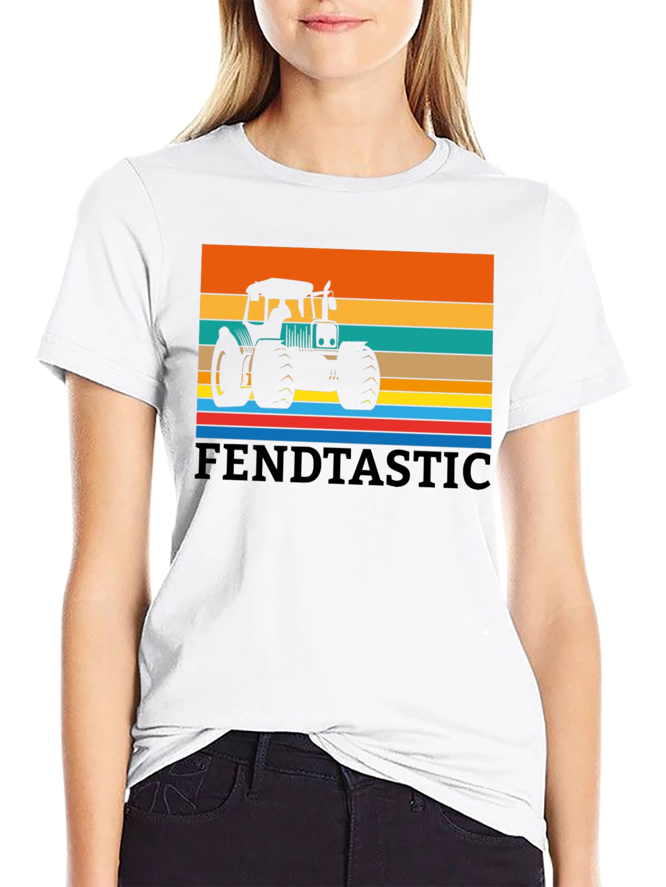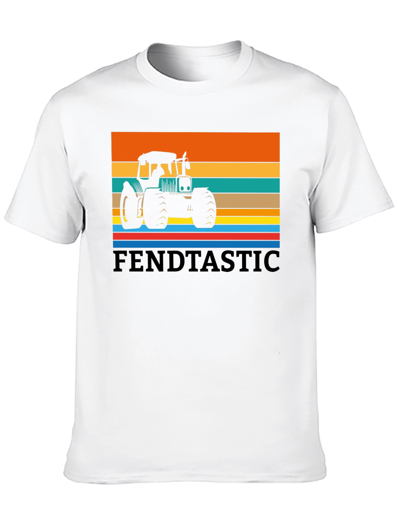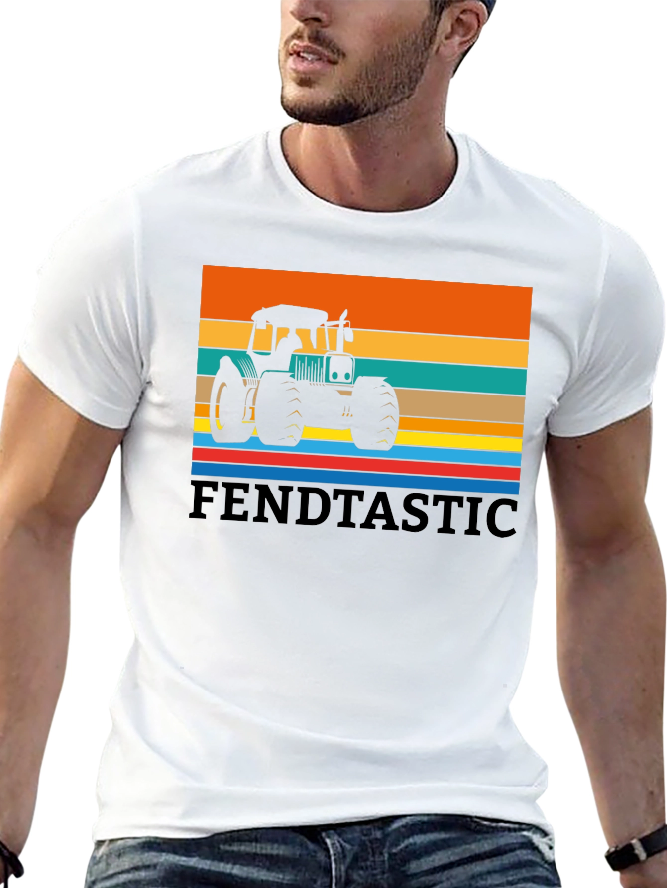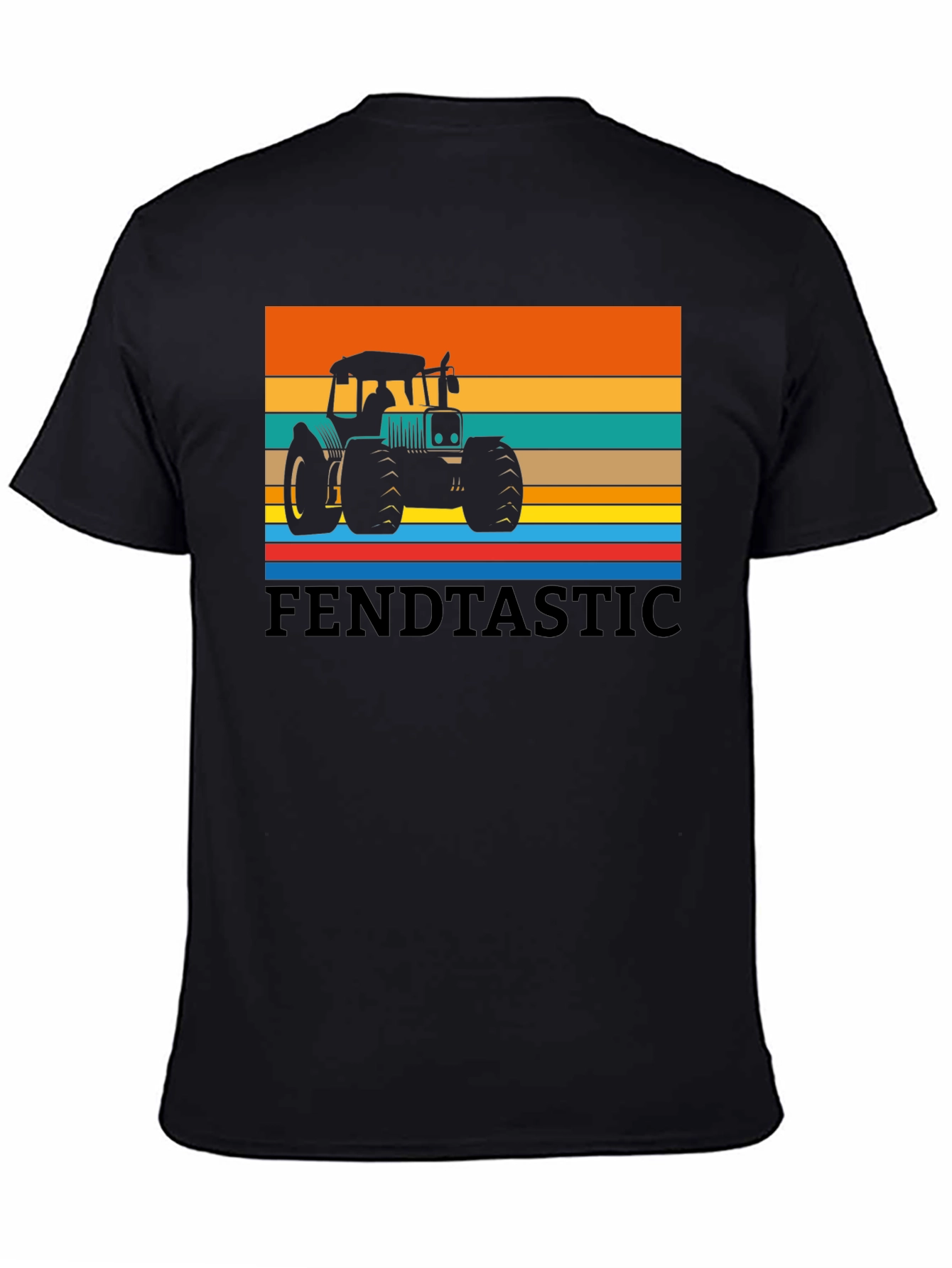 Show off your love for tractors with this stylish "Fendtastic" t-shirt! The black tee features a bold graphic of a blue tractor set against a retro striped background of orange, yellow, and brown hues. The graphic design extends vertically on the tee for a clean look. Made from a soft and comfortable fabric, this shirt is perfect for casual wear, farming events, or just lounging around. A great gift for farmers, tractor enthusiasts, and anyone who appreciates vintage designs.
