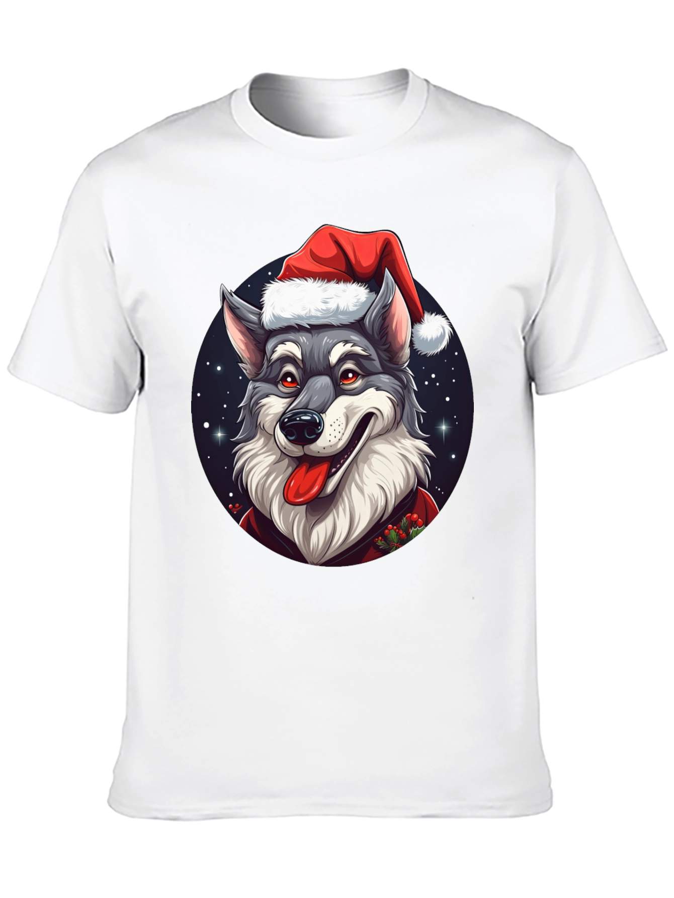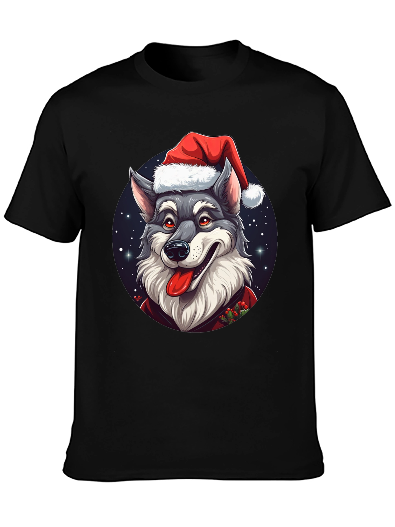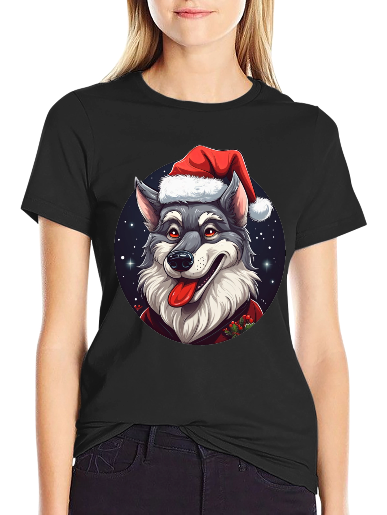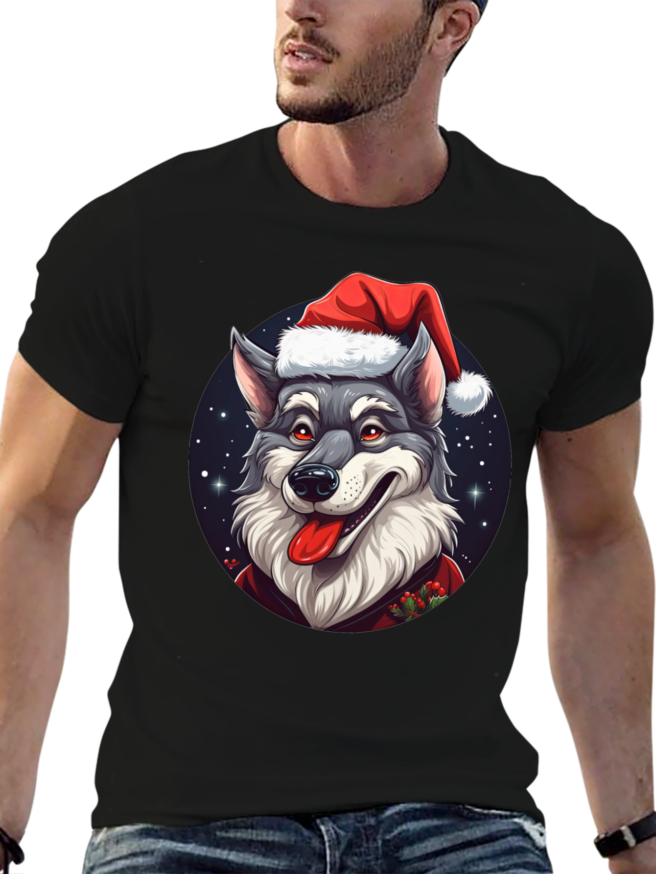 Spread some holiday joy with this unique t-shirt! The black tee features a charming cartoon wolf wearing a Santa hat, set against a starry backdrop. The wolf is adorned with a red coat and holly sprigs. Made from a soft, comfortable fabric, this shirt is perfect for casual wear during the Christmas season or as a fun gift for animal lovers. Stand out at your next holiday gathering with this playful and eye-catching design. Get yours today and bring some festive spirit to your wardrobe!