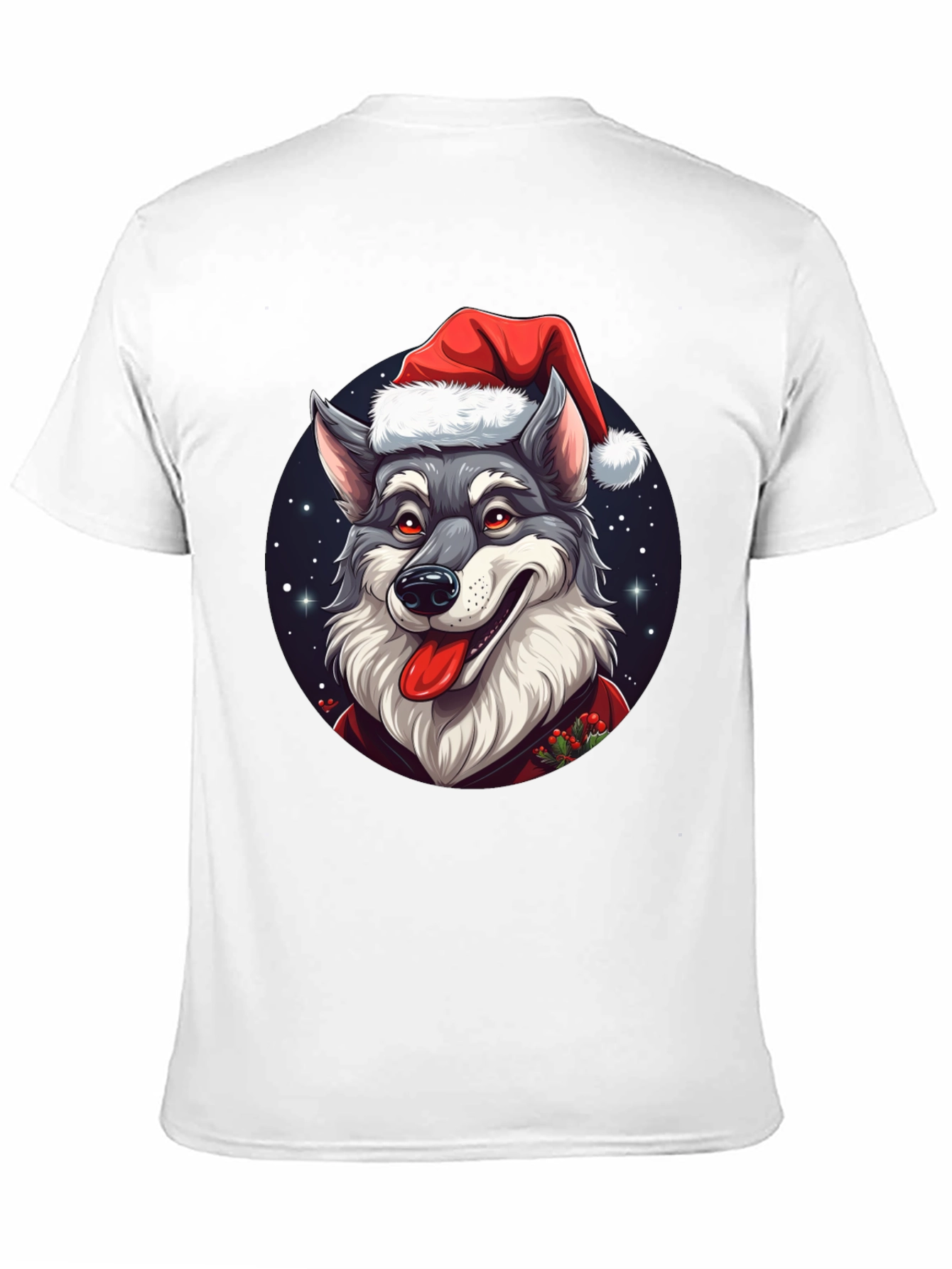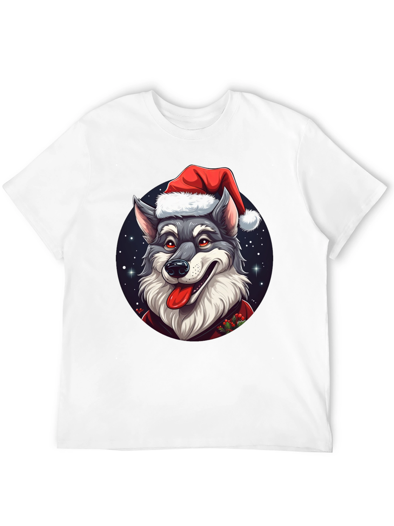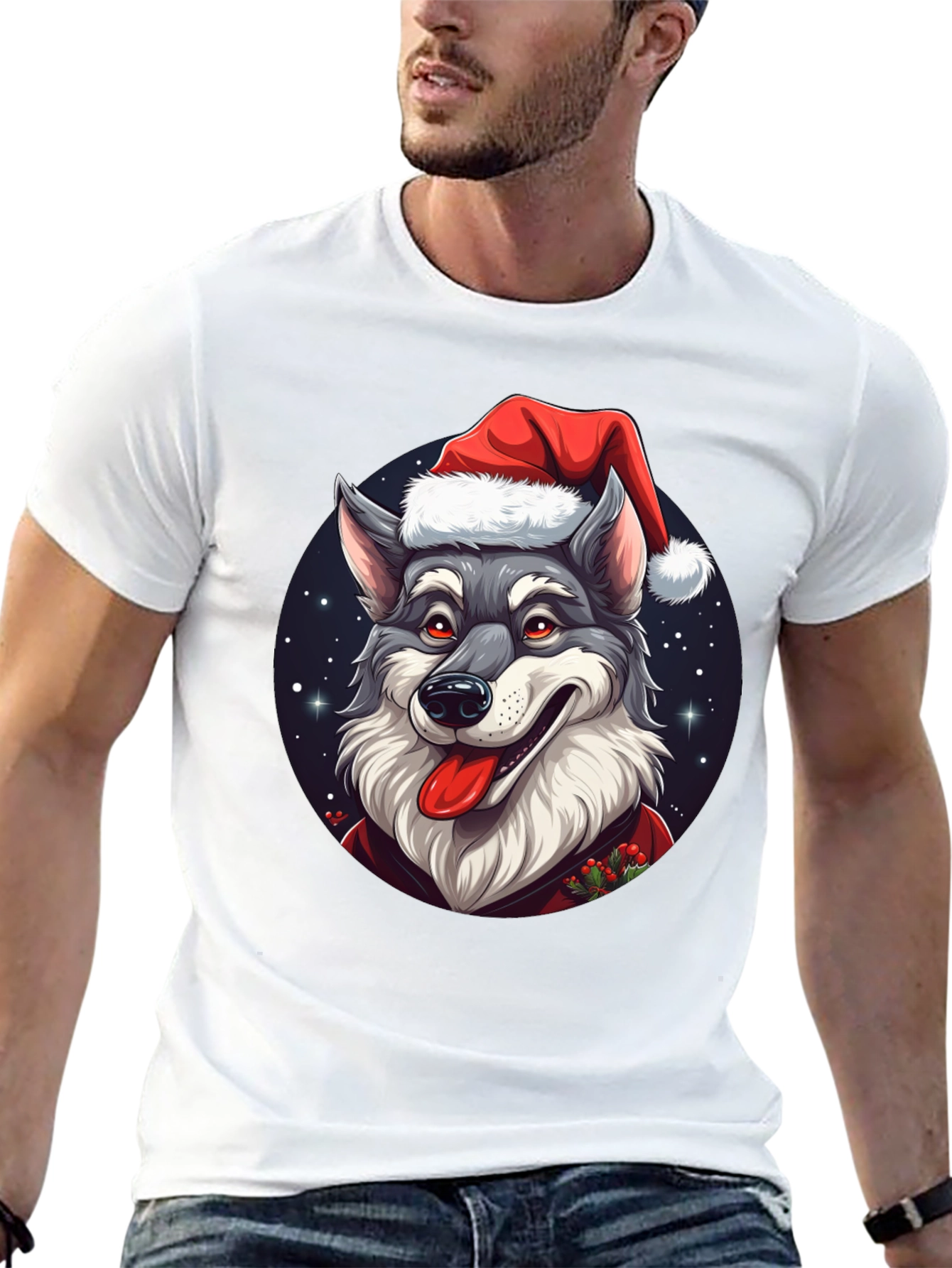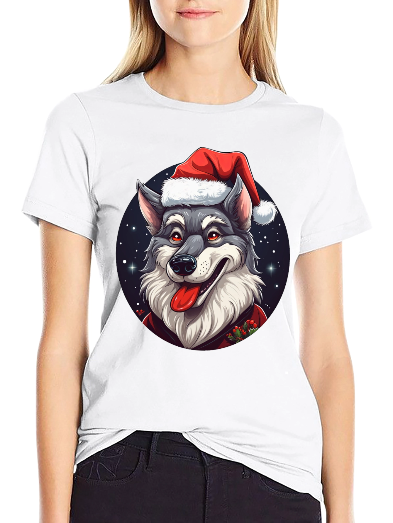 Spread some holiday joy with this unique t-shirt! The black tee features a charming cartoon wolf wearing a Santa hat, set against a starry backdrop. The wolf is adorned with a red coat and holly sprigs. Made from a soft, comfortable fabric, this shirt is perfect for casual wear during the Christmas season or as a fun gift for animal lovers. Stand out at your next holiday gathering with this playful and eye-catching design. Get yours today and bring some festive spirit to your wardrobe!