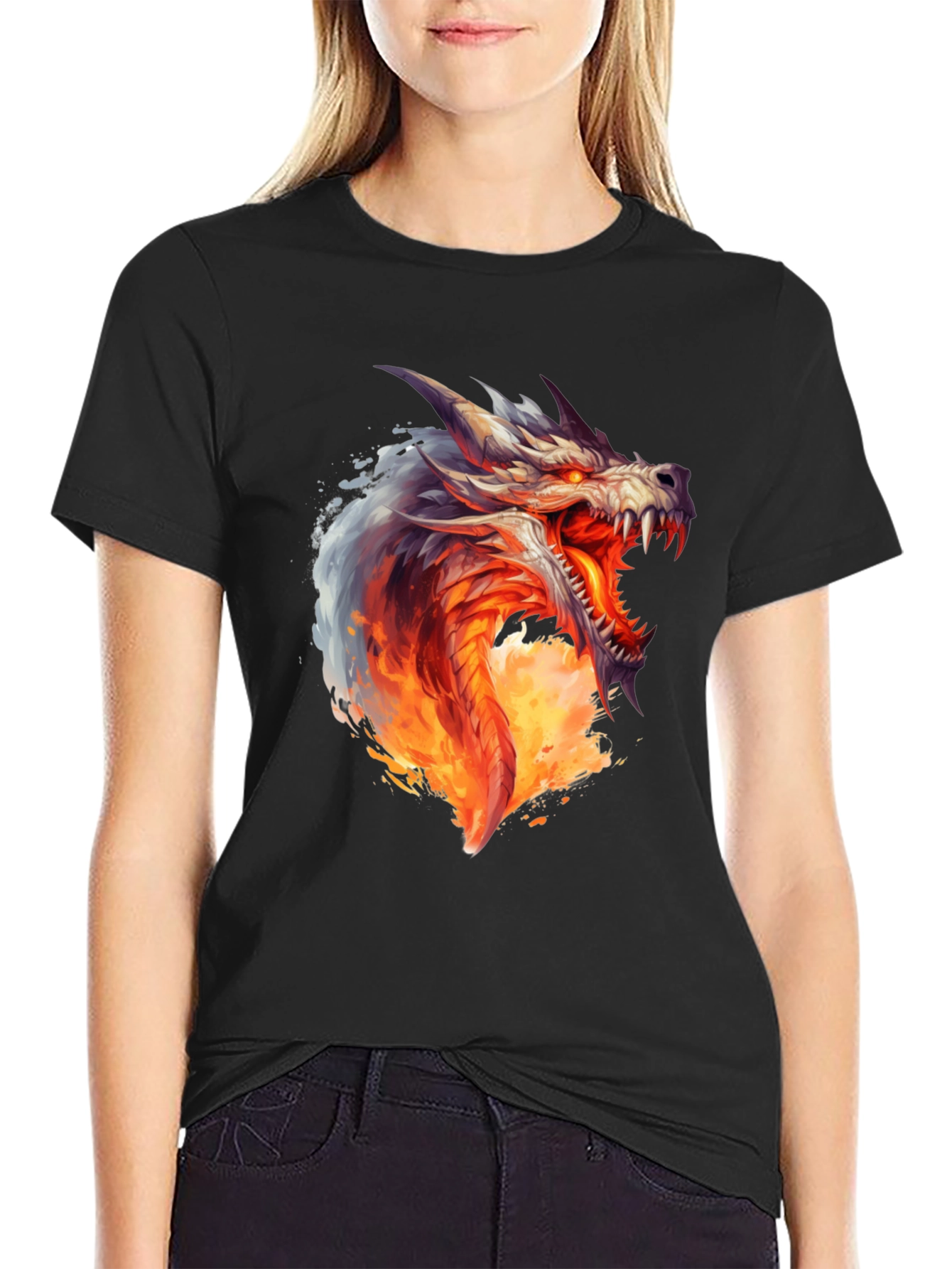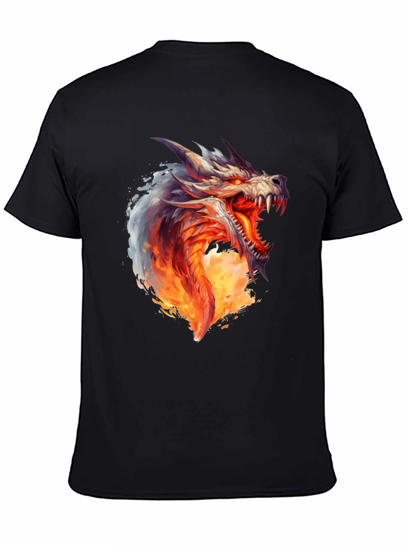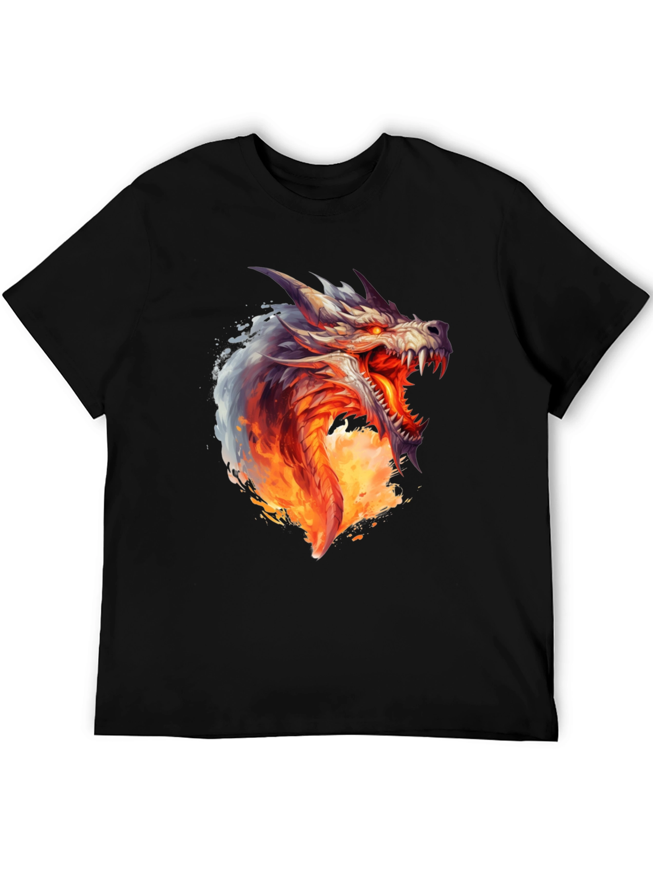 Unleash your inner fire with this bold black t-shirt featuring a stunning dragon graphic. The design showcases a white and fiery red dragon head with piercing eyes, exuding power and mystique. The detailed print stands out vividly against the classic black backdrop, making a strong statement. Crafted from what appears to be a soft and comfortable fabric, this tee offers a relaxed fit for everyday wear. Perfect for casual outings, concerts, or expressing your unique style, this dragon t-shirt is a must-have for fantasy enthusiasts and anyone looking to add an edgy flair to their wardrobe. Make a statement and ignite your style with this eye-catching design.