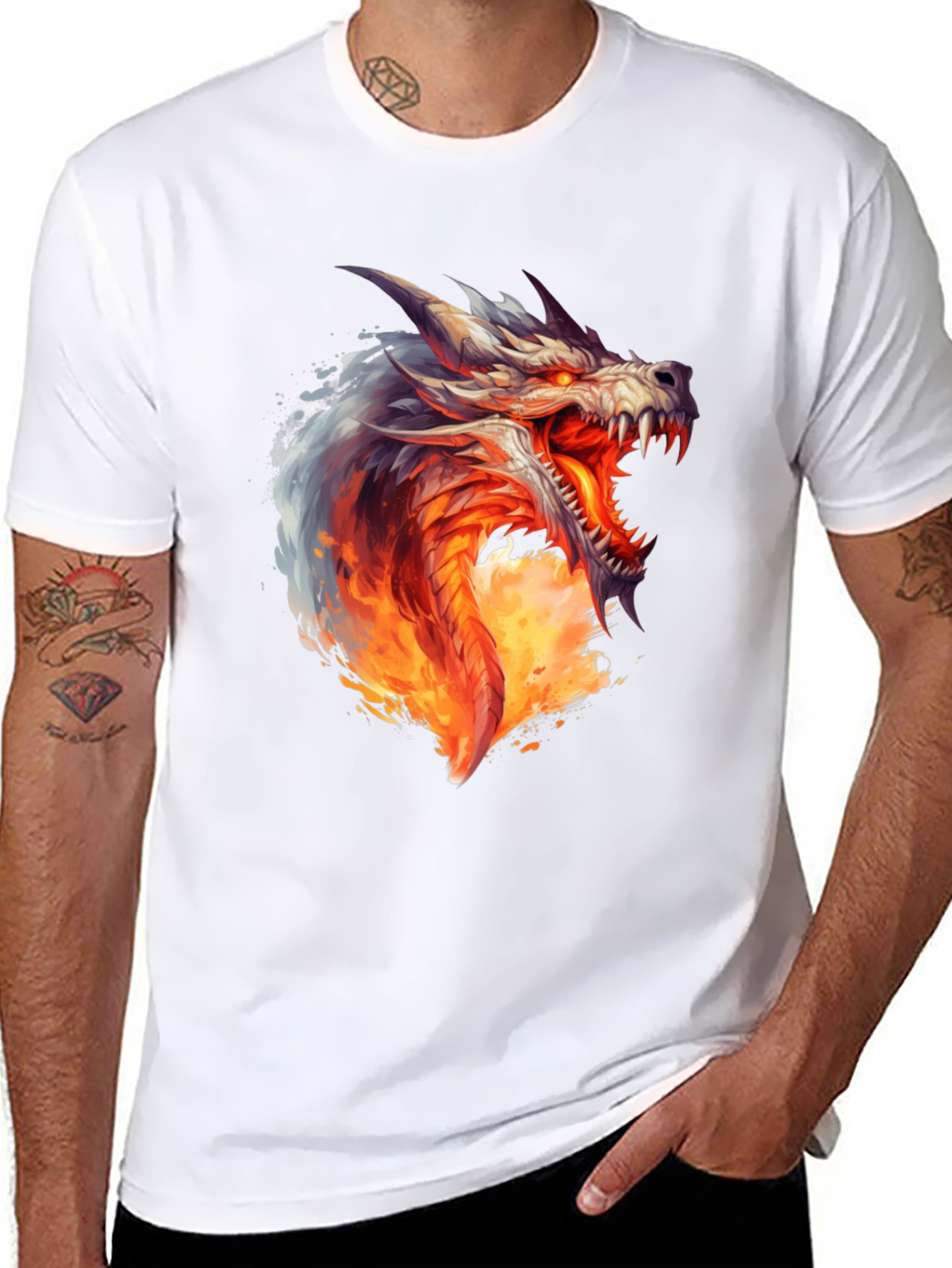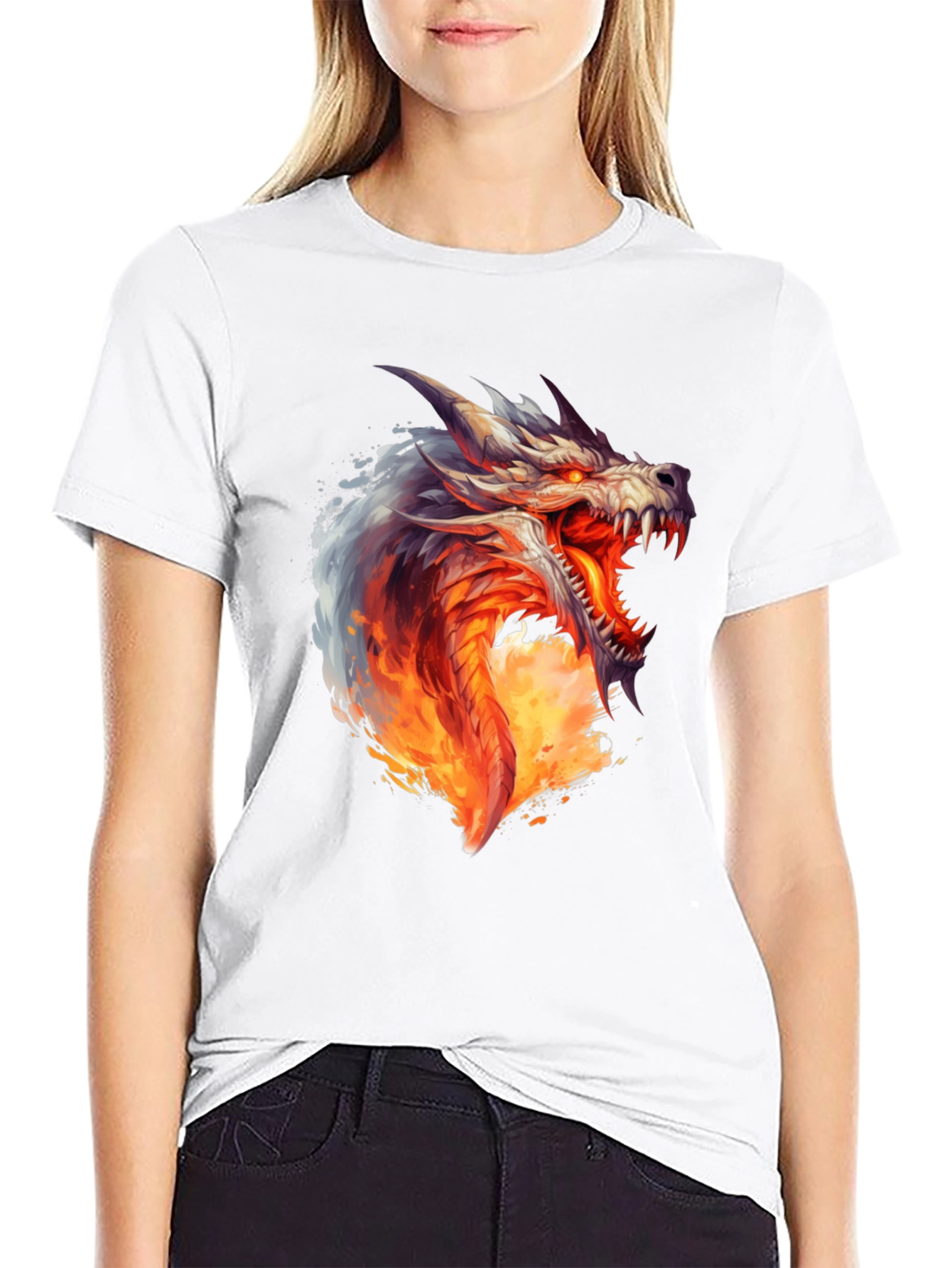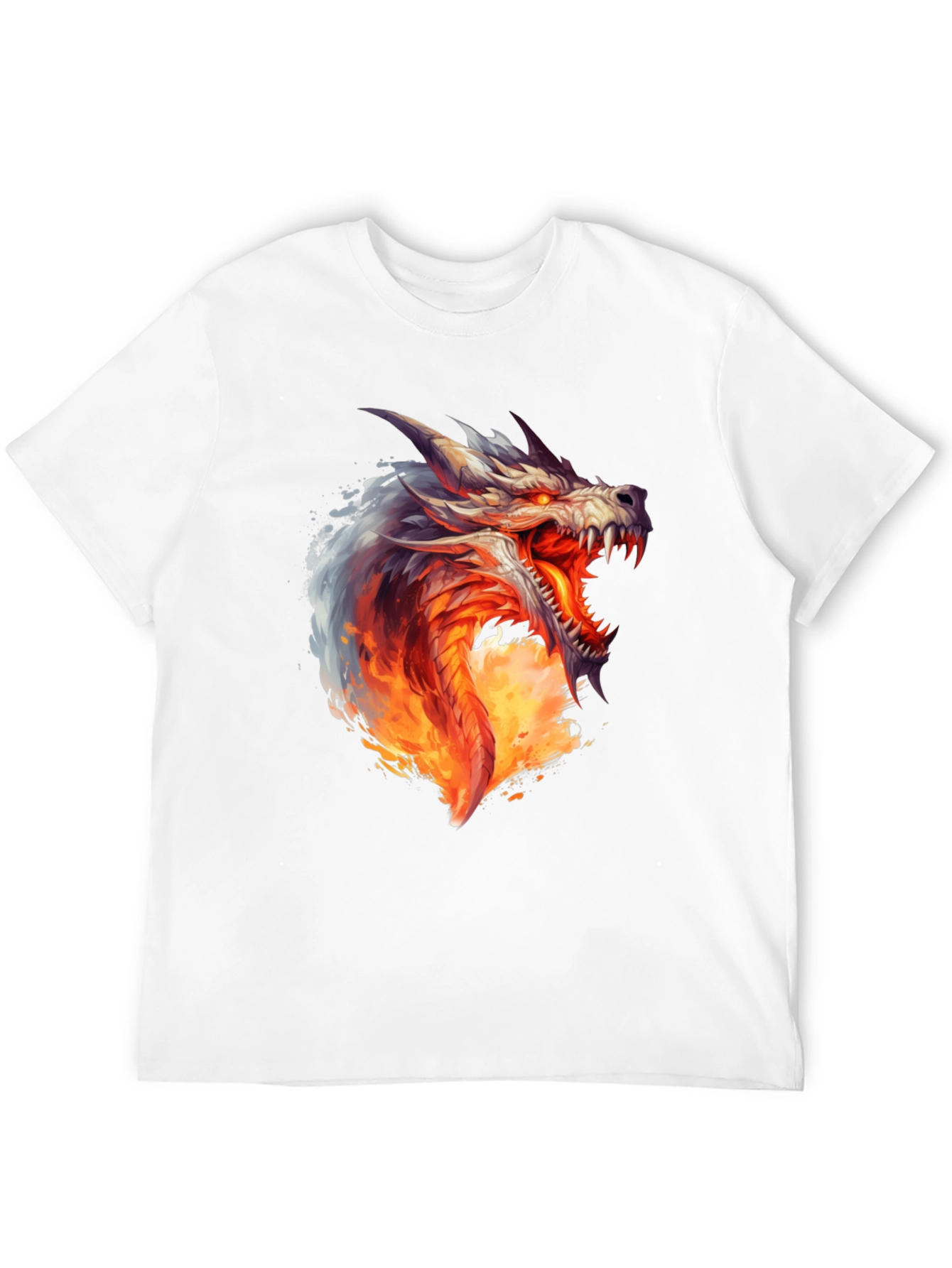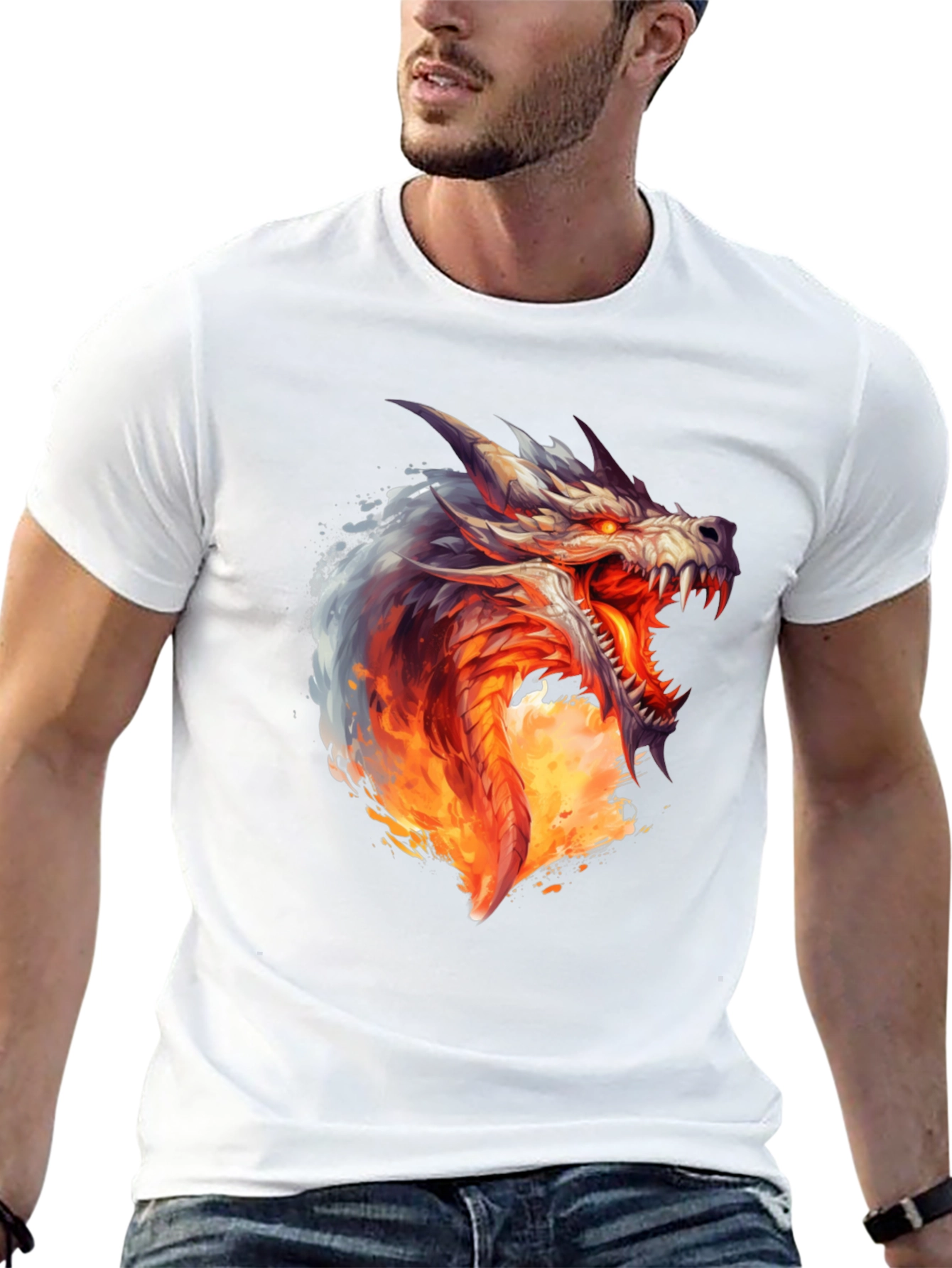 Unleash your inner fire with this bold black t-shirt featuring a stunning dragon graphic. The design showcases a white and fiery red dragon head with piercing eyes, exuding power and mystique. The detailed print stands out vividly against the classic black backdrop, making a strong statement. Crafted from what appears to be a soft and comfortable fabric, this tee offers a relaxed fit for everyday wear. Perfect for casual outings, concerts, or expressing your unique style, this dragon t-shirt is a must-have for fantasy enthusiasts and anyone looking to add an edgy flair to their wardrobe. Make a statement and ignite your style with this eye-catching design.