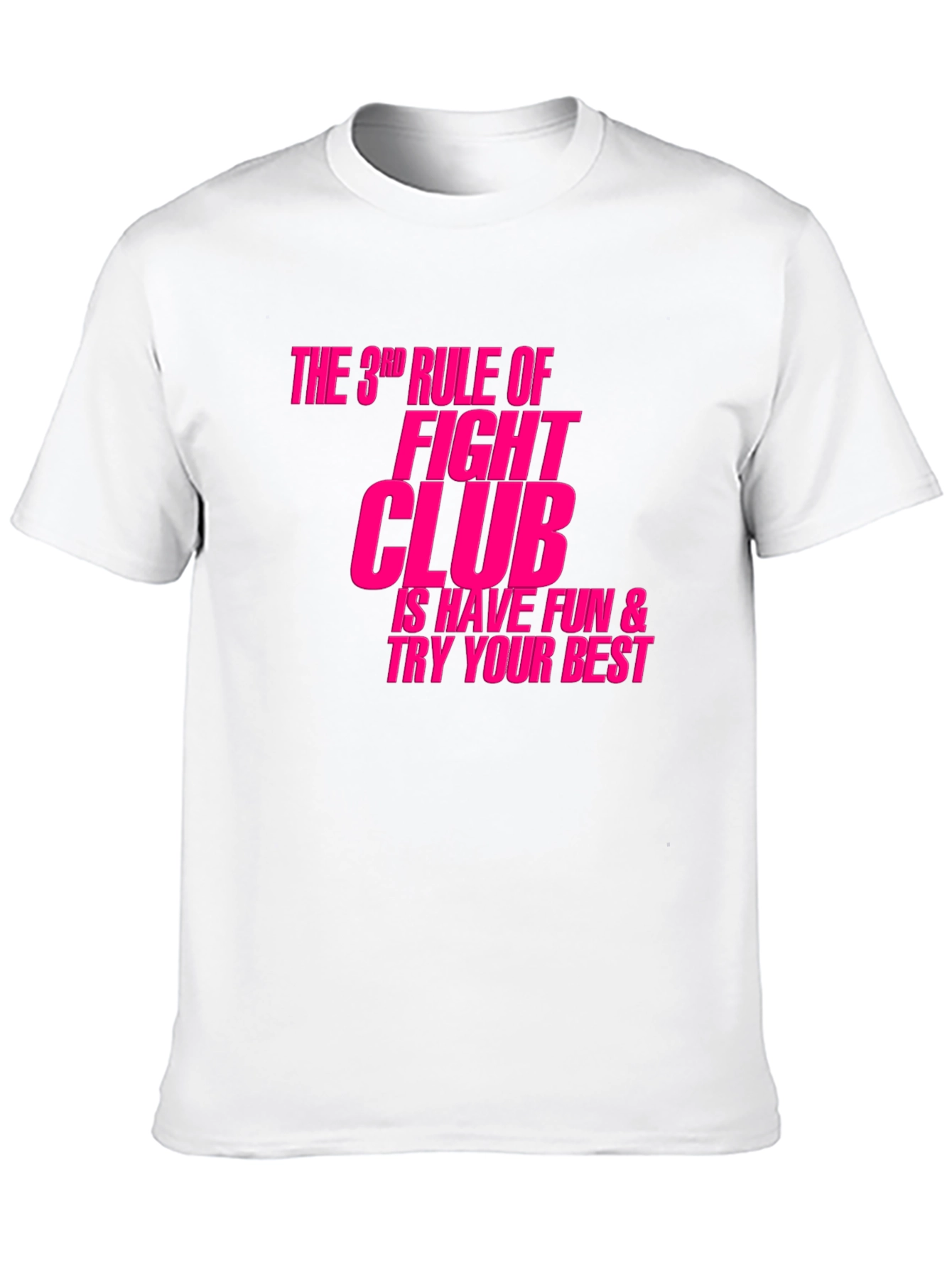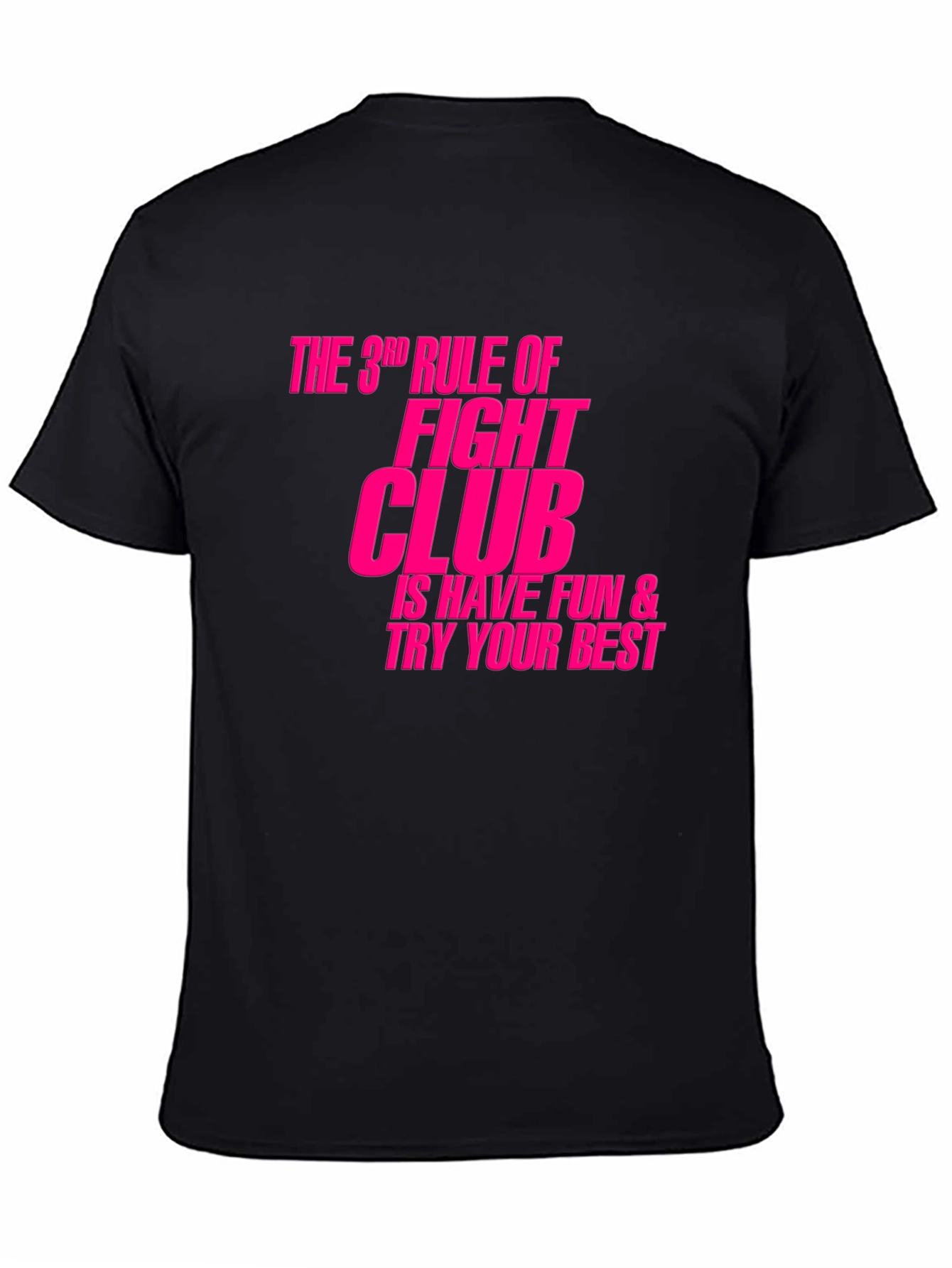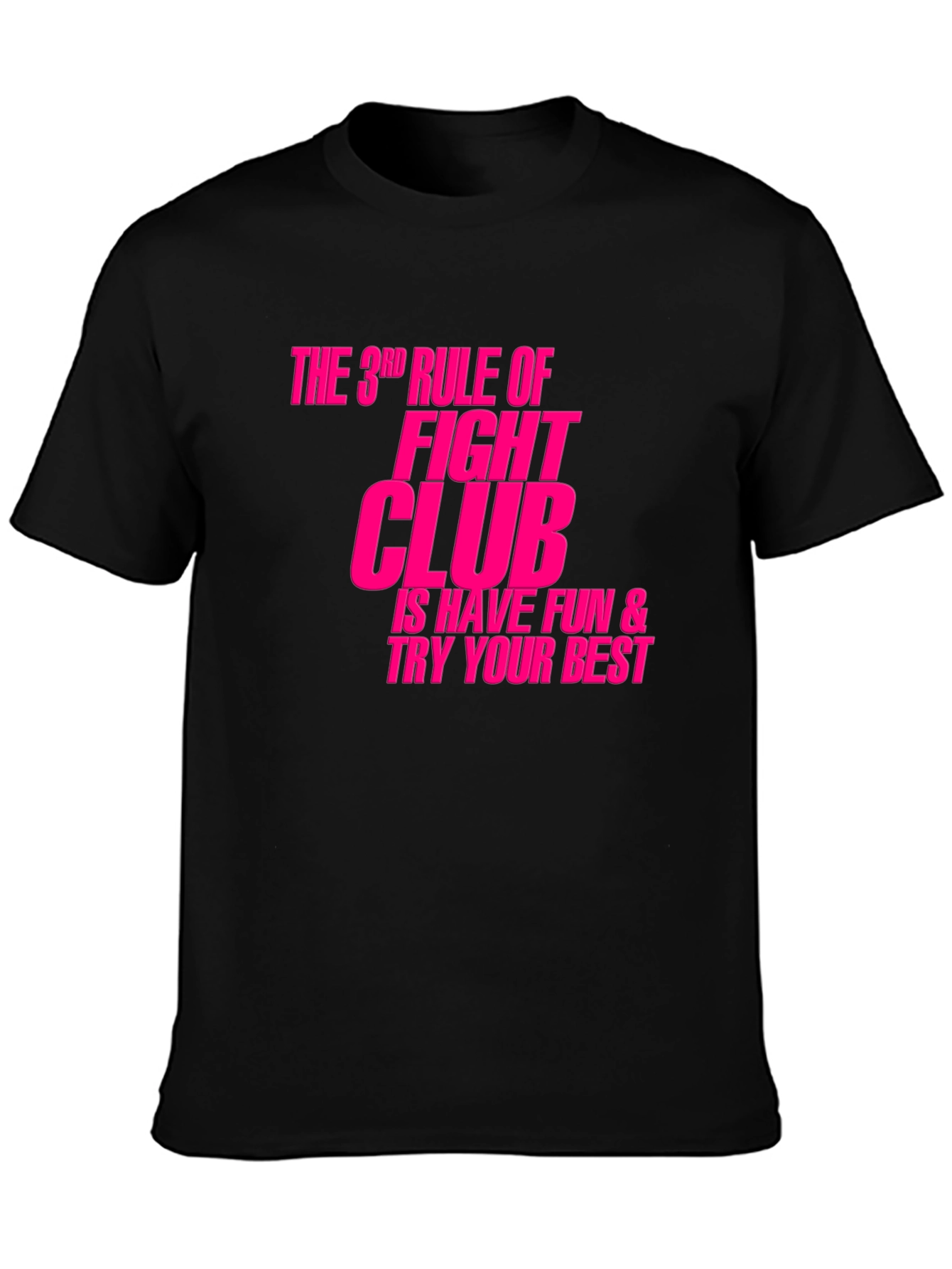 Embrace your inner rebel with this bold black t-shirt, featuring a vibrant pink graphic of the third rule of Fight Club: "HAVE FUN & TRY YOUR BEST." This eye-catching design adds a playful twist to the iconic movie reference. Made from a comfortable, breathable fabric, this tee is perfect for casual wear, movie nights, or making a statement wherever you go. Pair it with jeans, shorts, or your favorite jacket for an effortlessly cool look. Show off your unique style and add a touch of humor to your wardrobe with this must-have tee.