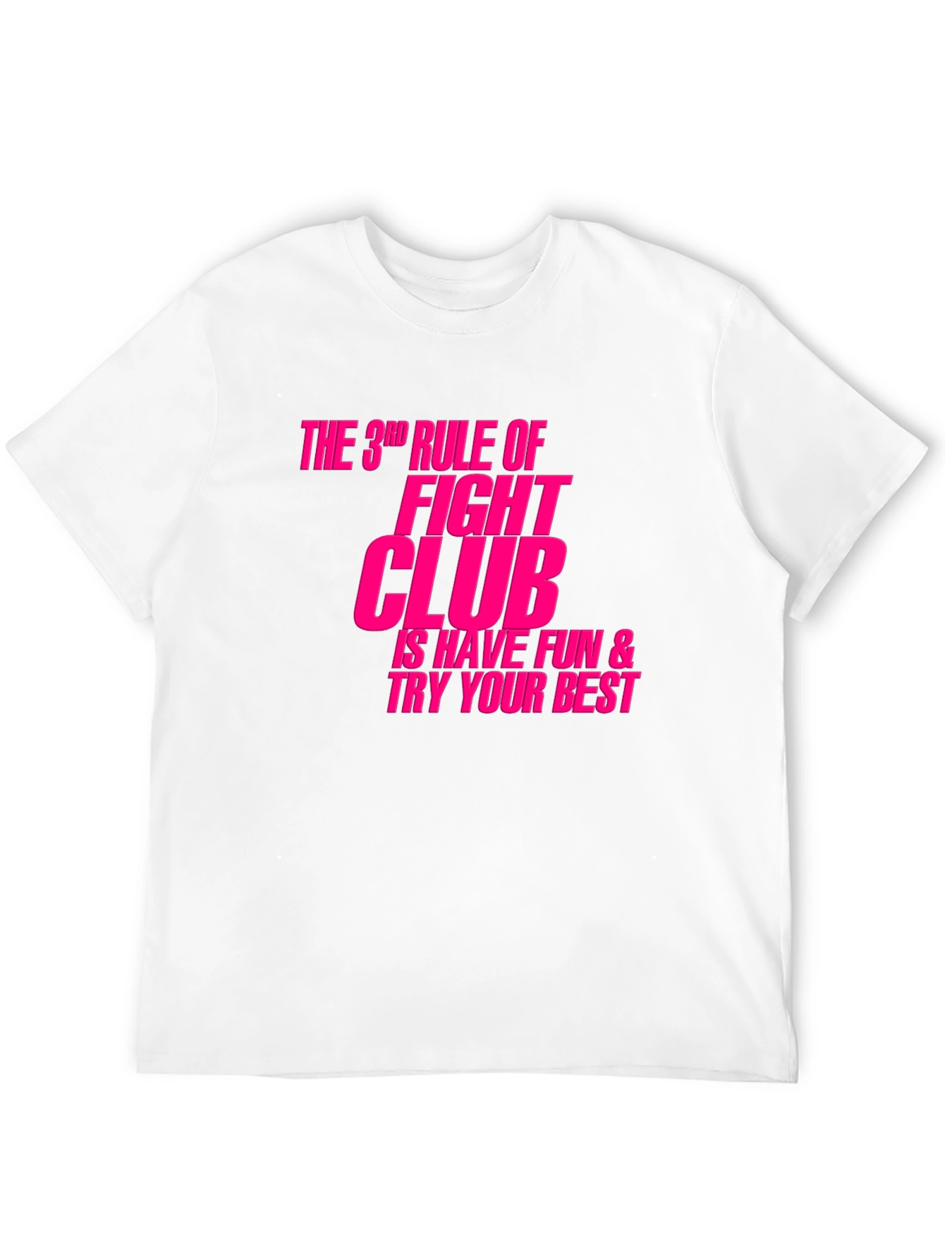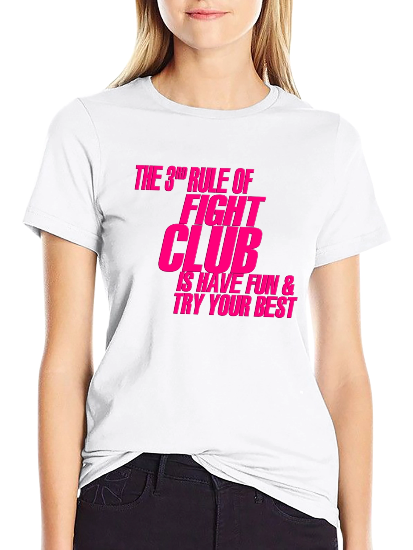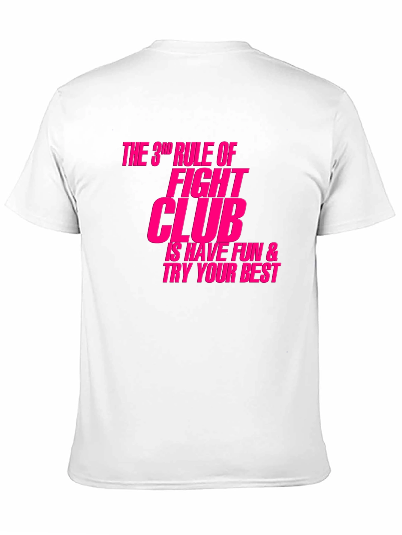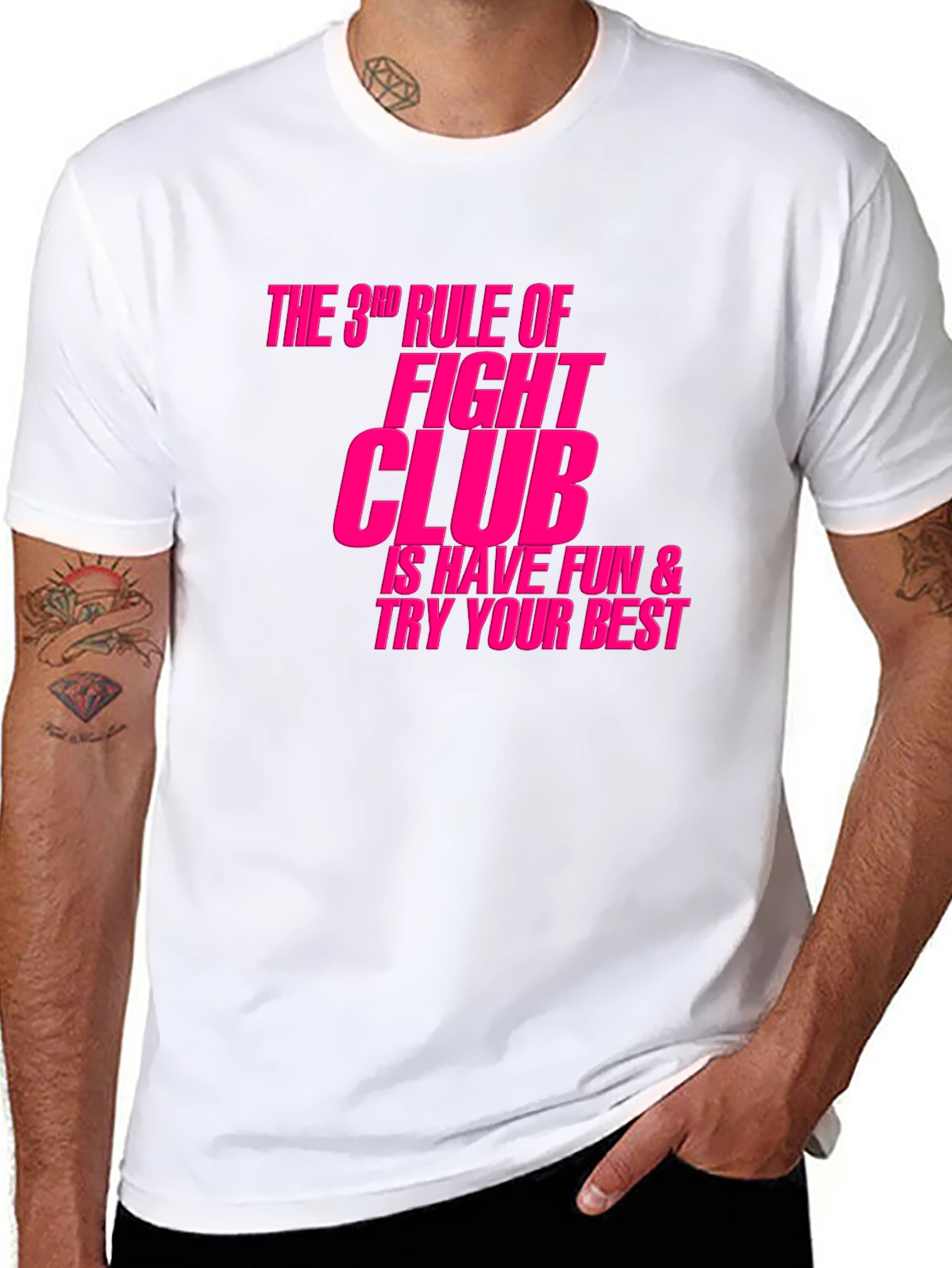 Embrace your inner rebel with this bold black t-shirt, featuring a vibrant pink graphic of the third rule of Fight Club: "HAVE FUN & TRY YOUR BEST." This eye-catching design adds a playful twist to the iconic movie reference. Made from a comfortable, breathable fabric, this tee is perfect for casual wear, movie nights, or making a statement wherever you go. Pair it with jeans, shorts, or your favorite jacket for an effortlessly cool look. Show off your unique style and add a touch of humor to your wardrobe with this must-have tee.