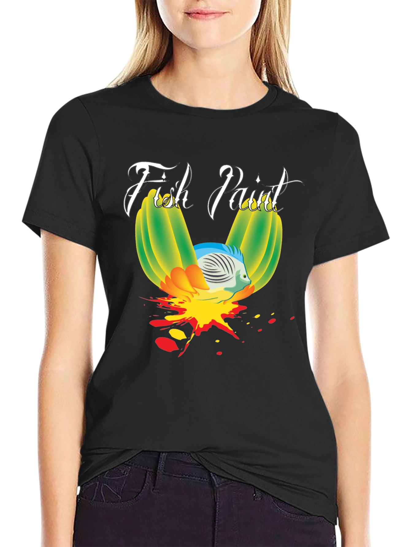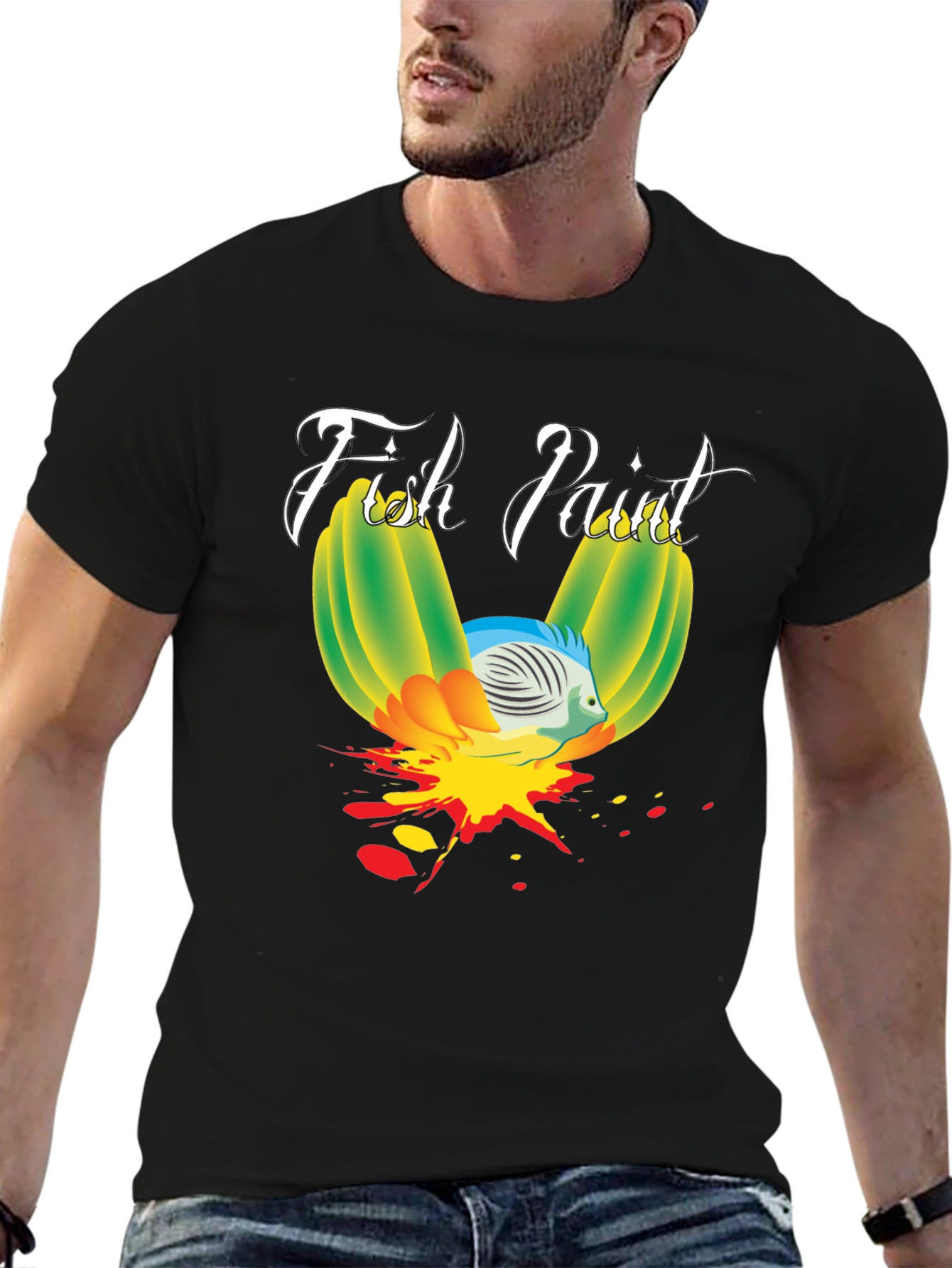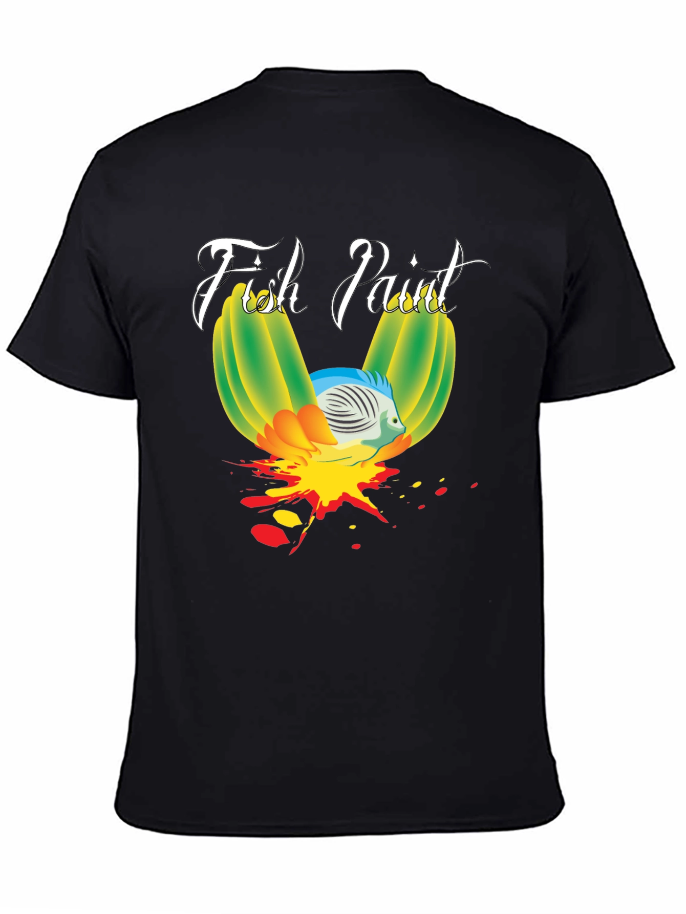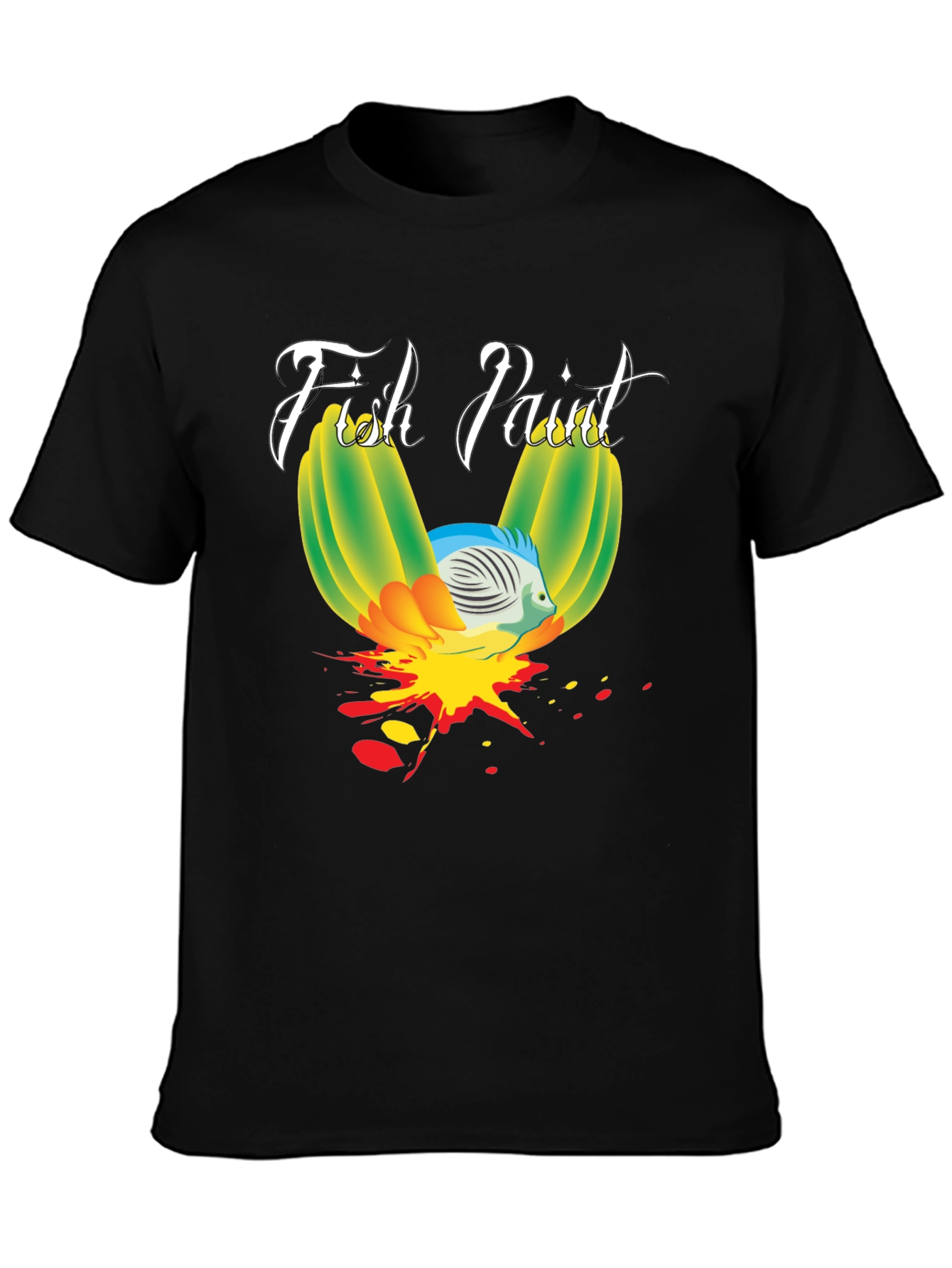 This striking black t-shirt features a unique "Fish Paint" graphic design. The artistic print showcases a colorful fish emerging from a splash of vibrant paint, creating a dynamic and eye-catching look. The shirt appears to be made from a soft and comfortable fabric, perfect for everyday wear. Ideal for casual outings, expressing your artistic side, or making a statement with a bold design, this t-shirt is sure to turn heads. Add a splash of color to your wardrobe with this unique piece!