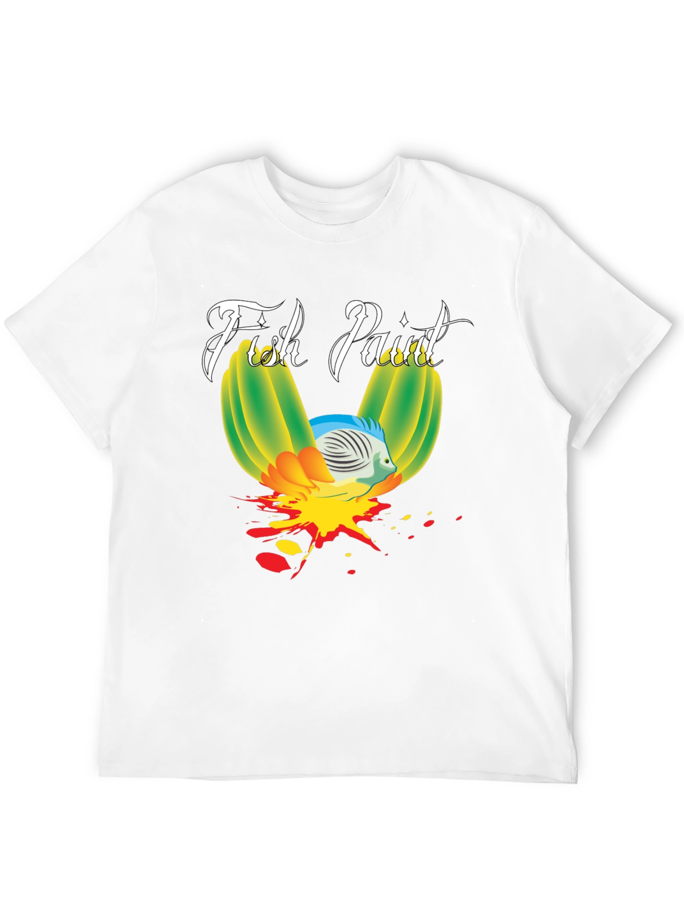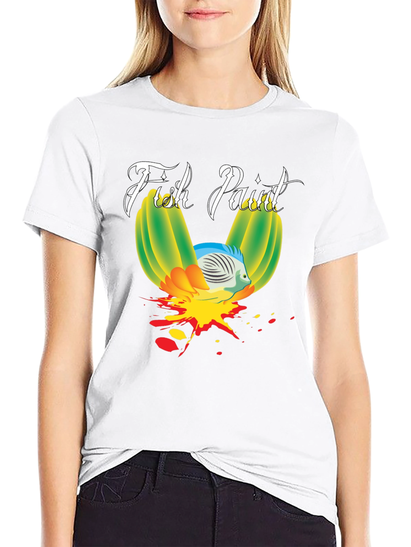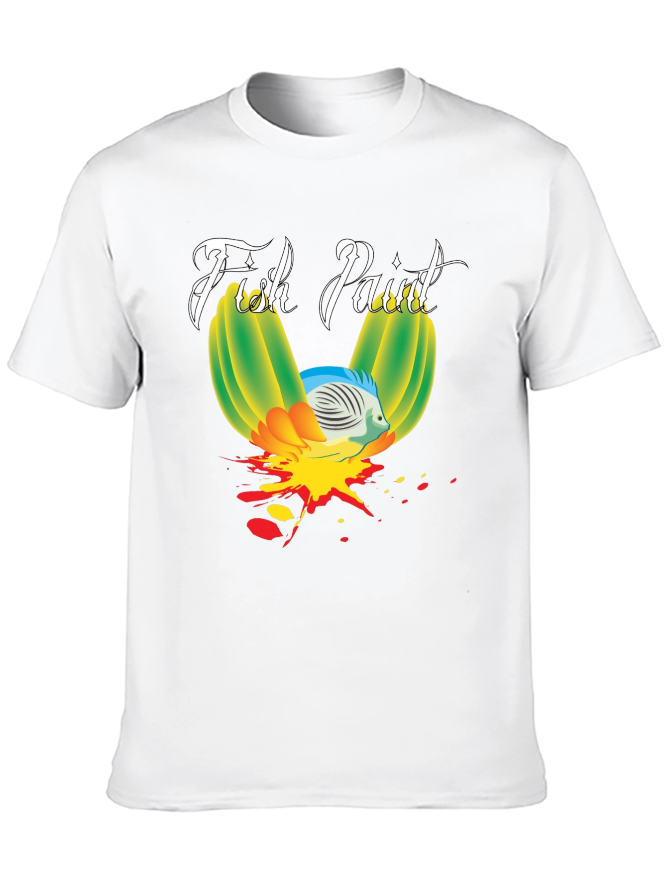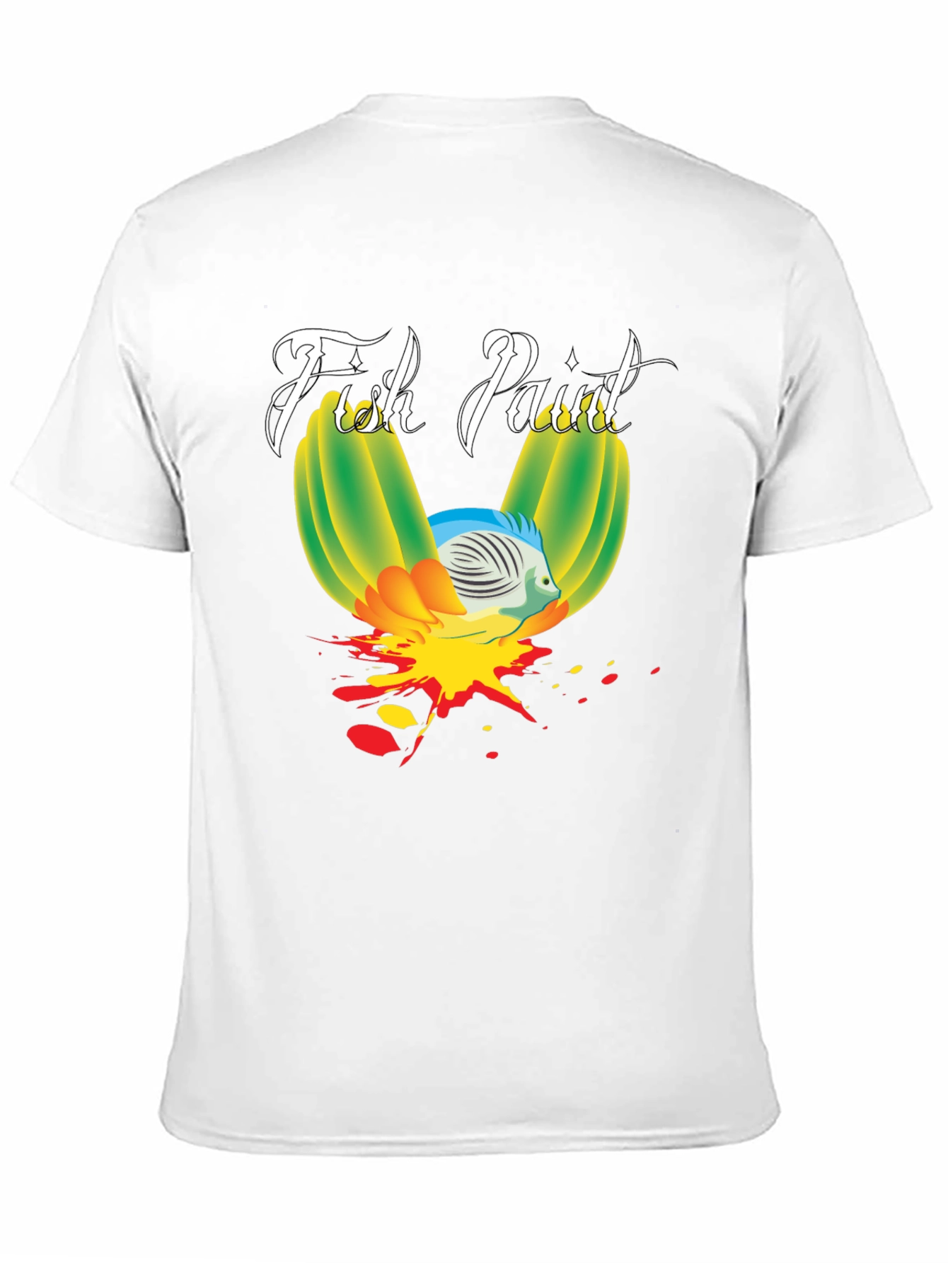 This striking black t-shirt features a unique "Fish Paint" graphic design. The artistic print showcases a colorful fish emerging from a splash of vibrant paint, creating a dynamic and eye-catching look. The shirt appears to be made from a soft and comfortable fabric, perfect for everyday wear. Ideal for casual outings, expressing your artistic side, or making a statement with a bold design, this t-shirt is sure to turn heads. Add a splash of color to your wardrobe with this unique piece!