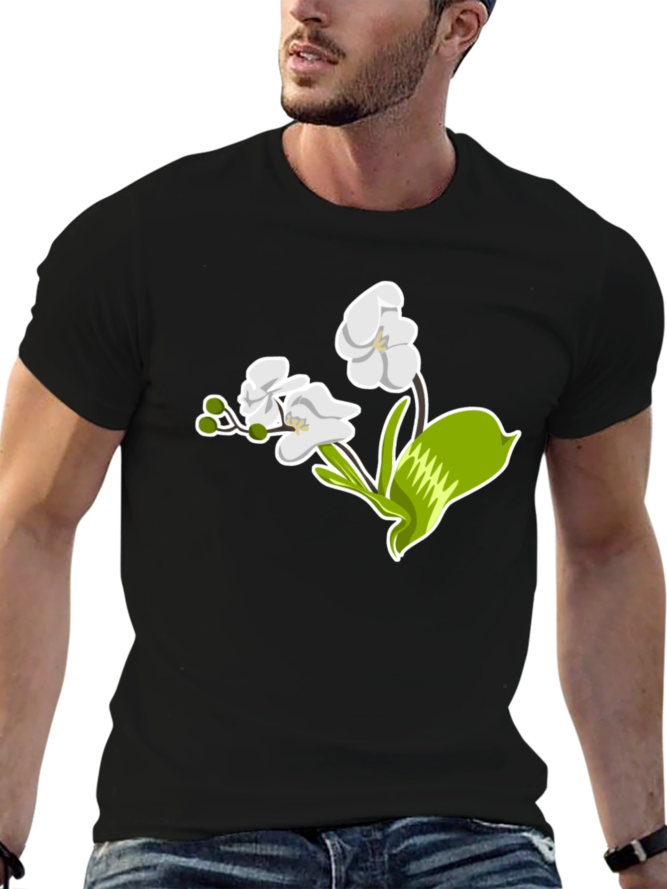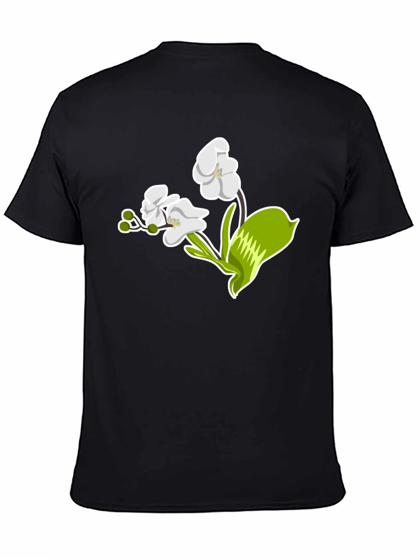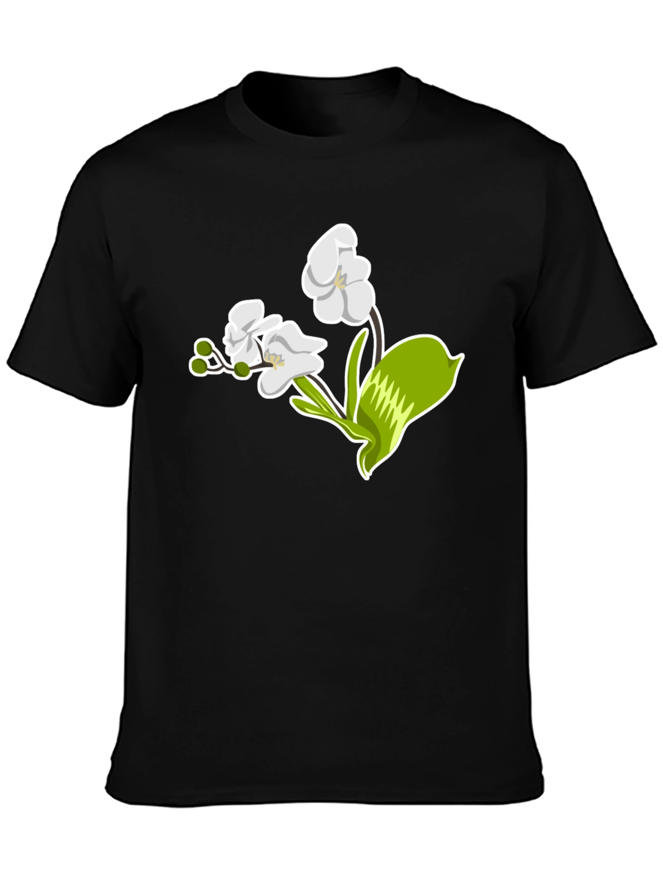 Elevate your style with this sleek black t-shirt featuring a striking floral graphic. The design showcases an elegant white orchid with vibrant green accents, offering a touch of nature-inspired sophistication. Made from a comfortable, breathable fabric, this tee is perfect for everyday wear. Whether you're dressing up for a casual outing or lounging at home, this t-shirt effortlessly combines comfort and style. The bold, eye-catching graphic makes it a versatile piece that pairs well with jeans, shorts, or skirts. Add a touch of floral charm to your wardrobe with this must-have t-shirt.
