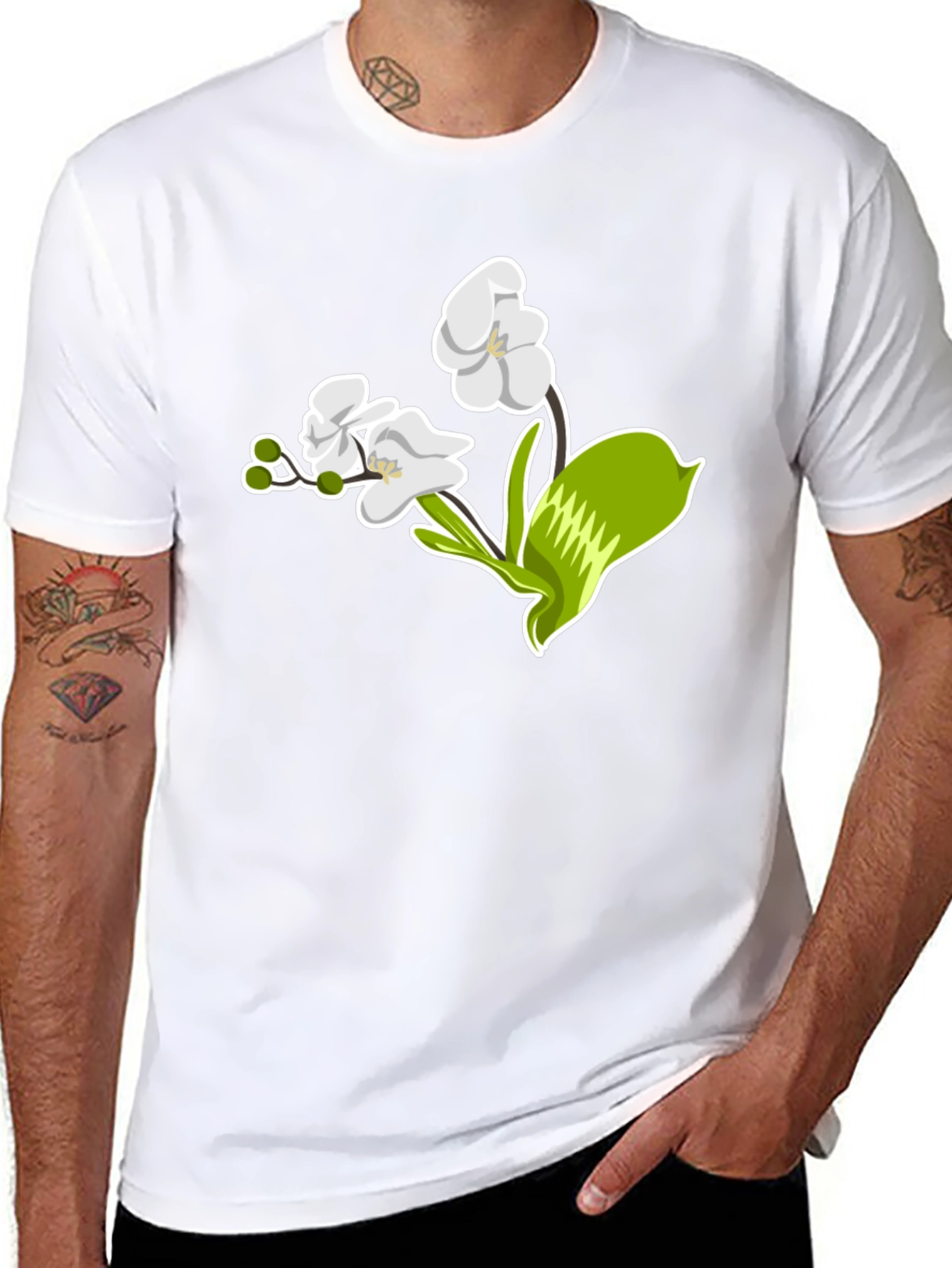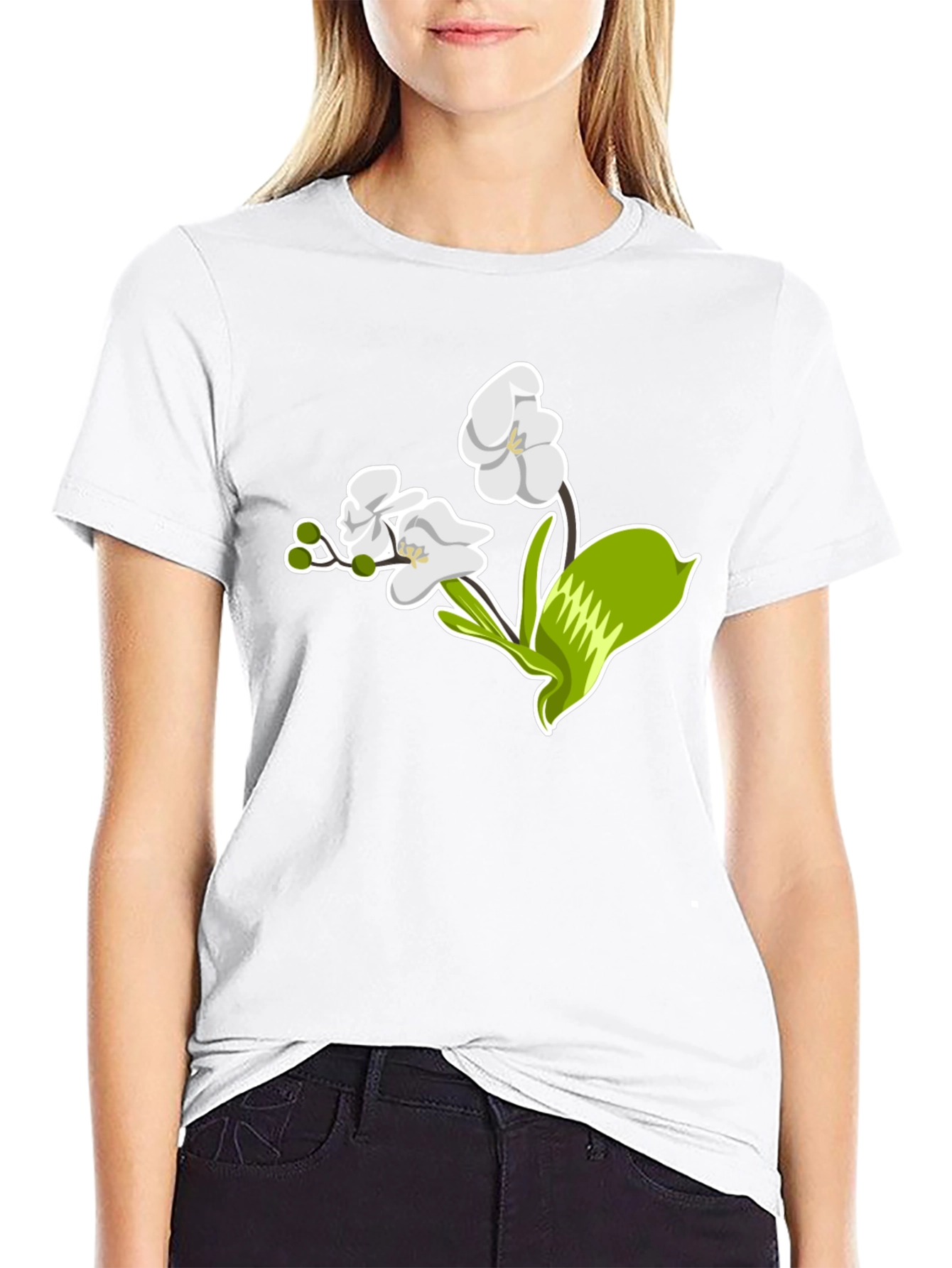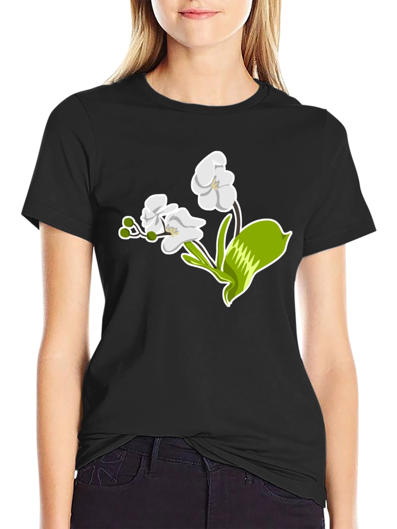 Elevate your style with this sleek black t-shirt featuring a striking floral graphic. The design showcases an elegant white orchid with vibrant green accents, offering a touch of nature-inspired sophistication. Made from a comfortable, breathable fabric, this tee is perfect for everyday wear. Whether you're dressing up for a casual outing or lounging at home, this t-shirt effortlessly combines comfort and style. The bold, eye-catching graphic makes it a versatile piece that pairs well with jeans, shorts, or skirts. Add a touch of floral charm to your wardrobe with this must-have t-shirt.