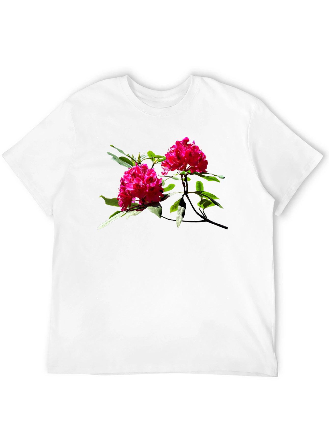Showcase your love for nature with this striking floral print t-shirt. Featuring a vibrant floral design of Rhododendron flowers on a classic black backdrop, this tee is a comfortable and stylish option for everyday wear. The high-quality print ensures lasting color and detail, making it a standout piece in your wardrobe. Made from soft, breathable fabric, it offers a relaxed fit for all-day comfort. Perfect for casual outings, weekend adventures, or as a unique gift for flower enthusiasts. Pair with jeans or shorts for a effortlessly cool look.