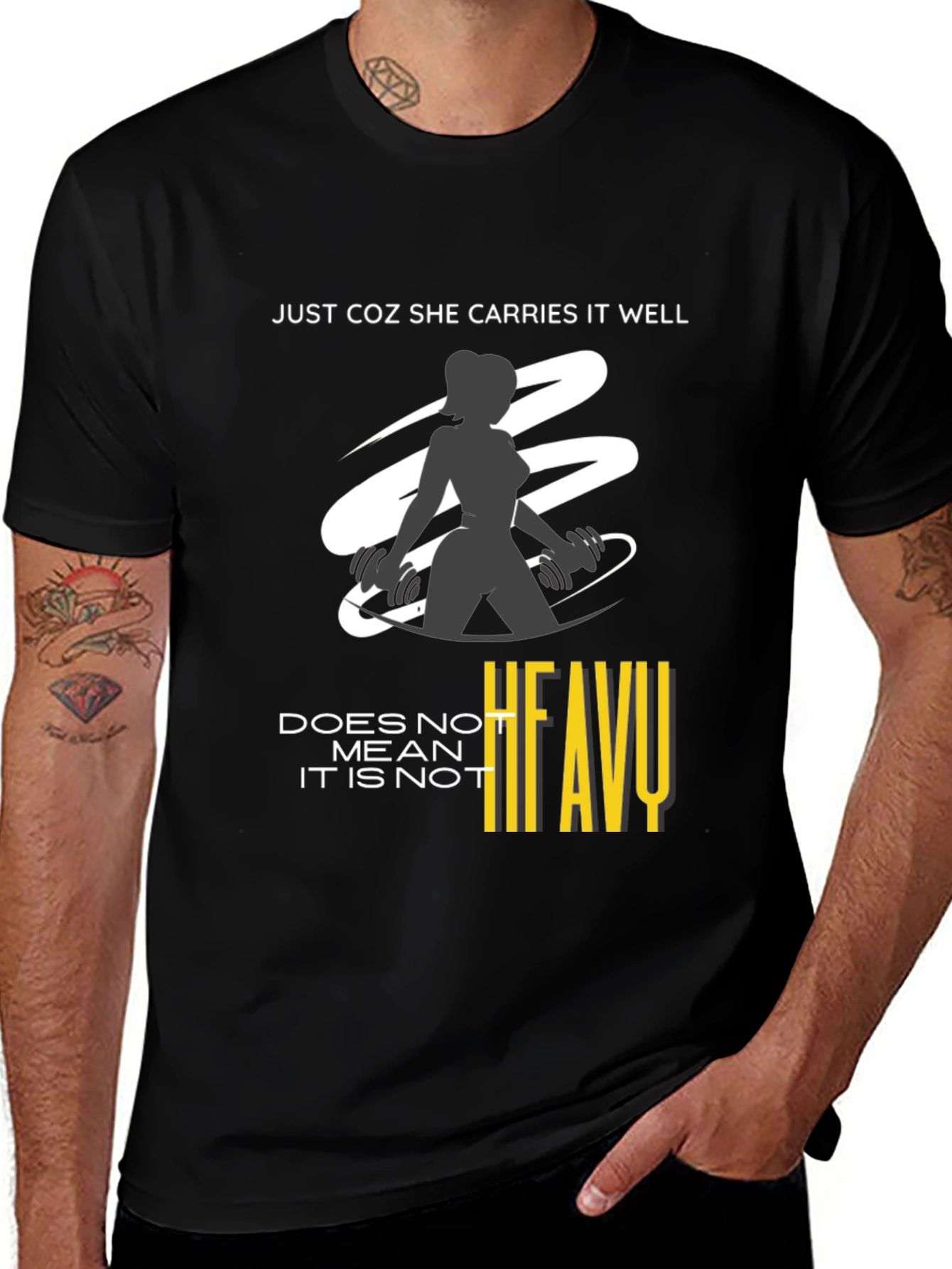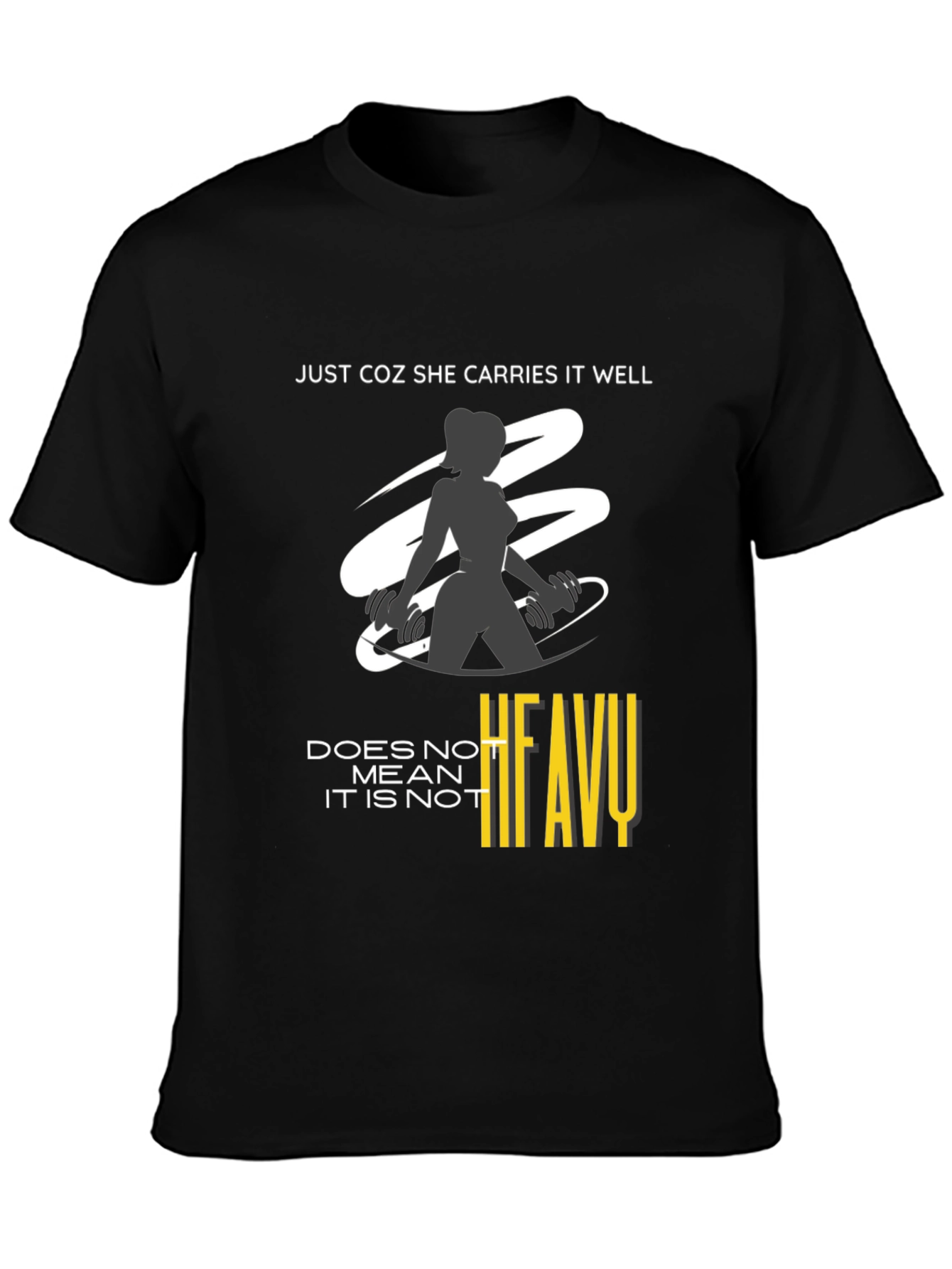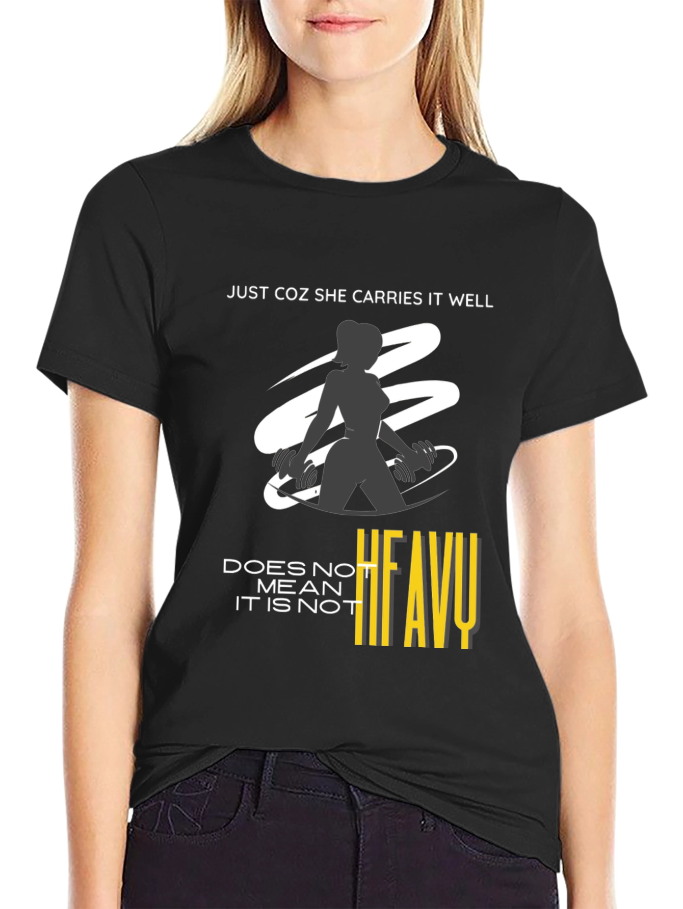 Show off your strength and humor with this black graphic t-shirt. Featuring a silhouette of a woman lifting weights, surrounded by swirling white lines, this tee makes a statement. The bold yellow "HEAVY" emphasizes the message. The design includes the phrase "Just coz she carries it well, does not mean it is not". Made from a comfortable fabric, it's ideal for workouts or casual wear. The design celebrates strong women and adds a touch of wit to your gym wardrobe. Perfect for weightlifting enthusiasts and anyone who appreciates a good laugh.