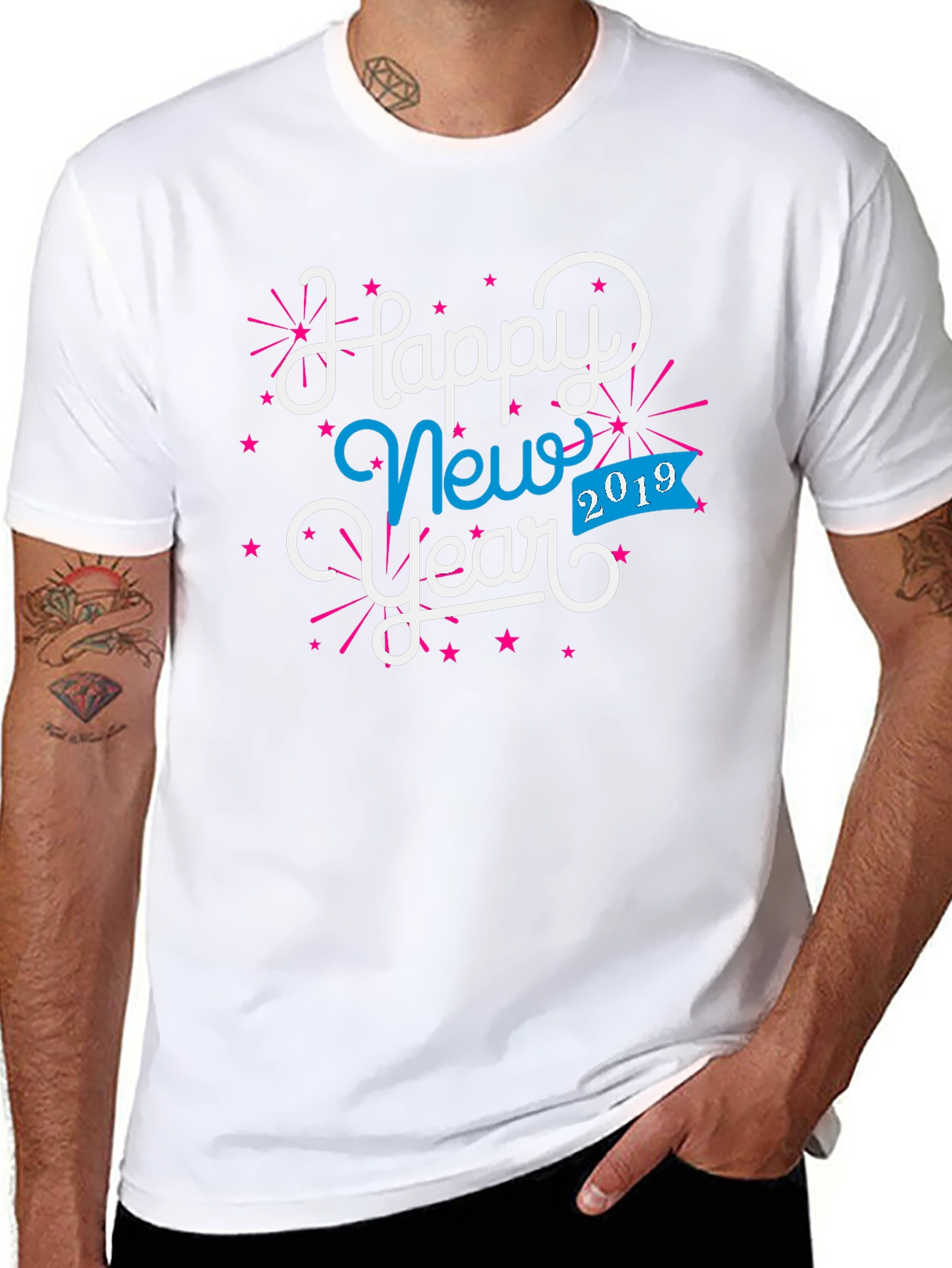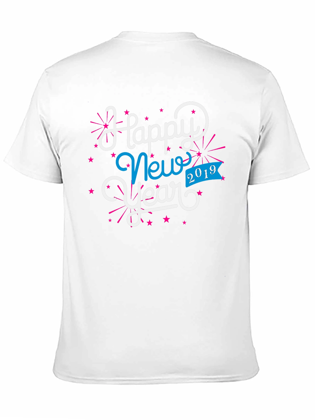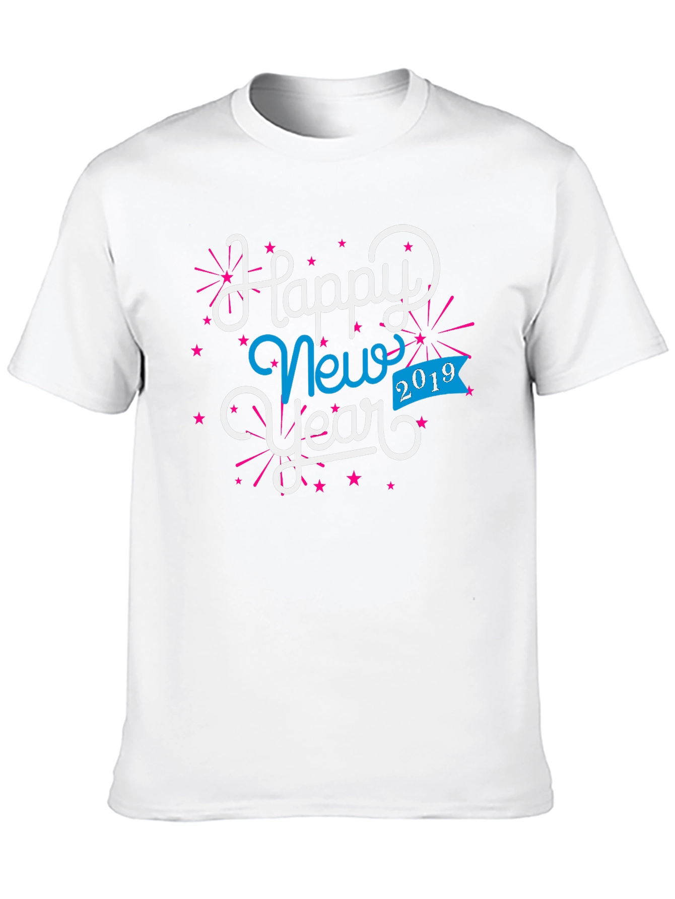 Celebrate the New Year in style with this eye-catching black graphic tee! The shirt features a festive "Happy New Year" design in white and blue with a playful font, complete with pink starburst accents. The year "2019" is prominently displayed on a blue banner, adding a touch of nostalgia. Made from a soft, comfortable fabric, this tee is perfect for New Year's Eve parties, casual gatherings, or simply showing off your holiday spirit. Get ready to ring in the New Year with this unique and stylish t-shirt!