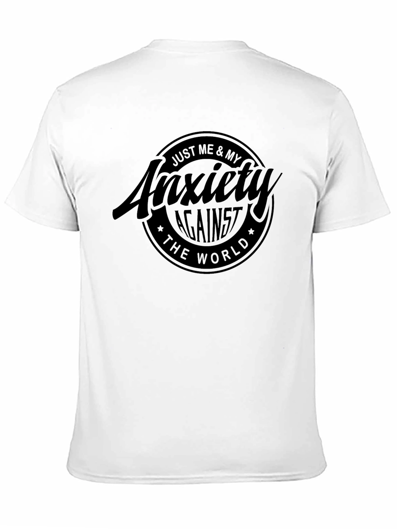 Embrace comfort and self-expression with this black graphic t-shirt. Featuring a bold "Just Me & My Anxiety Against The World" design, this tee is made from soft, breathable fabric for all-day wear. The classic fit ensures a relaxed and flattering silhouette. Ideal for casual outings, social gatherings, or simply expressing your unique perspective, this t-shirt makes a statement wherever you go. Show the world who you are with this unique and stylish tee.