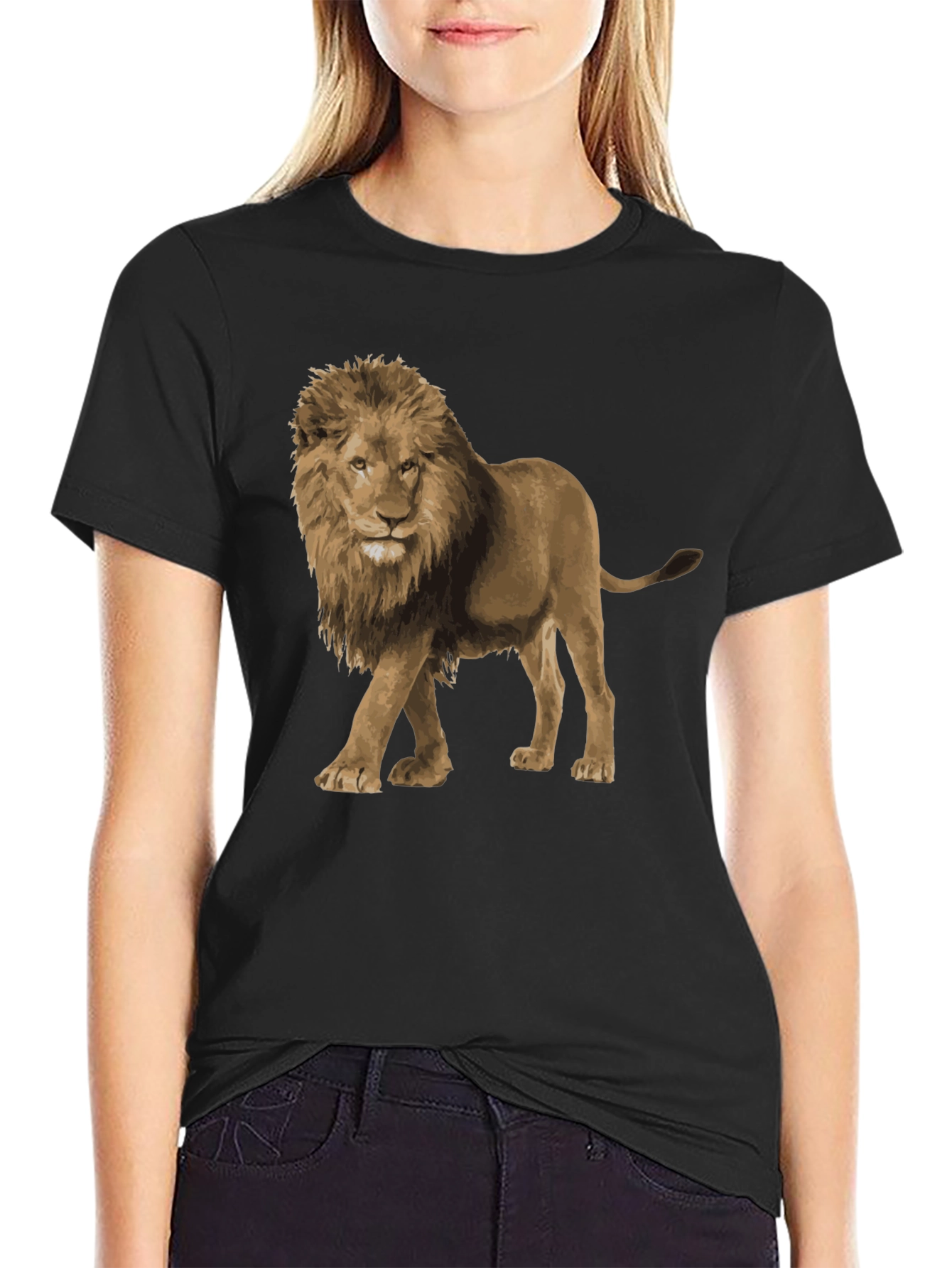 Show your wild side with this bold black tee featuring a striking lion graphic. The detailed print captures the power and majesty of the king of the jungle. Made from a comfortable, breathable fabric, this short-sleeve shirt offers a relaxed fit perfect for everyday wear. This versatile t-shirt is ideal for casual outings, weekend adventures, or lounging at home. Pair it with jeans, shorts, or joggers for a stylish look that expresses your unique personality. The eye-catching lion design is sure to turn heads and spark conversation wherever you go. Add a touch of the wild to your wardrobe with this standout graphic tee.