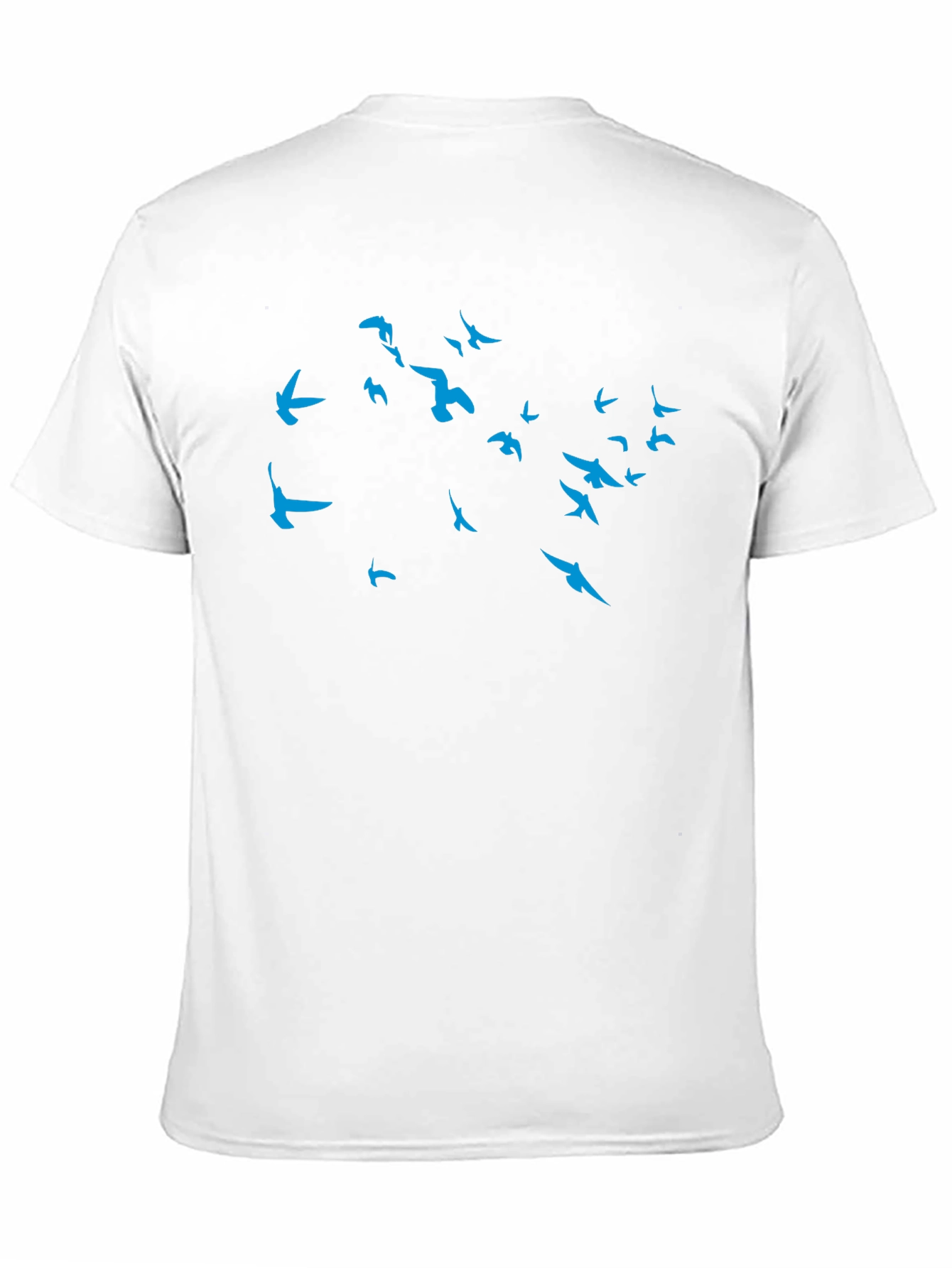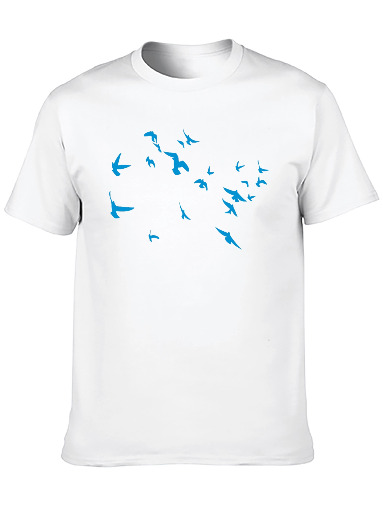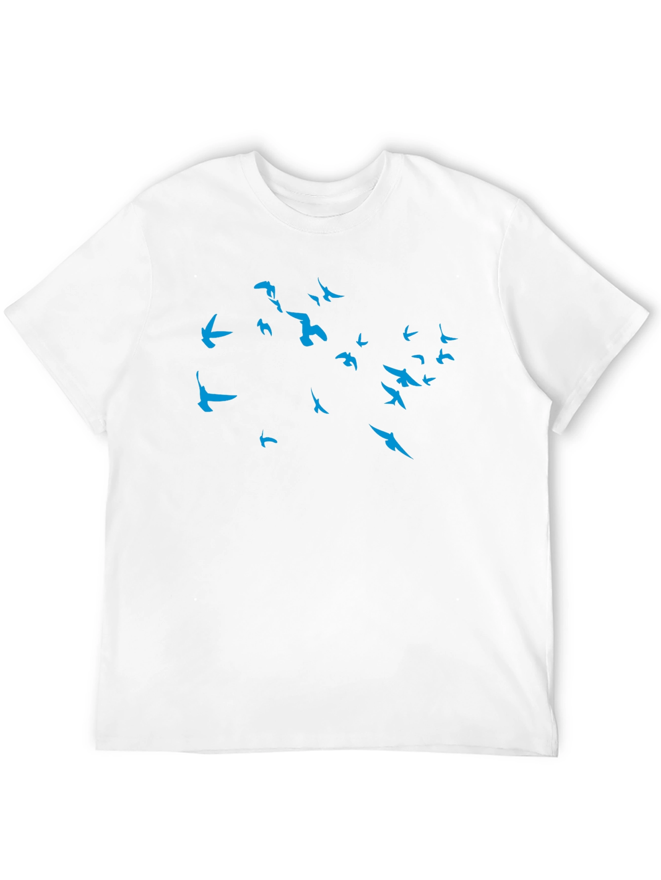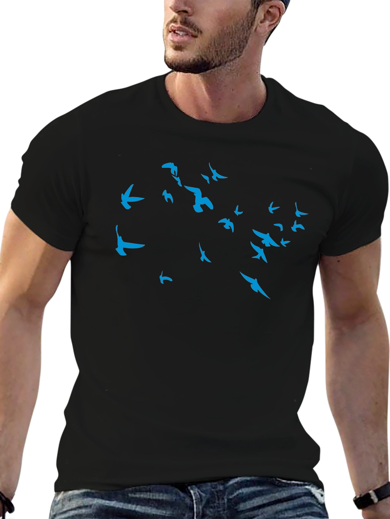 Elevate your casual wardrobe with this stylish men's black T-shirt. Crafted from a comfortable and breathable fabric, this tee features a unique flock of blue birds, adding a touch of personality to any outfit. The classic crew neck and short sleeves provide a relaxed fit, making it perfect for everyday wear. Ideal for pairing with jeans, shorts, or chinos, this versatile T-shirt is a must-have for any modern man. Whether you're running errands, meeting friends, or simply relaxing at home, this tee offers both style and comfort. Stand out from the crowd with this eye-catching design. This shirt is sure to become a favorite in your collection.