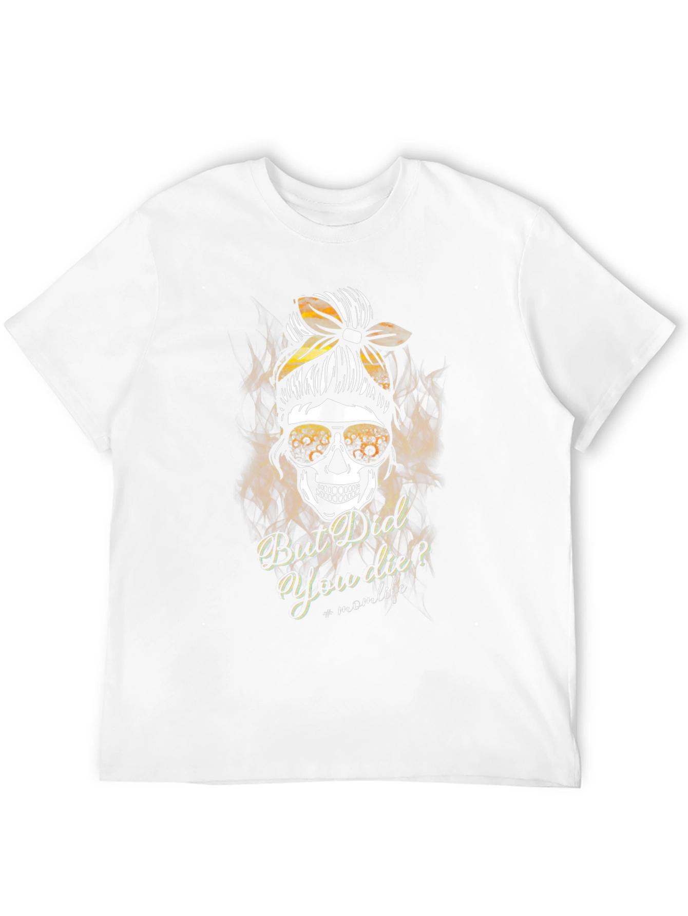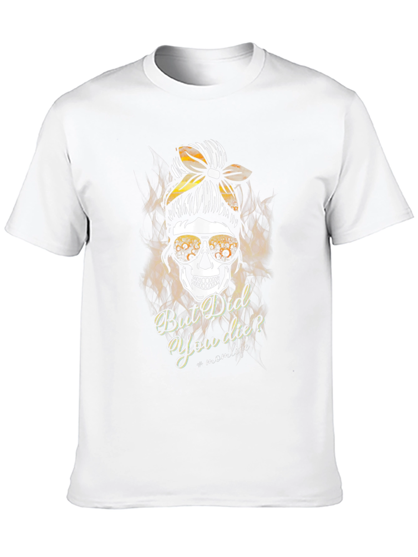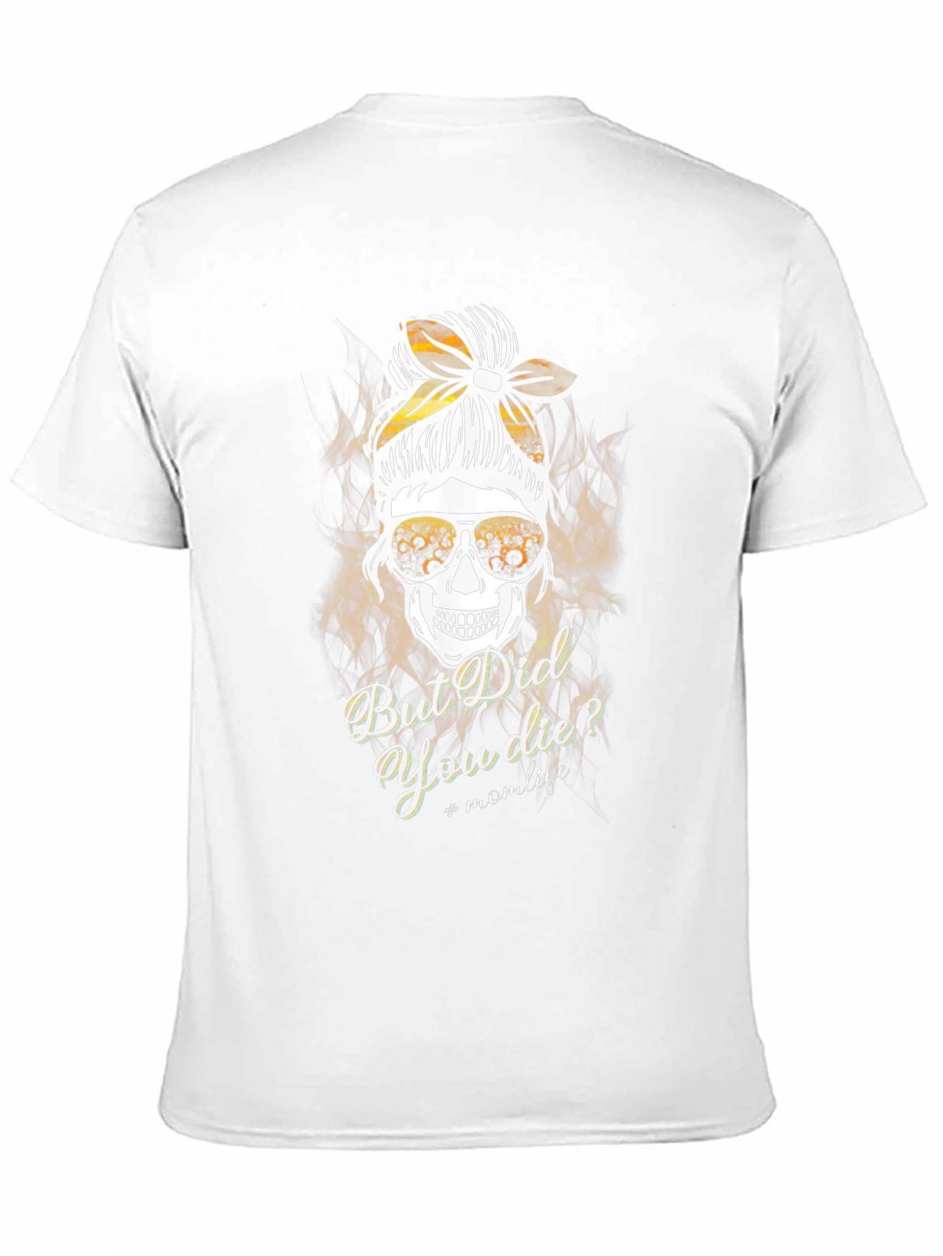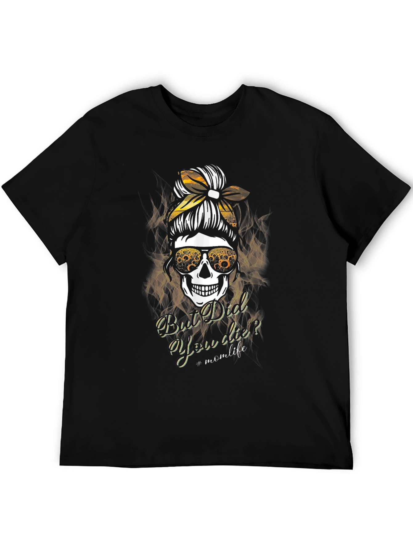 Show off your mom pride with this unique black t-shirt! It features a stylish skull graphic with a messy bun and sunglasses, perfect for adding a touch of edgy humor to your everyday style. The phrase "But Did You Die? #momlife" is playfully incorporated into the design. Made from comfortable, breathable fabric, this t-shirt is ideal for casual wear, running errands, or lounging at home. Makes a great gift for the busy mom in your life who deserves a laugh! Get yours today and embrace the #momlife with a smile.