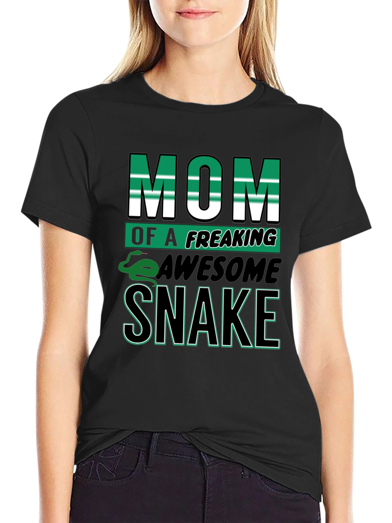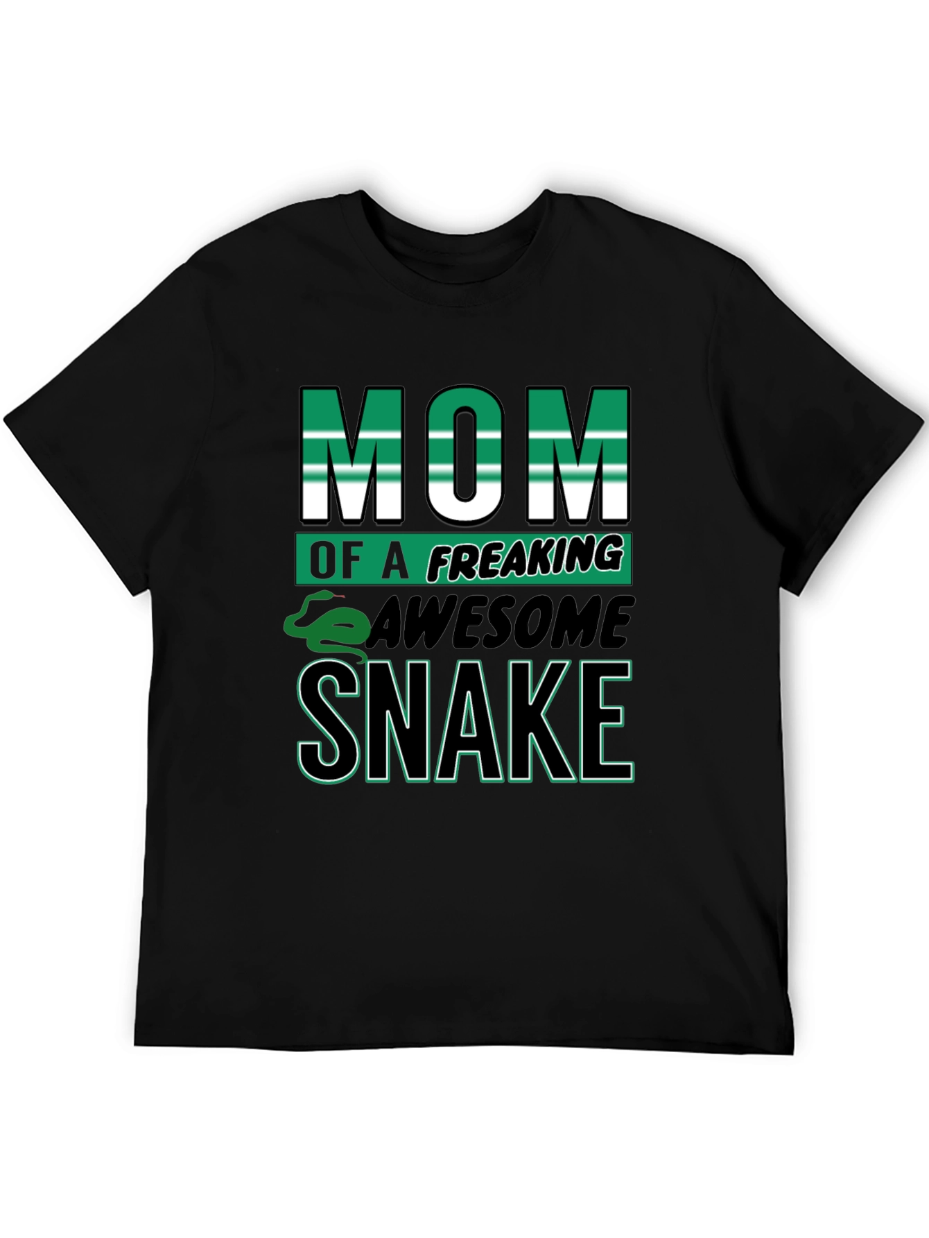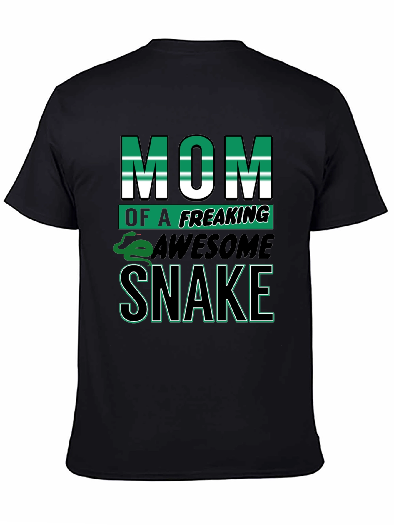 Show off your love for snakes with this bold black t-shirt. Featuring the eye-catching slogan "Mom of a Freaking Awesome Snake", with vibrant green and white lettering. A playful snake graphic adds a fun touch. Perfect for casual wear, this comfortable tee is ideal for snake lovers. The solid black background makes the graphic pop, ensuring you'll stand out from the crowd. Great as a gift for the best snake mom ever or treat yourself to this unique design! Style and comfort combined.