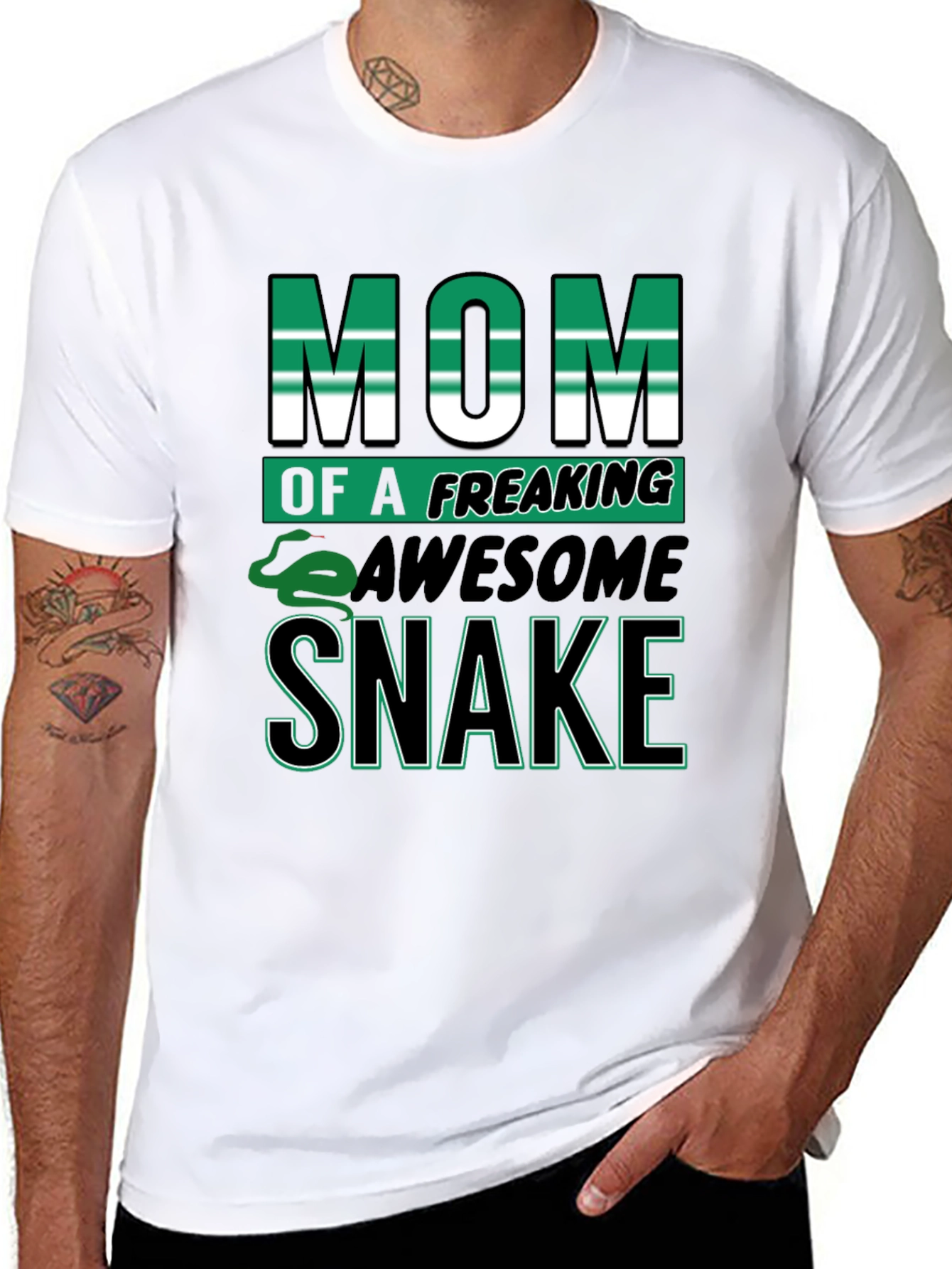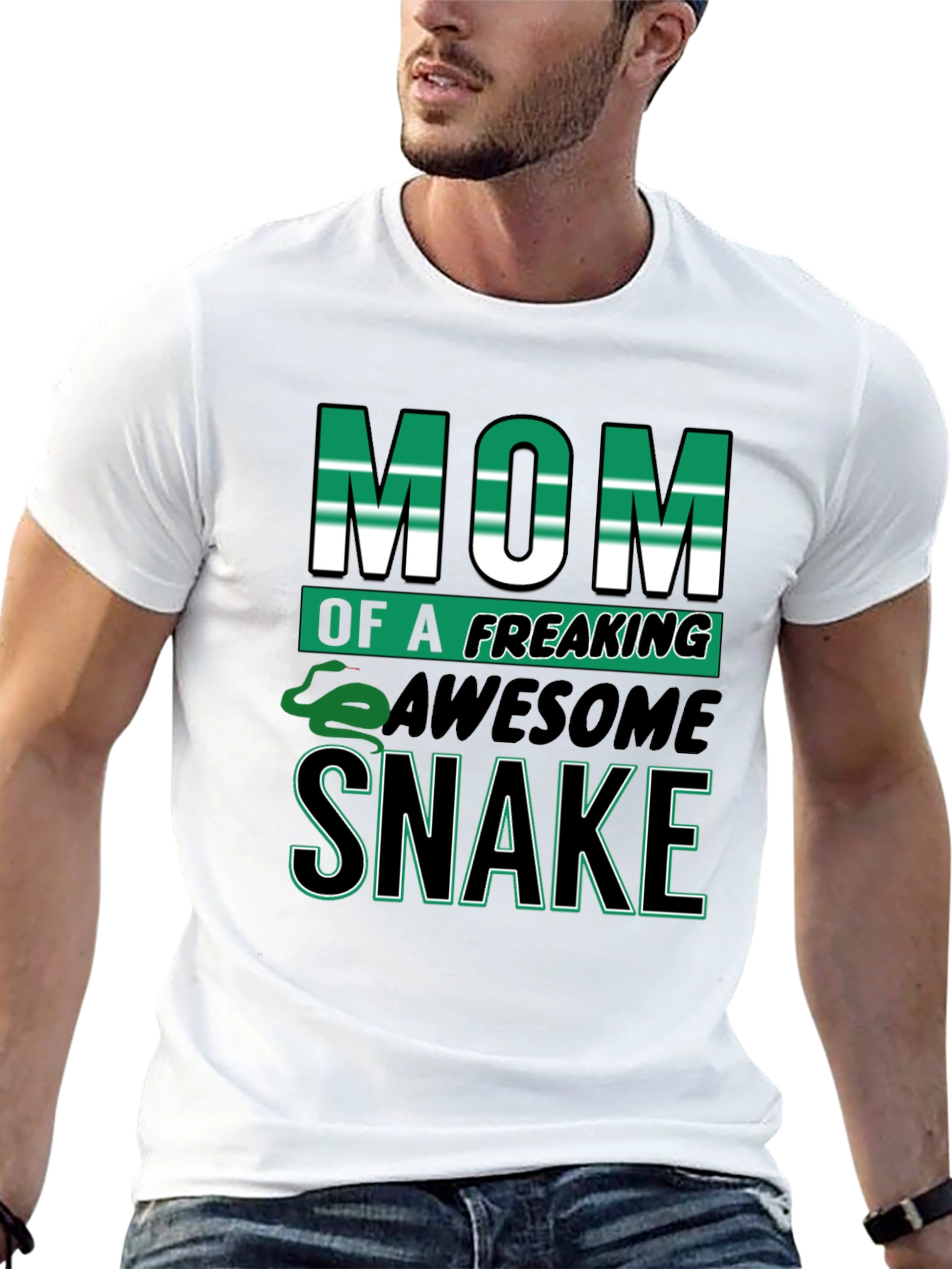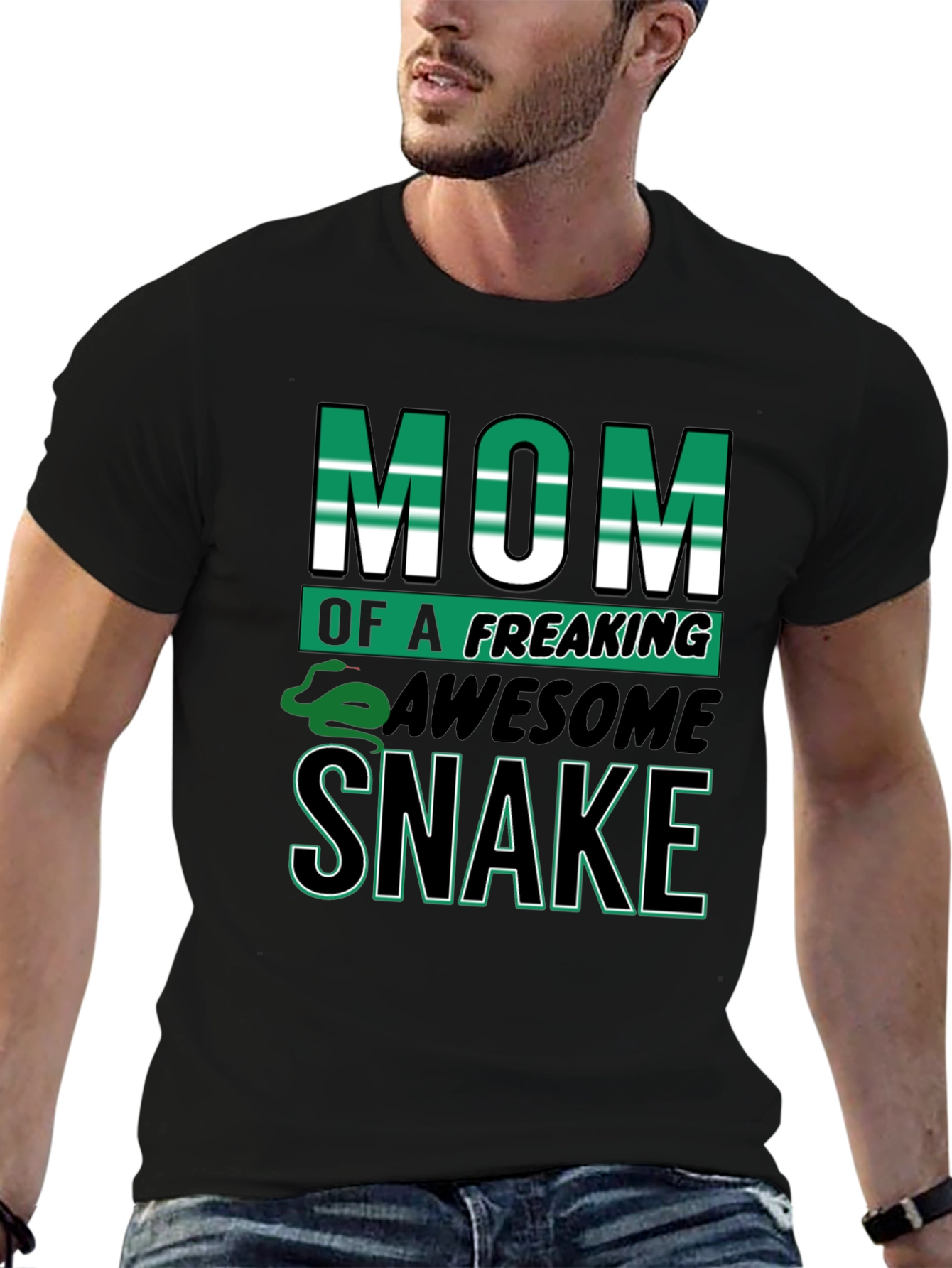 Show off your love for snakes with this bold black t-shirt. Featuring the eye-catching slogan "Mom of a Freaking Awesome Snake", with vibrant green and white lettering. A playful snake graphic adds a fun touch. Perfect for casual wear, this comfortable tee is ideal for snake lovers. The solid black background makes the graphic pop, ensuring you'll stand out from the crowd. Great as a gift for the best snake mom ever or treat yourself to this unique design! Style and comfort combined.