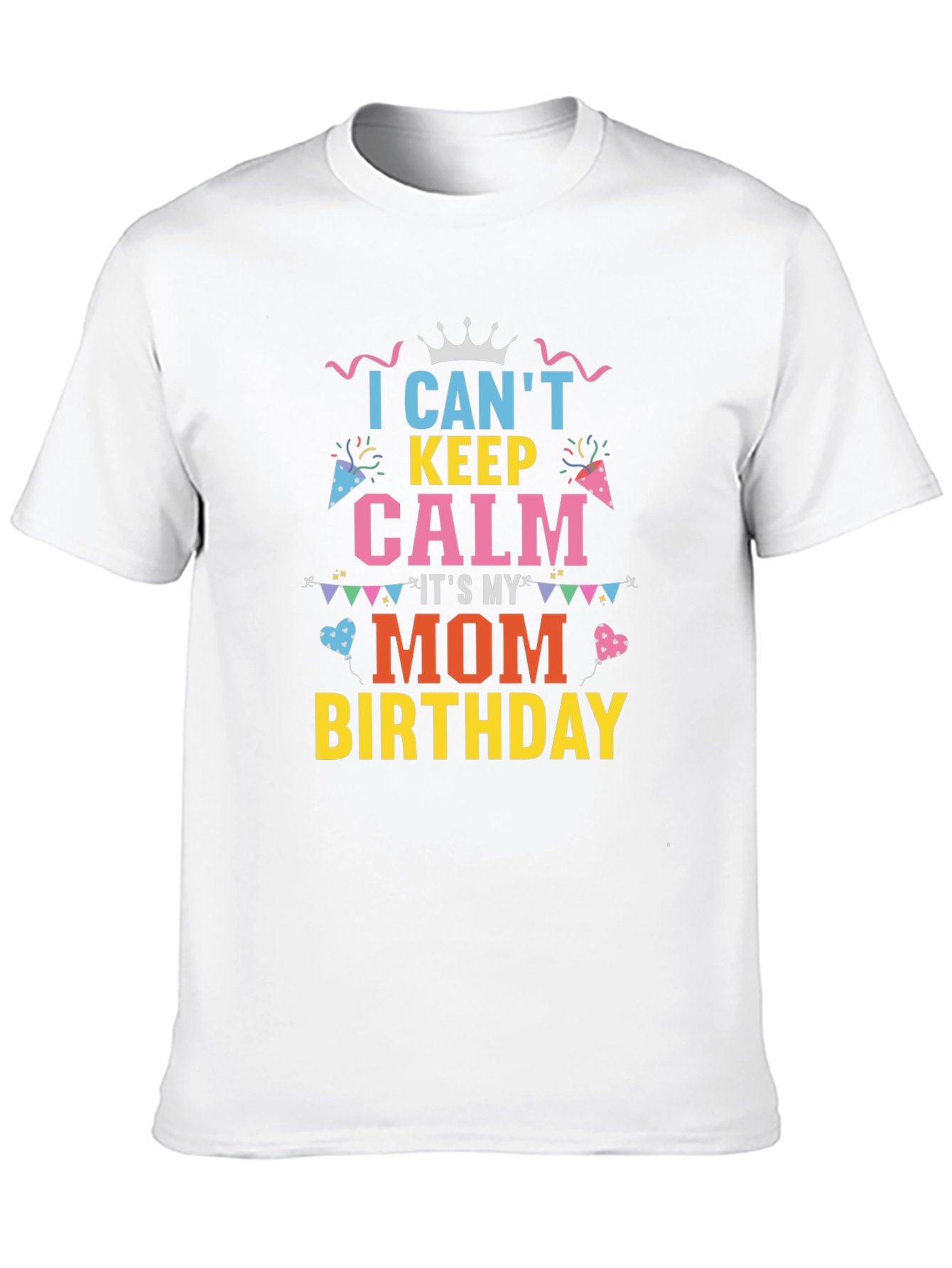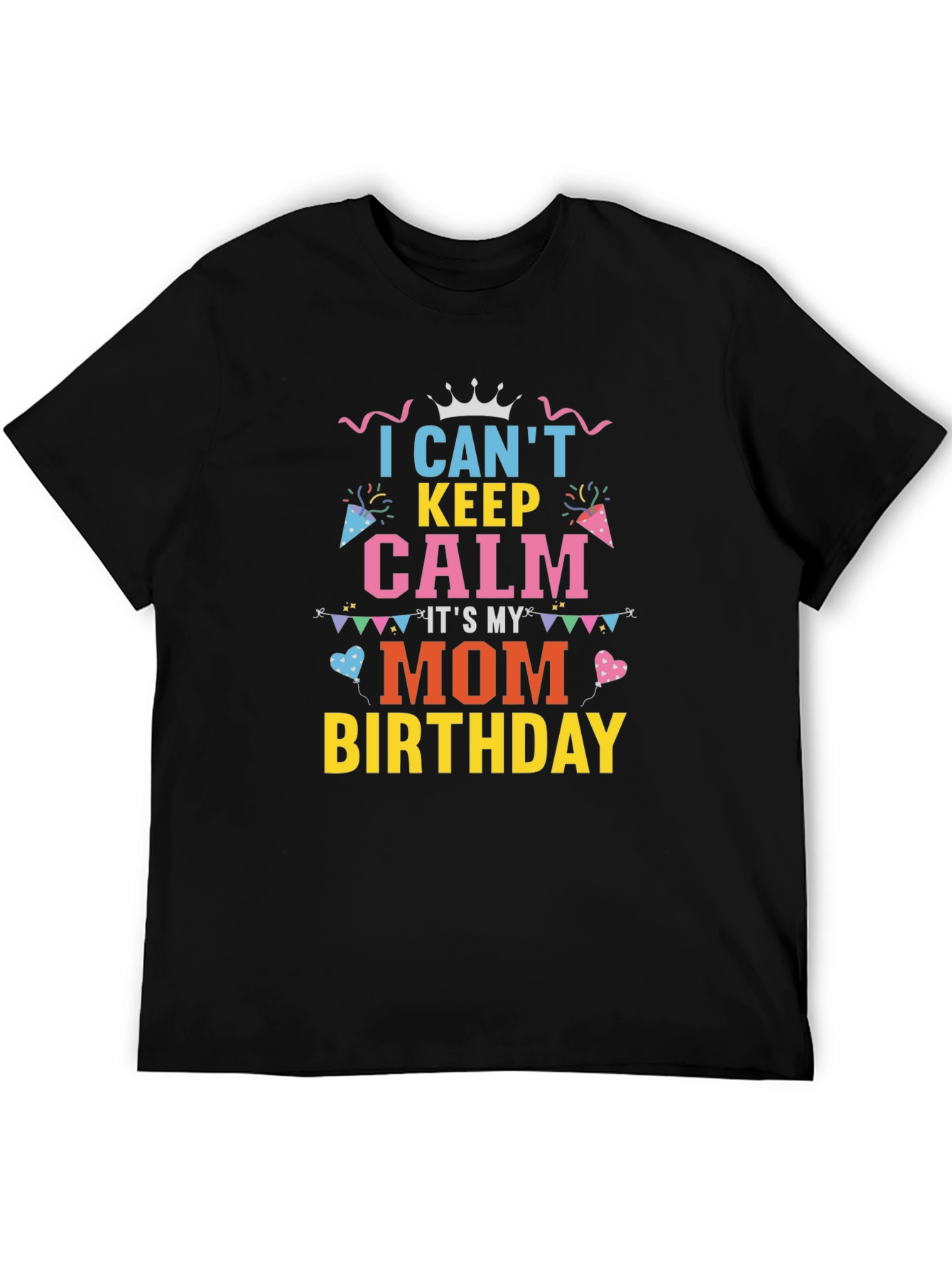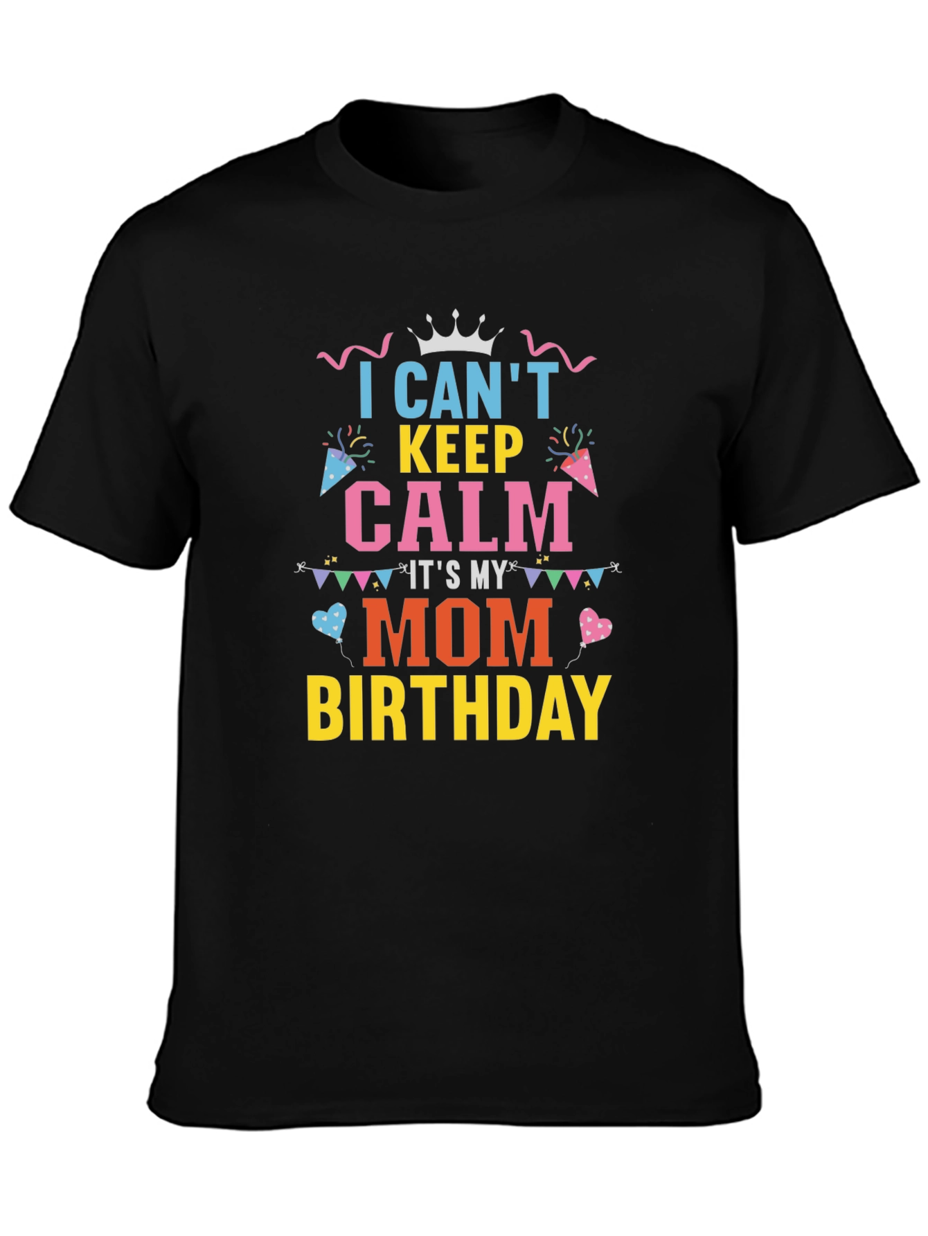 Celebrate Mom's special day with this fun and festive "I Can't Keep Calm It's My Mom's Birthday" t-shirt! This eye-catching black tee features a colorful graphic design with a crown, party hats, heart balloons and decorative banner. Perfect for wearing to a birthday party, family gathering, or as a thoughtful gift. Show your love and excitement for Mom's birthday in style. Made with comfortable fabric for all-day wear, this shirt will make the day even more special. Get yours today and make Mom feel extra loved!