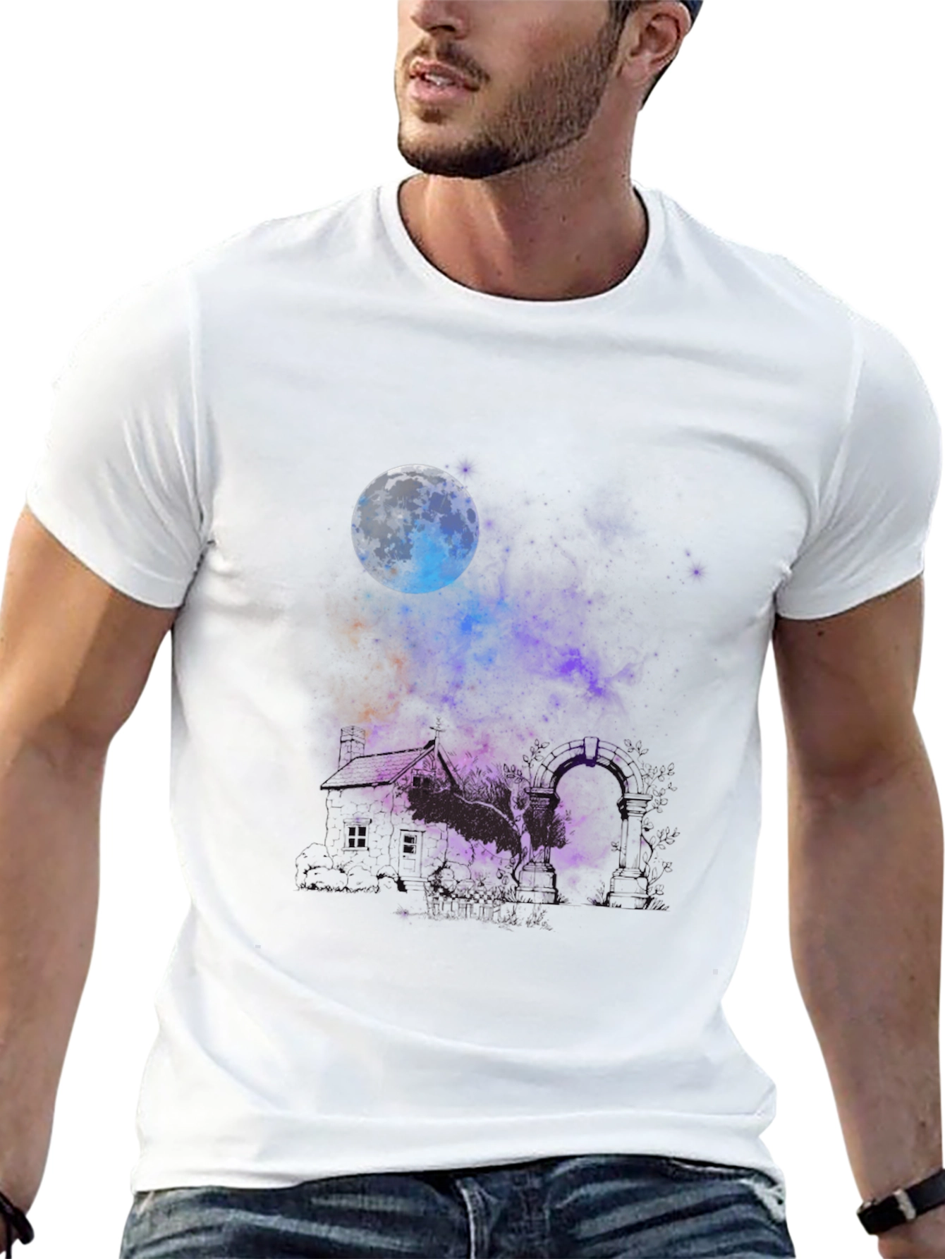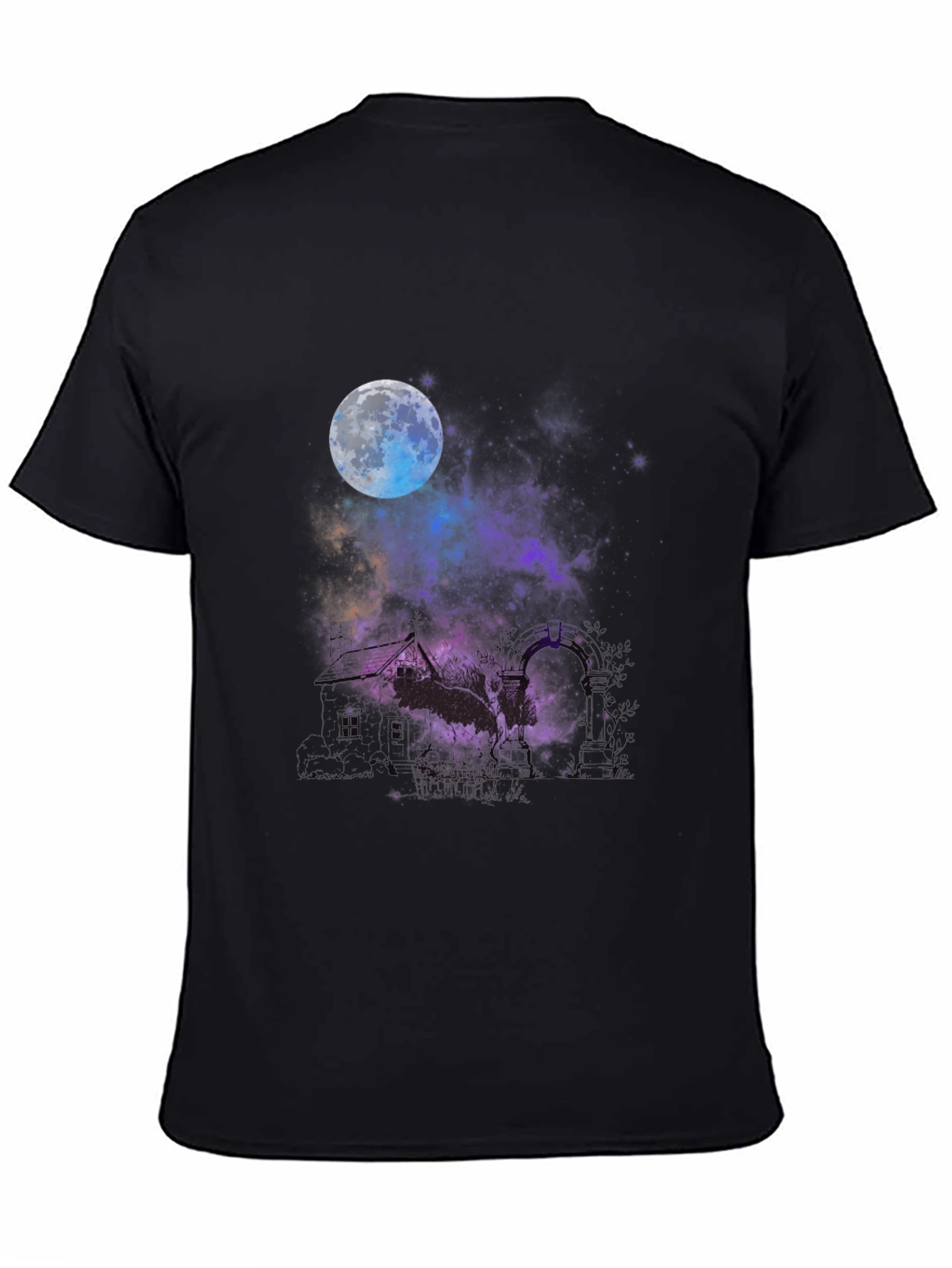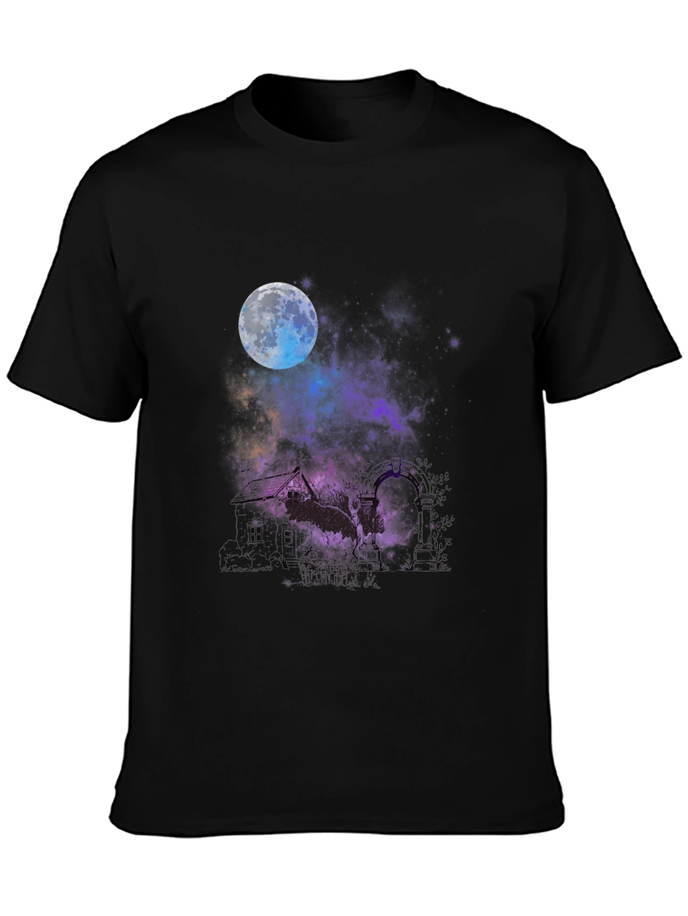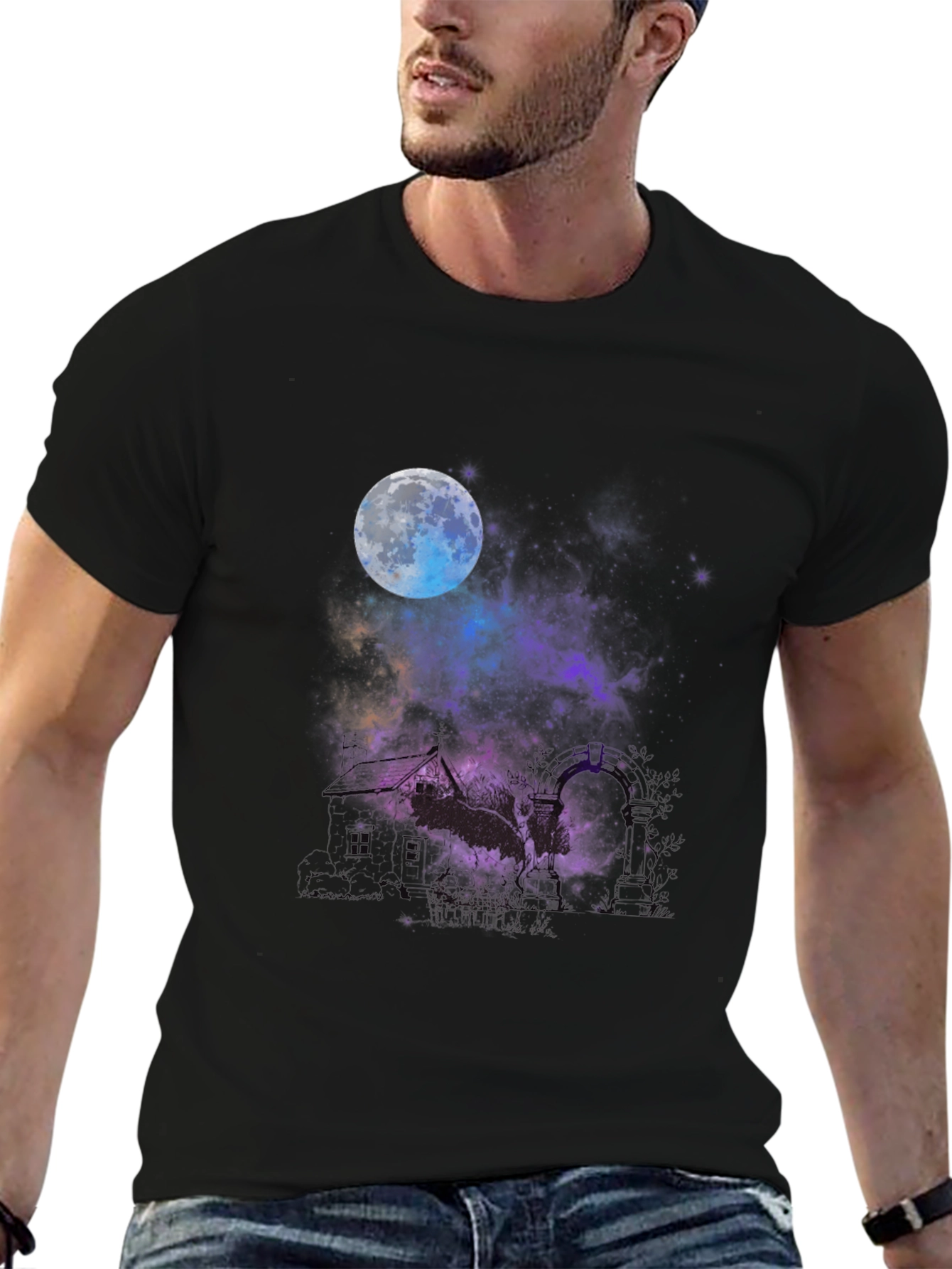 This stylish black t-shirt features a captivating design of a full moon set against a vibrant galaxy backdrop. The graphic print showcases a blend of blues, purples, and oranges, creating a mesmerizing cosmic effect. Made from a comfortable, breathable fabric, this shirt offers a relaxed fit, perfect for everyday wear. Whether you're a fan of astronomy or simply appreciate unique apparel, this tee will add a touch of celestial charm to your wardrobe. Ideal for casual outings, concerts, or simply lounging at home. Elevate your style with this eye-catching galaxy tee!