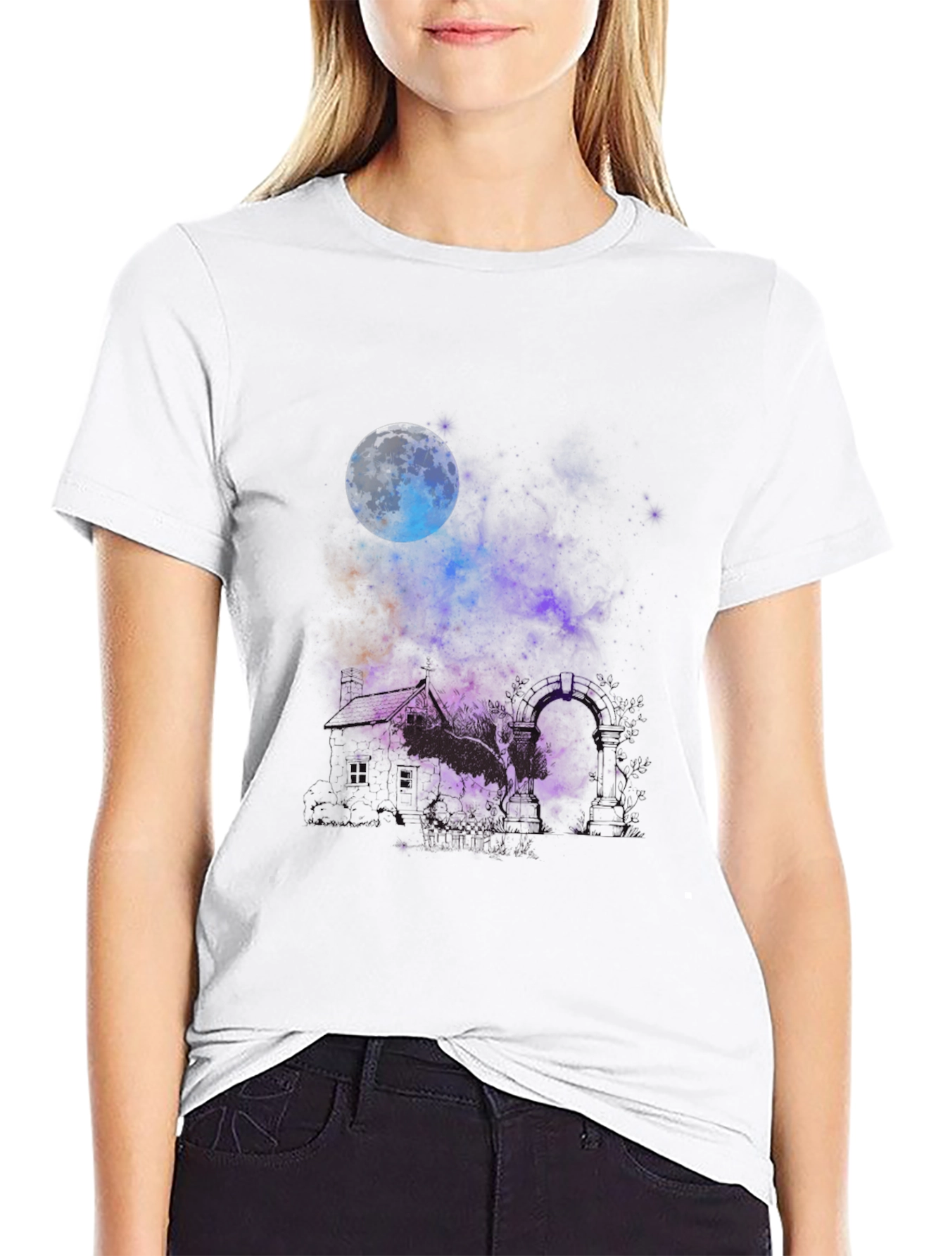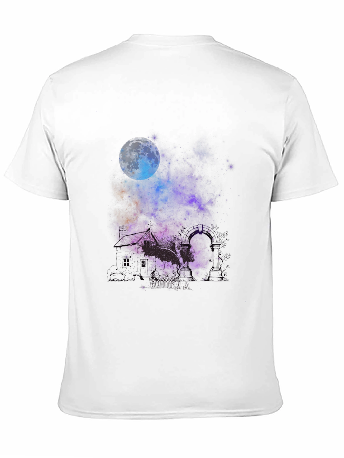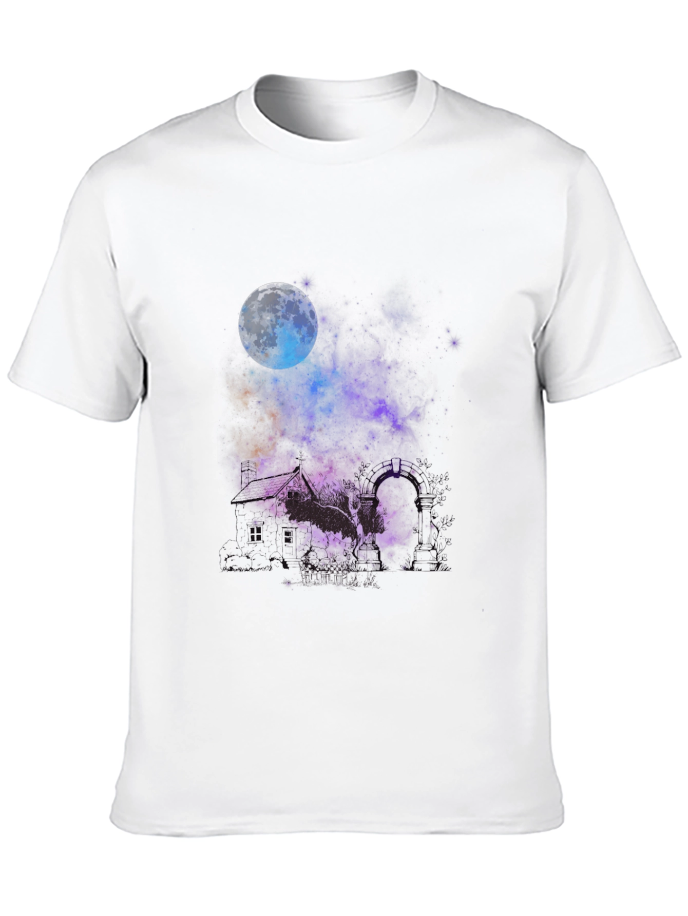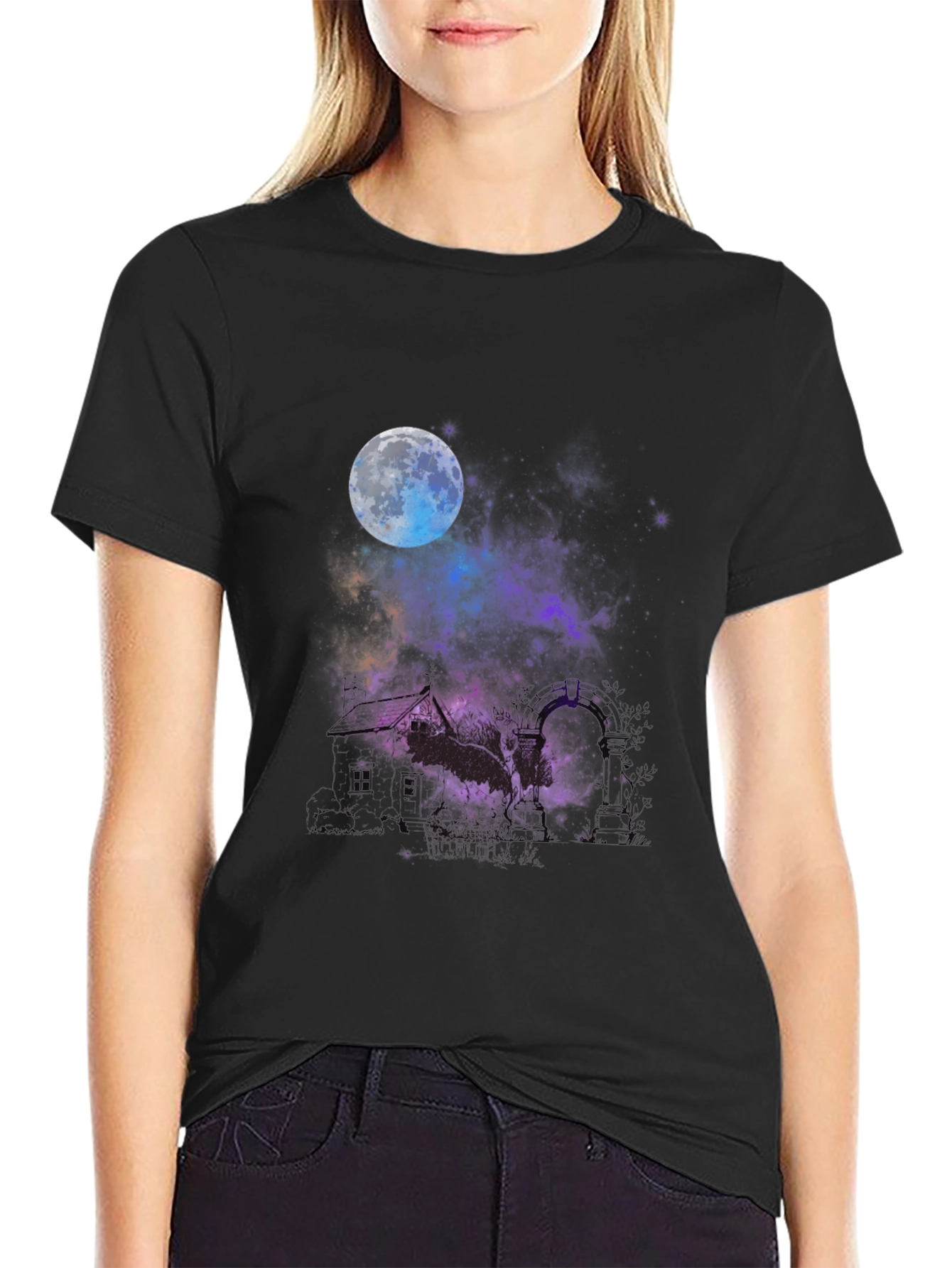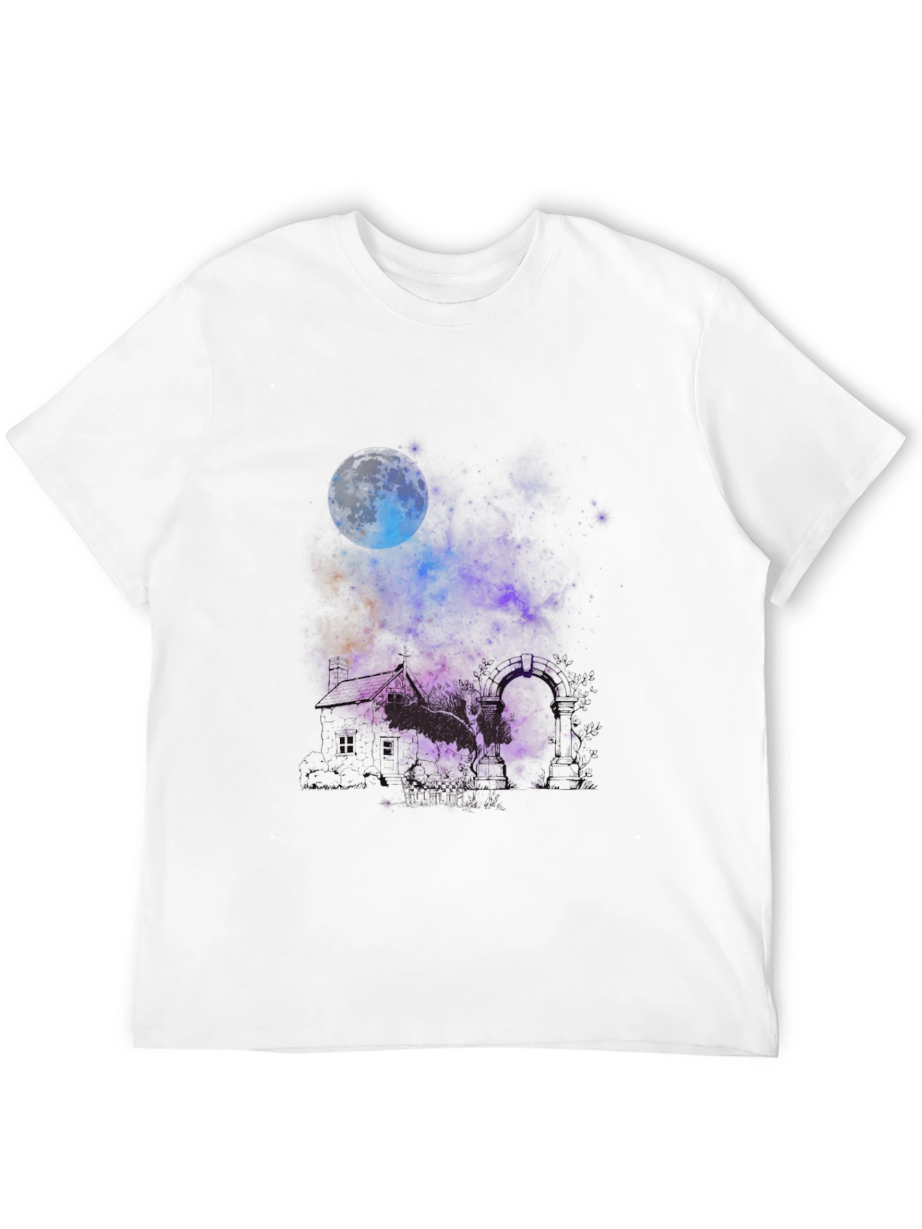 This stylish black t-shirt features a captivating design of a full moon set against a vibrant galaxy backdrop. The graphic print showcases a blend of blues, purples, and oranges, creating a mesmerizing cosmic effect. Made from a comfortable, breathable fabric, this shirt offers a relaxed fit, perfect for everyday wear. Whether you're a fan of astronomy or simply appreciate unique apparel, this tee will add a touch of celestial charm to your wardrobe. Ideal for casual outings, concerts, or simply lounging at home. Elevate your style with this eye-catching galaxy tee!