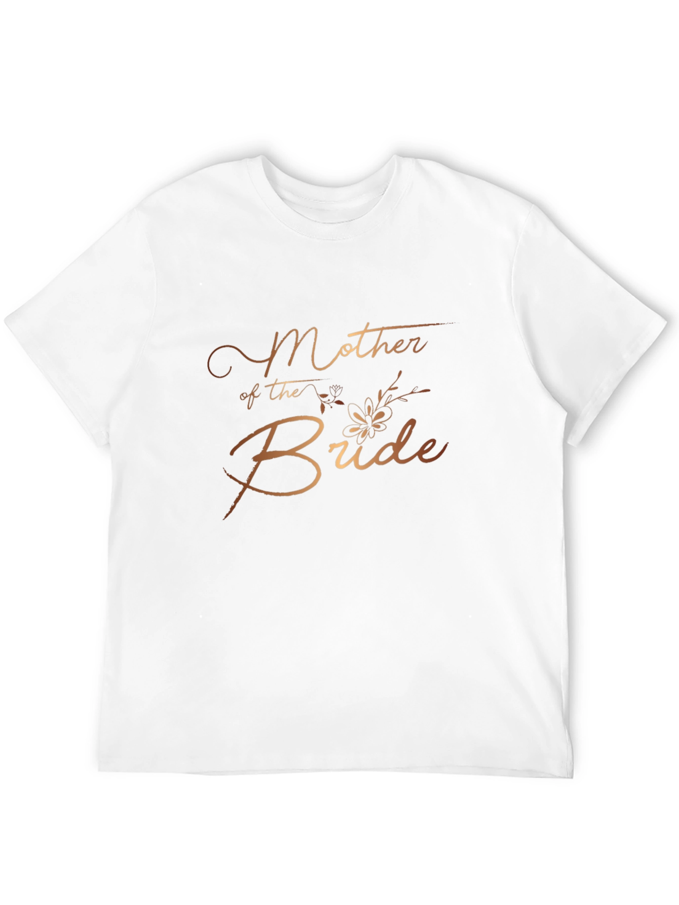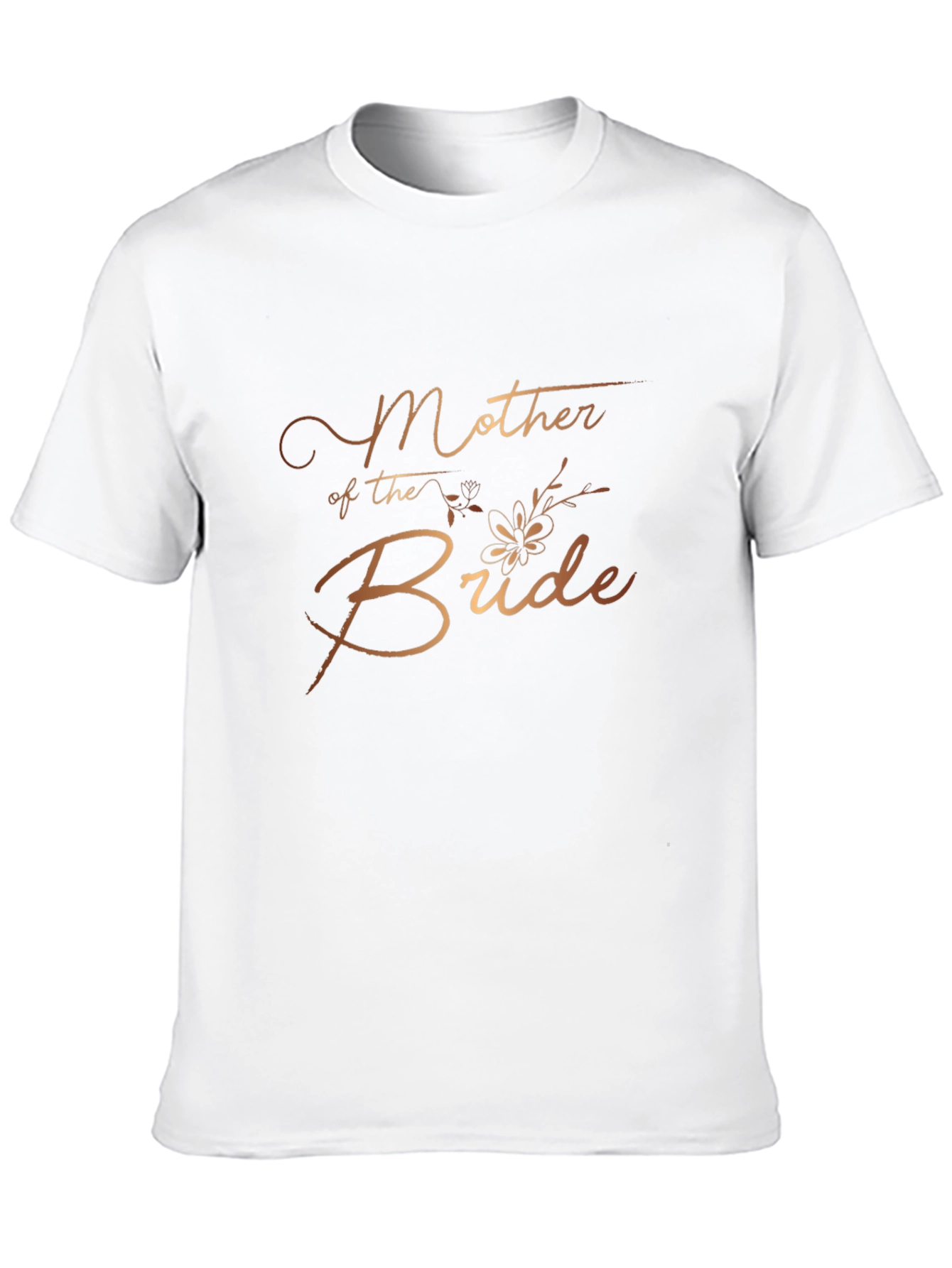 Celebrate the special day with this stylish 'Mother of the Bride' t-shirt. The elegant script design, featuring delicate floral accents, is printed in a shimmering gold-tone on a classic black tee. Made from a soft, comfortable fabric, this shirt is perfect for wearing to the bridal shower, rehearsal dinner, or even on the big day itself. Show your support and love for the happy couple in this chic and memorable keepsake. A wonderful gift idea and a great way to feel part of the celebration!
