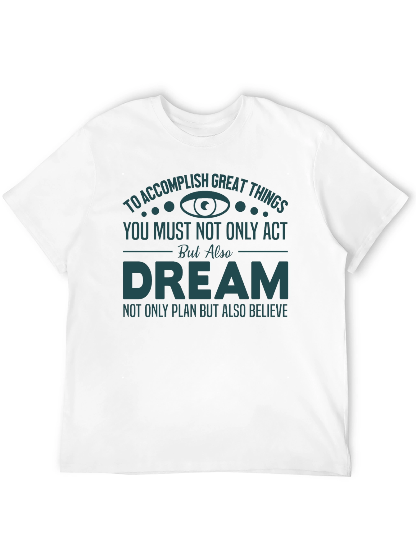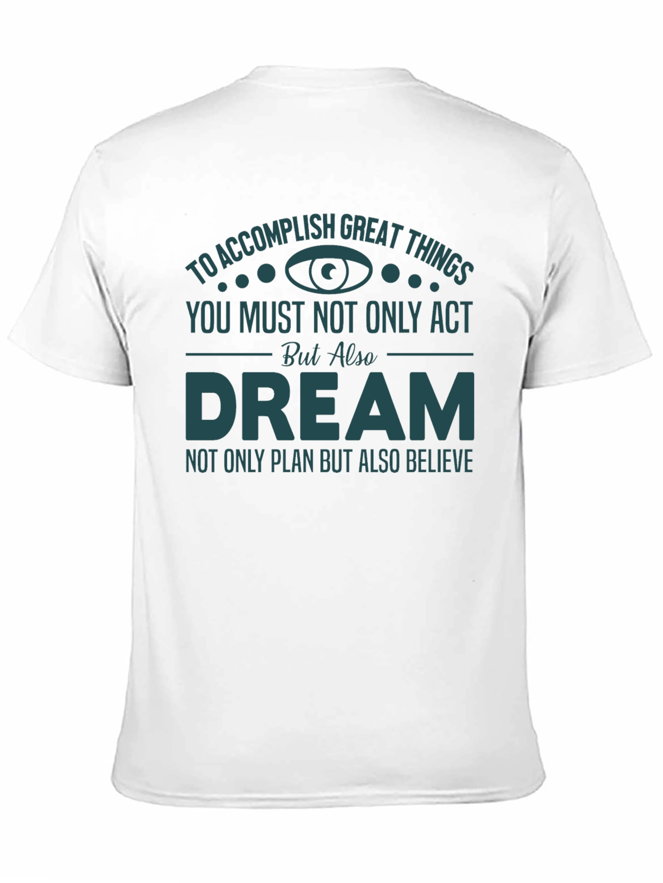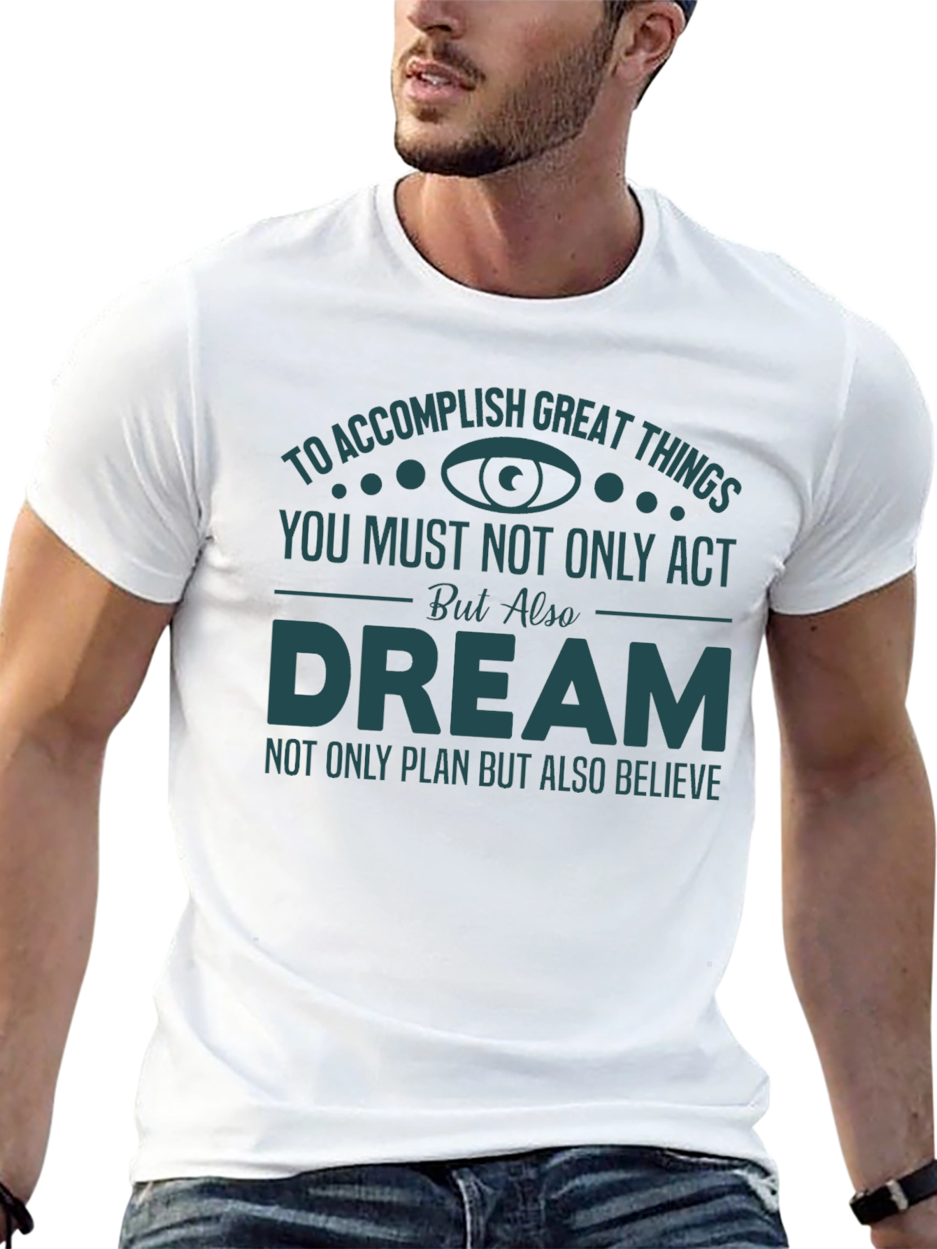 This stylish black t-shirt features a motivational message in a teal color. The shirt is made of a soft and comfortable fabric. The tee displays the text: "To accomplish great things you must not only act but also dream. Not only plan but also believe". The design incorporates an eye icon as part of the text, adding a creative touch. The short sleeves and classic fit make it perfect for casual wear. Ideal for anyone seeking a daily dose of inspiration, this t-shirt is perfect for everyday wear, gym sessions, or casual outings. Grab this eye-catching tee and inspire yourself and those around you.