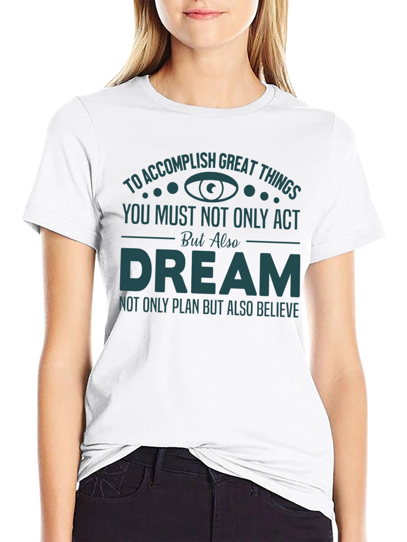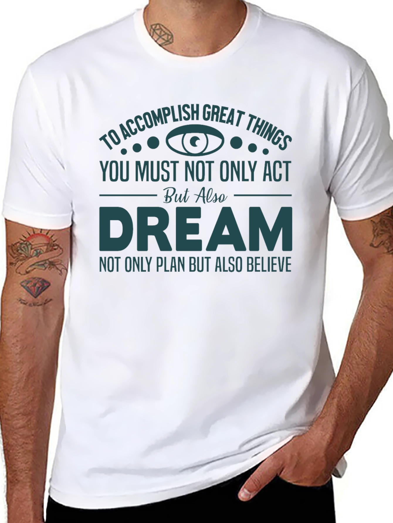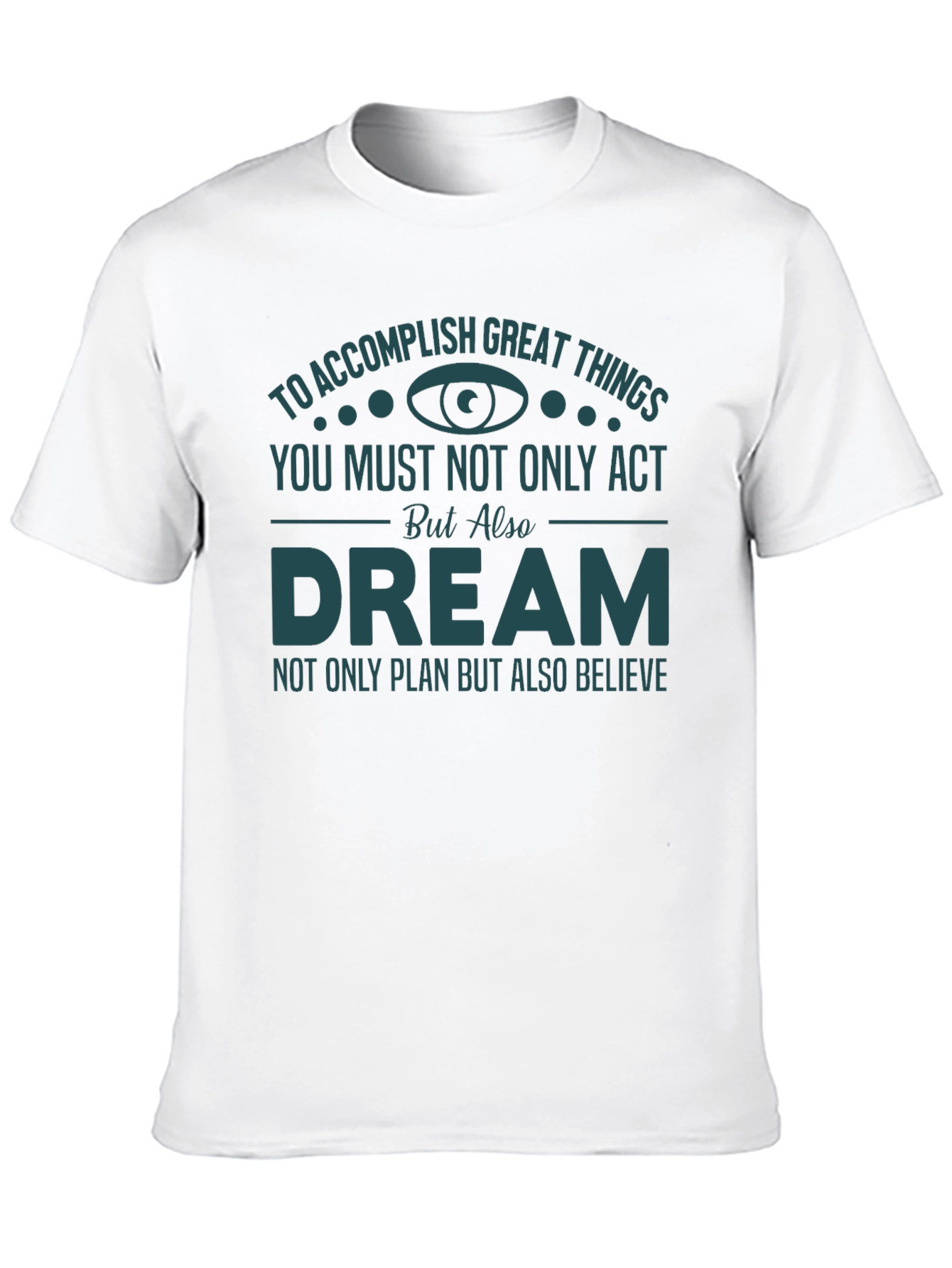 This stylish black t-shirt features a motivational message in a teal color. The shirt is made of a soft and comfortable fabric. The tee displays the text: "To accomplish great things you must not only act but also dream. Not only plan but also believe". The design incorporates an eye icon as part of the text, adding a creative touch. The short sleeves and classic fit make it perfect for casual wear. Ideal for anyone seeking a daily dose of inspiration, this t-shirt is perfect for everyday wear, gym sessions, or casual outings. Grab this eye-catching tee and inspire yourself and those around you.