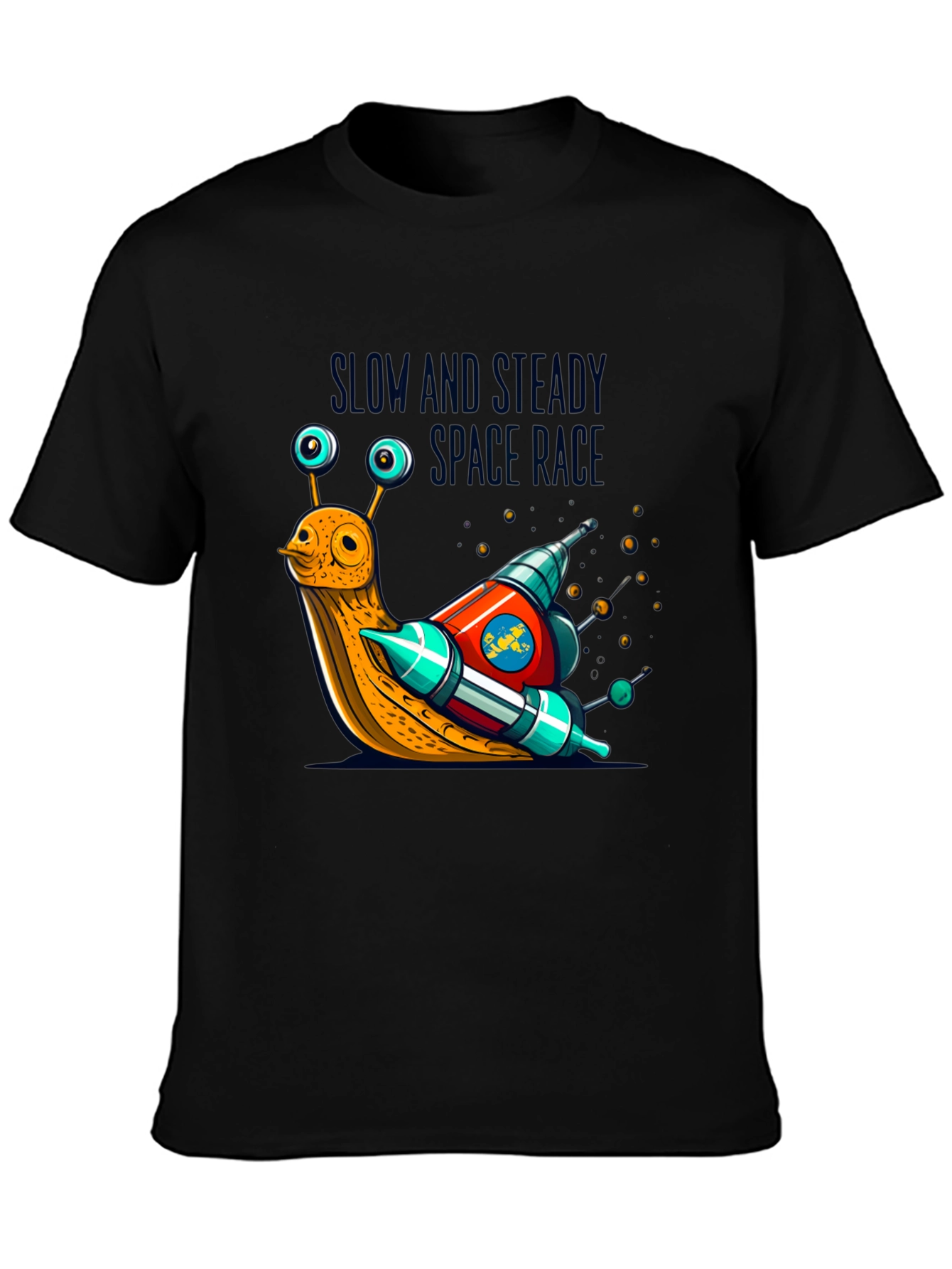 Embark on an interstellar journey with this unique black t-shirt. It features a captivating graphic of a snail riding a rocket, symbolizing the motto "Slow and Steady Space Race." The playful design is printed on a smooth, comfortable fabric, perfect for everyday wear. The shirt's dark color makes the vibrant graphic pop, ensuring you'll stand out from the crowd. Whether you're a space enthusiast or appreciate quirky art, this tee is a great way to express your personality. Add this fun and stylish shirt to your wardrobe today!