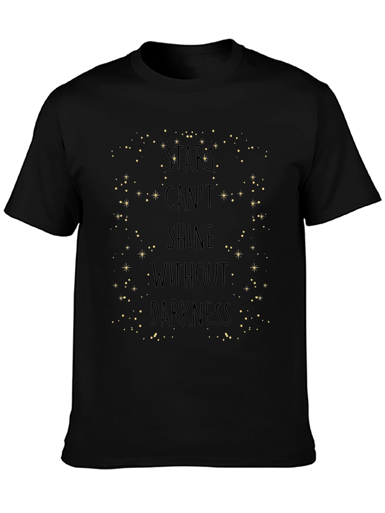 Embrace the power of resilience with this striking black t-shirt. The design features the inspiring quote "Stars Can't Shine Without Darkness", surrounded by a constellation of shimmering stars, creating a visually captivating and meaningful statement. Made from comfortable, breathable fabric, this tee is perfect for everyday wear. Ideal for those who appreciate motivational messages and celestial themes, this t-shirt is a great conversation starter. Wear it to express your inner strength, add a touch of cosmic style to your wardrobe, or gift it to someone who needs a reminder that even in the darkest times, they can still shine. Stand out and inspire with this unique tee!