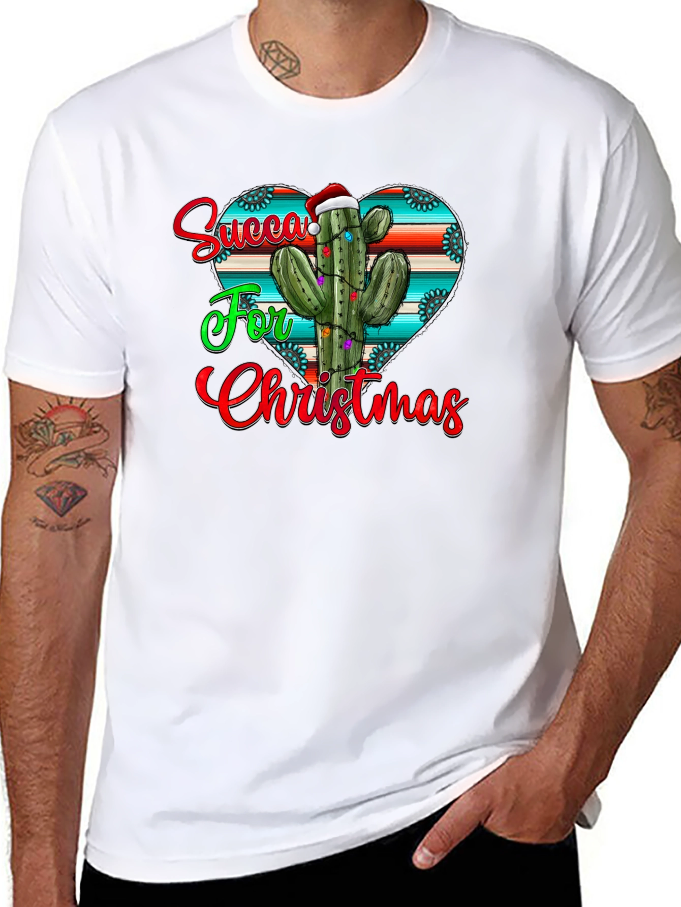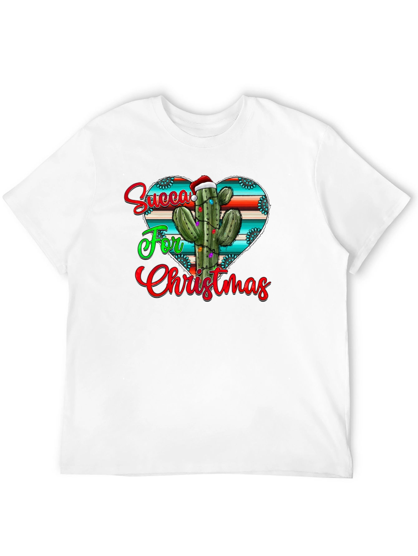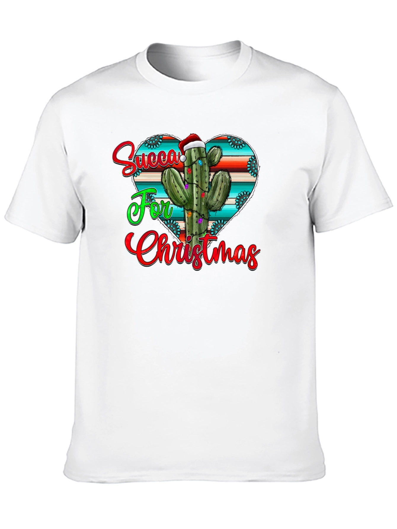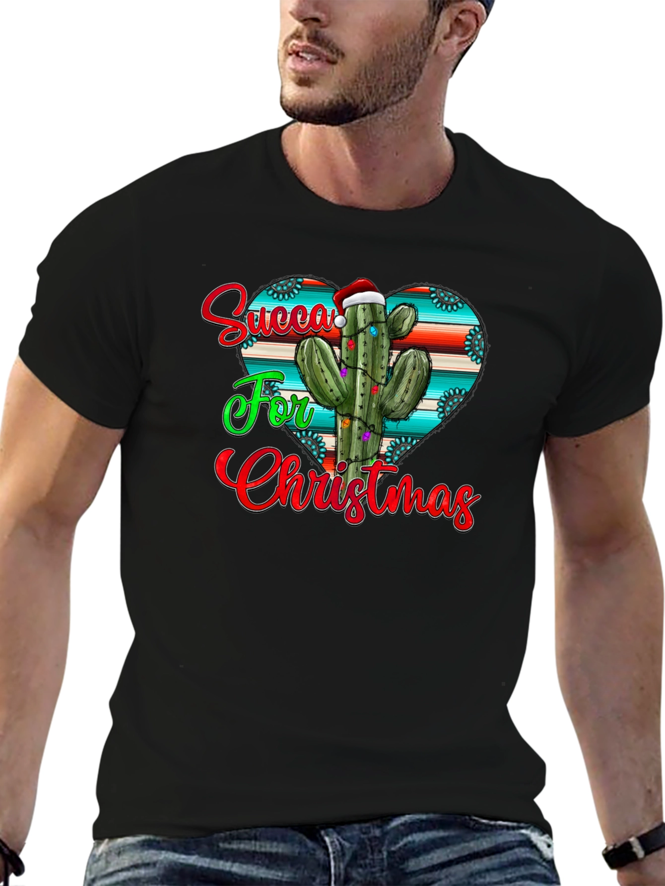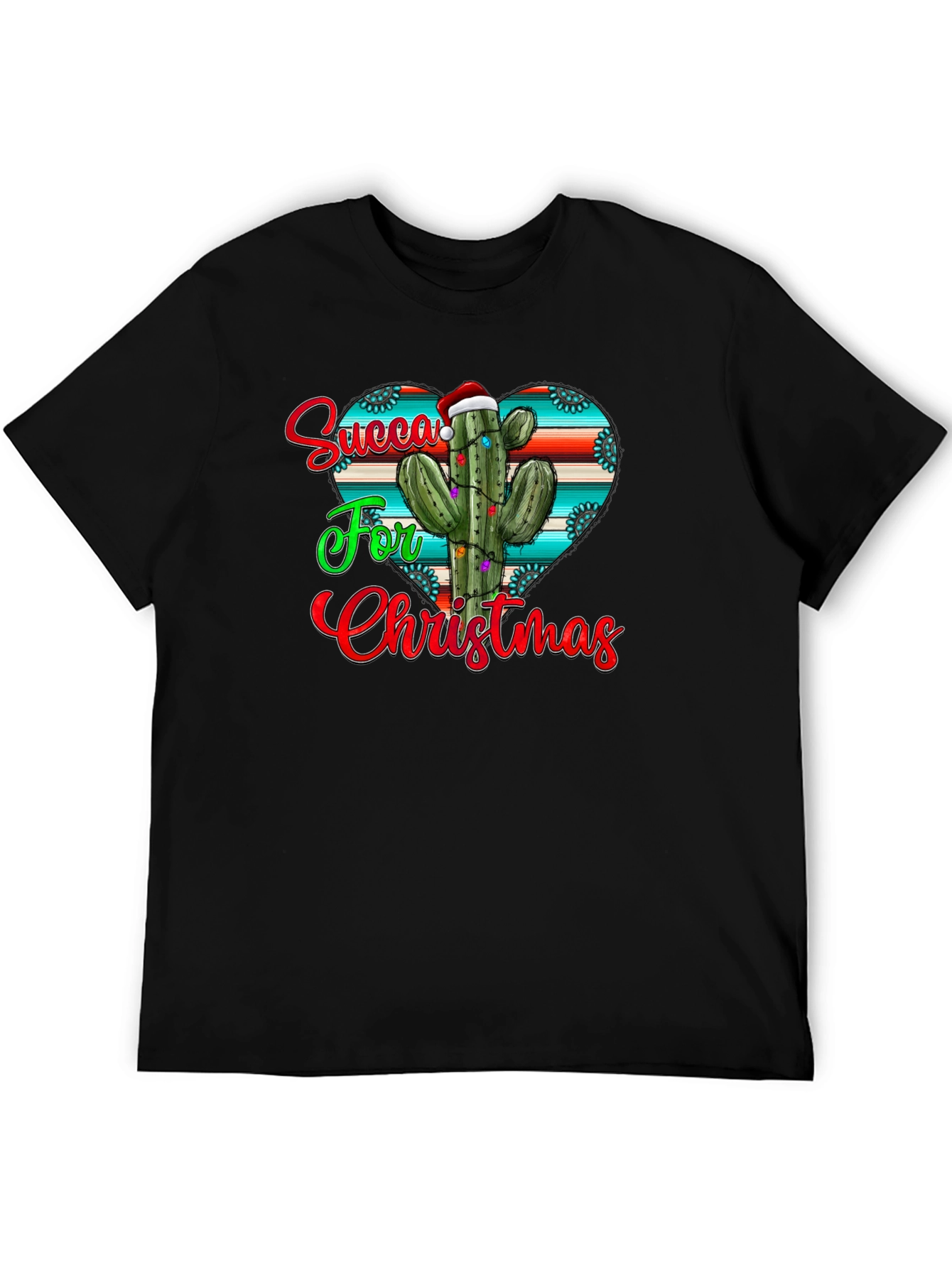 Celebrate the holidays with this unique graphic tee! This eye-catching black t-shirt features a vibrant "Succa For Christmas" design with a festive cactus decorated with a Santa hat and Christmas lights. The design is set within a heart-shaped Southwestern-style backdrop. Made from comfortable materials, this tee is perfect for casual wear during the Christmas season. Show off your holiday spirit with a touch of desert charm! This graphic tee makes a great conversation starter at holiday parties, family gatherings, or just for everyday wear. Get yours today and spread the holiday cheer with style!