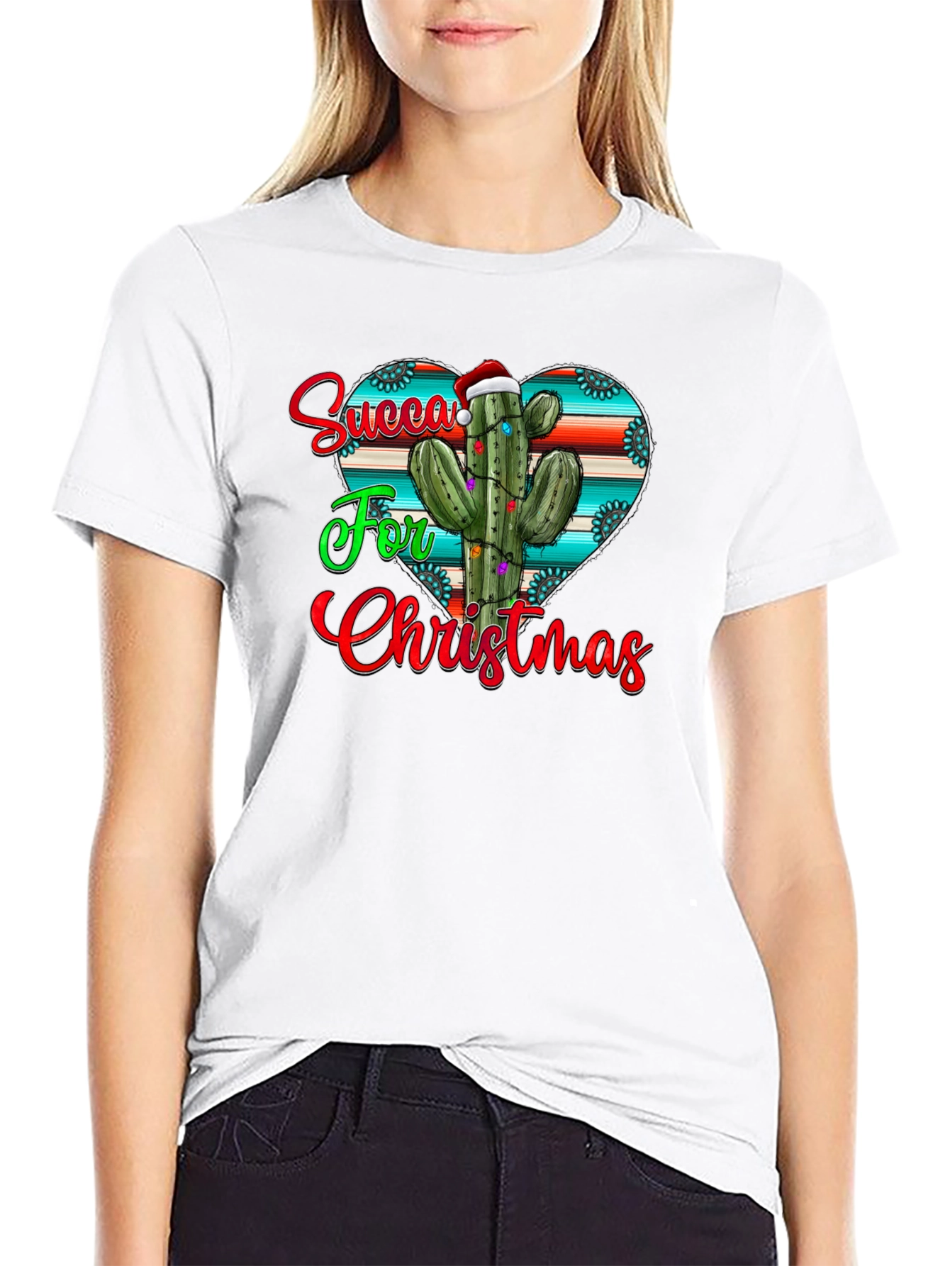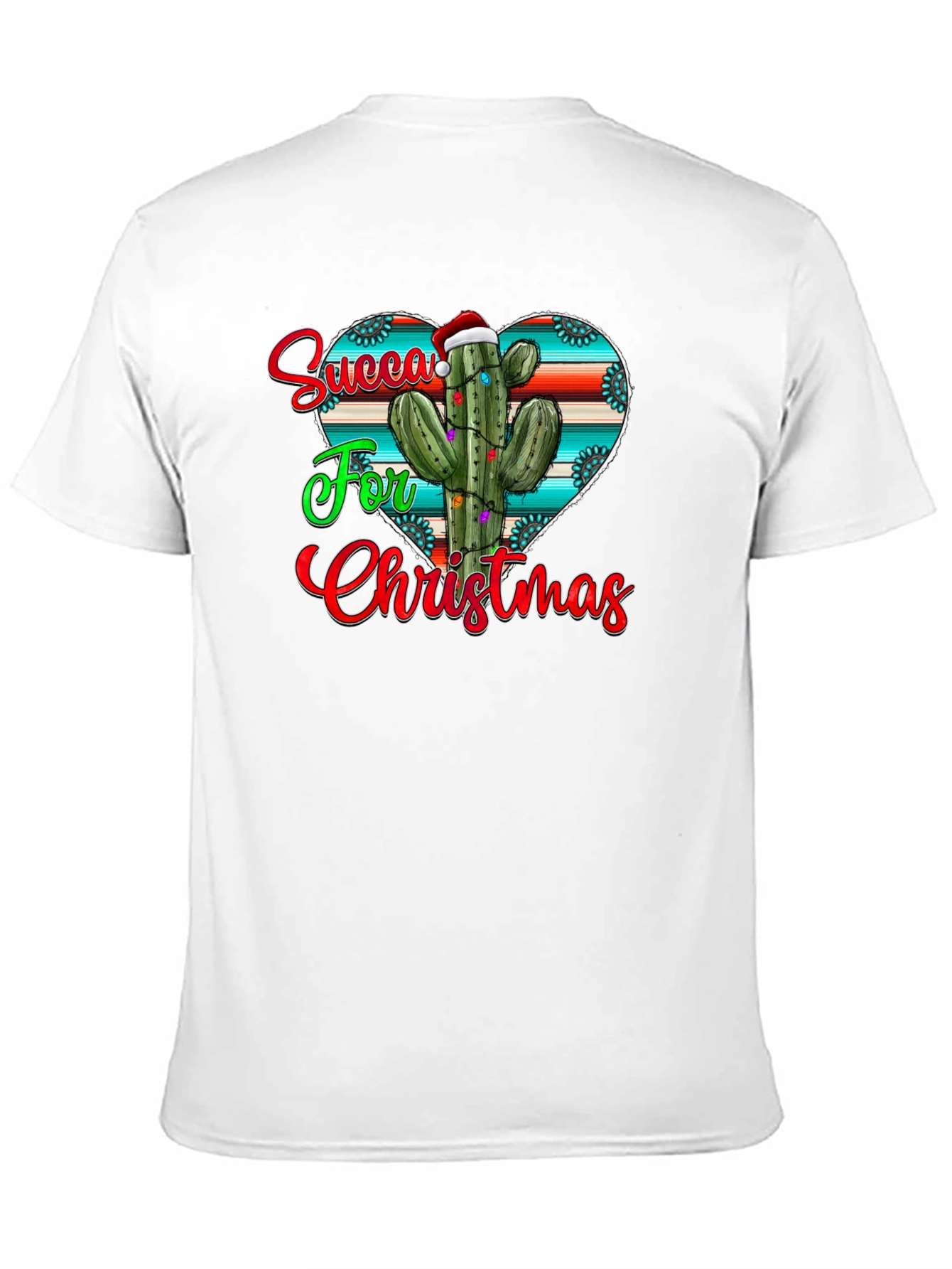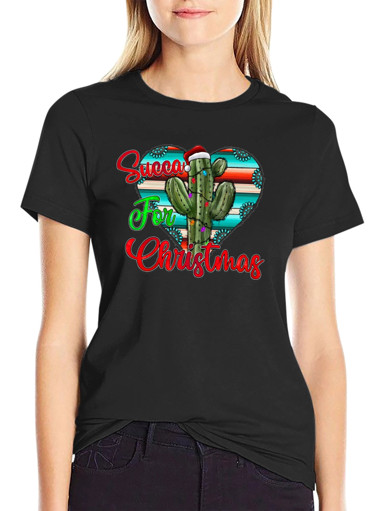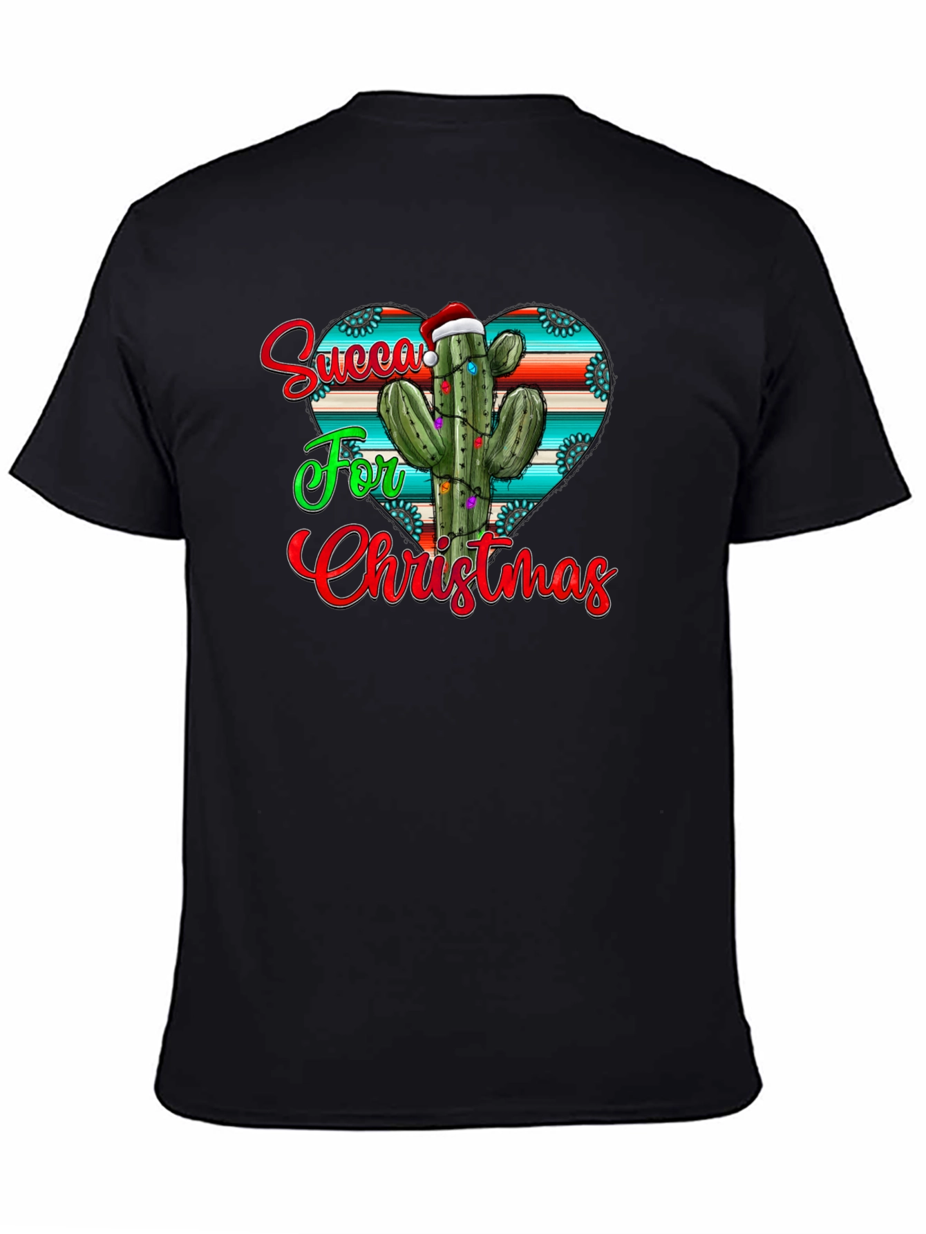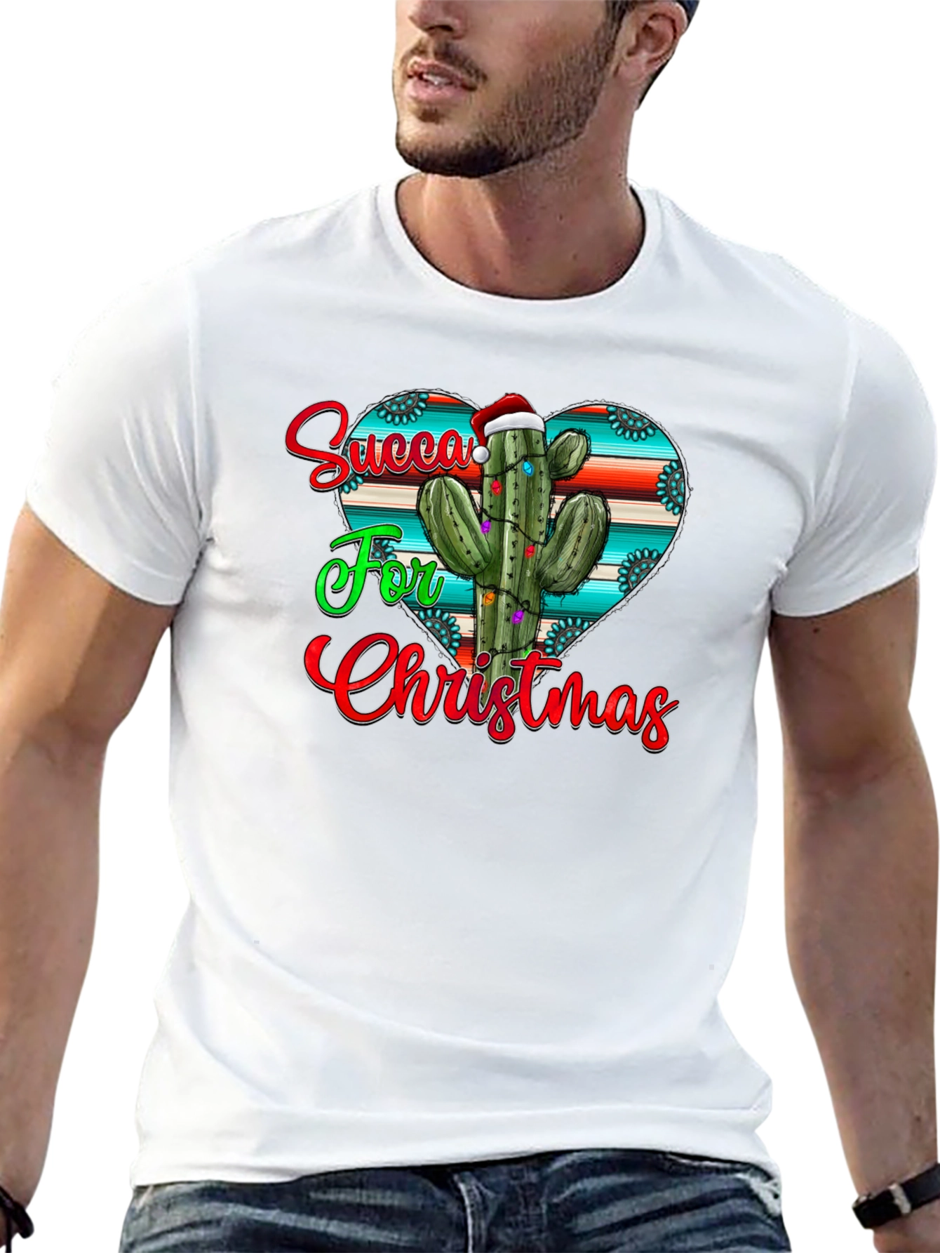 Celebrate the holidays with this unique graphic tee! This eye-catching black t-shirt features a vibrant "Succa For Christmas" design with a festive cactus decorated with a Santa hat and Christmas lights. The design is set within a heart-shaped Southwestern-style backdrop. Made from comfortable materials, this tee is perfect for casual wear during the Christmas season. Show off your holiday spirit with a touch of desert charm! This graphic tee makes a great conversation starter at holiday parties, family gatherings, or just for everyday wear. Get yours today and spread the holiday cheer with style!