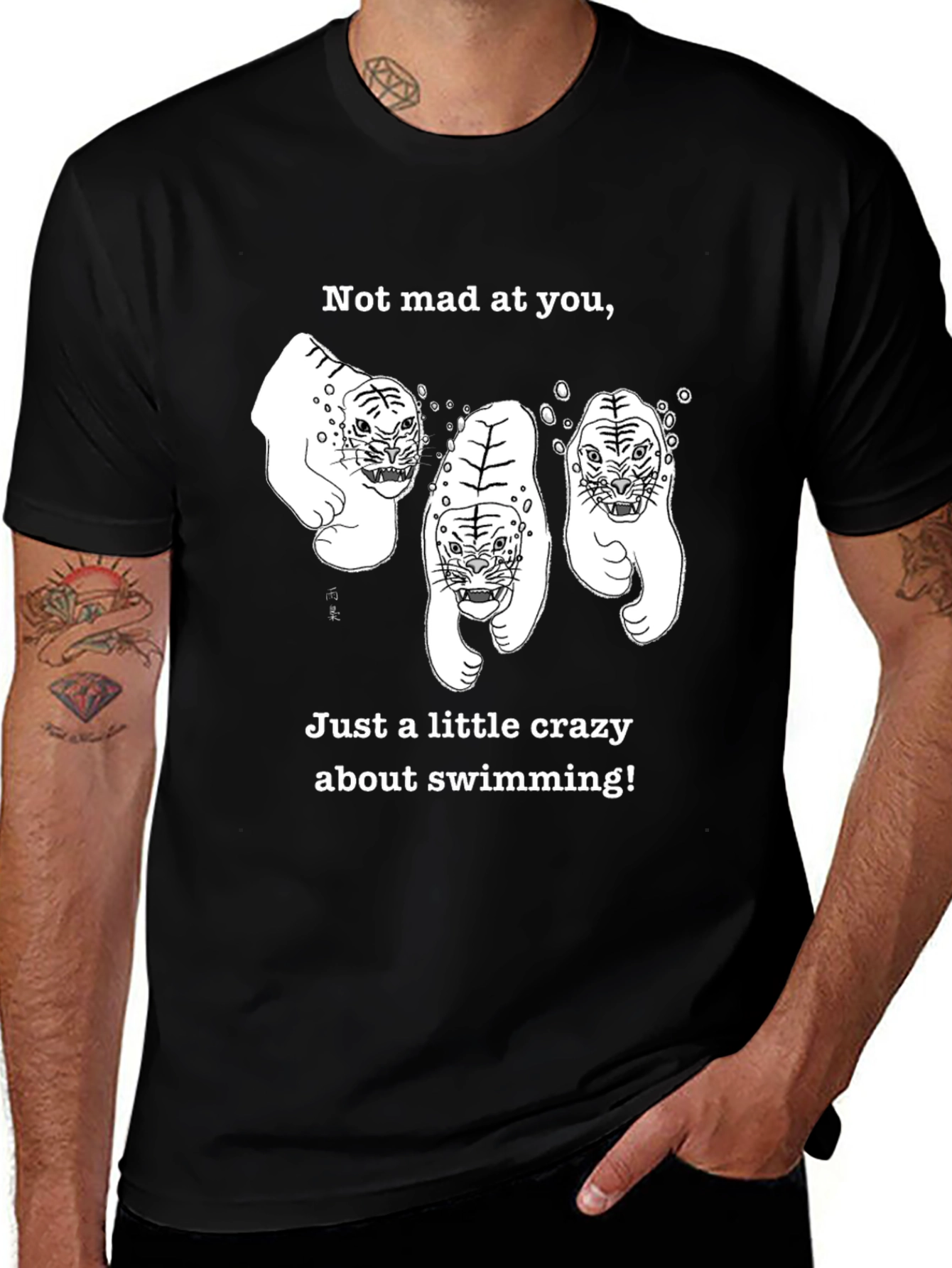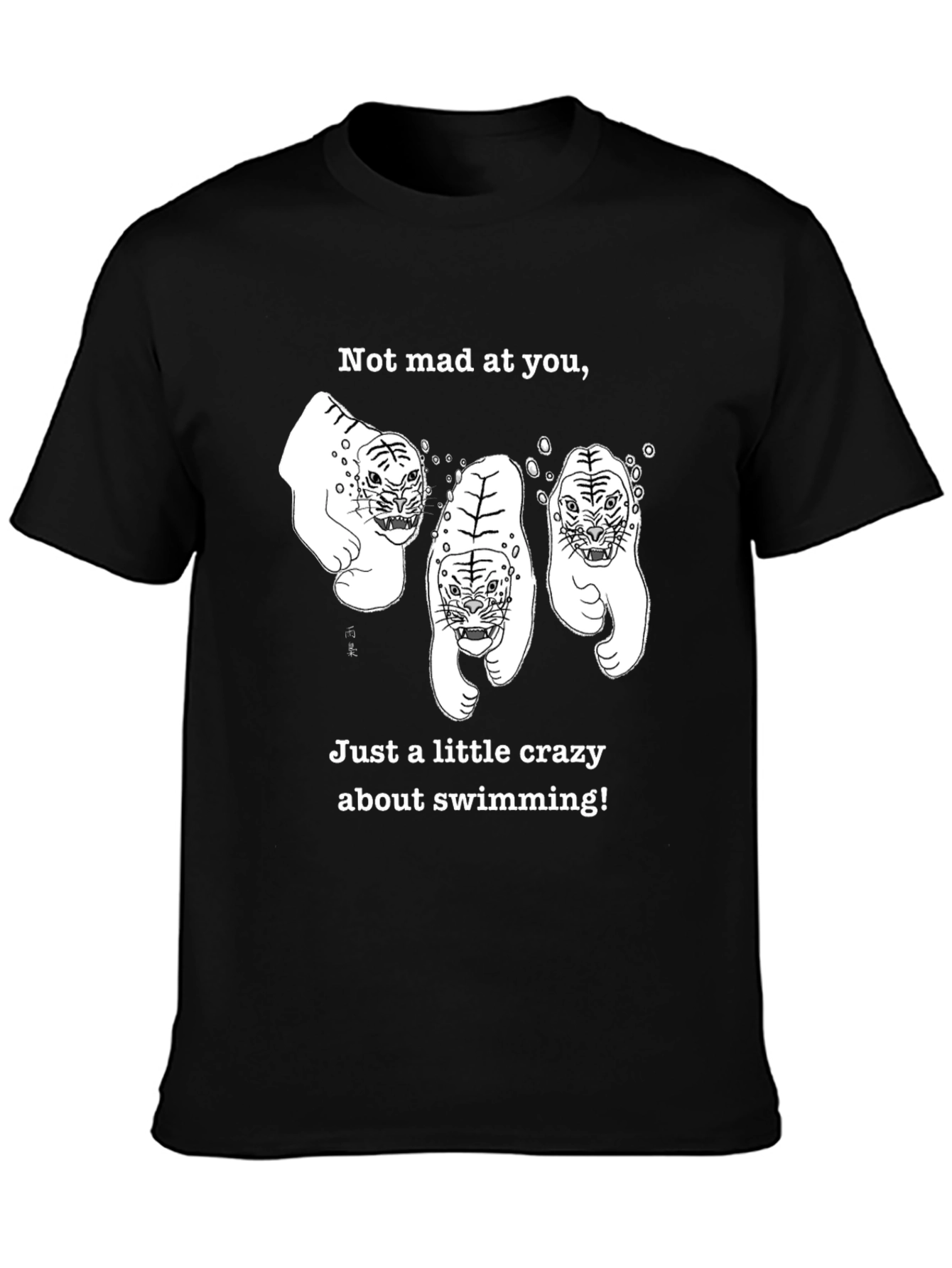 Dive into style with this unique black t-shirt! Featuring a playful graphic of three swimming tigers, complete with bubbles, the shirt reads, 'Not mad at you, Just a little crazy about swimming!'. This tee is perfect for swimmers, animal lovers, or anyone with a fun sense of humor. The classic black color makes it versatile for everyday wear. Made from comfortable, breathable fabric, this tee offers both style and comfort. Stand out from the crowd with this eye-catching t-shirt that's sure to spark conversations and showcase your love for swimming and quirky designs.