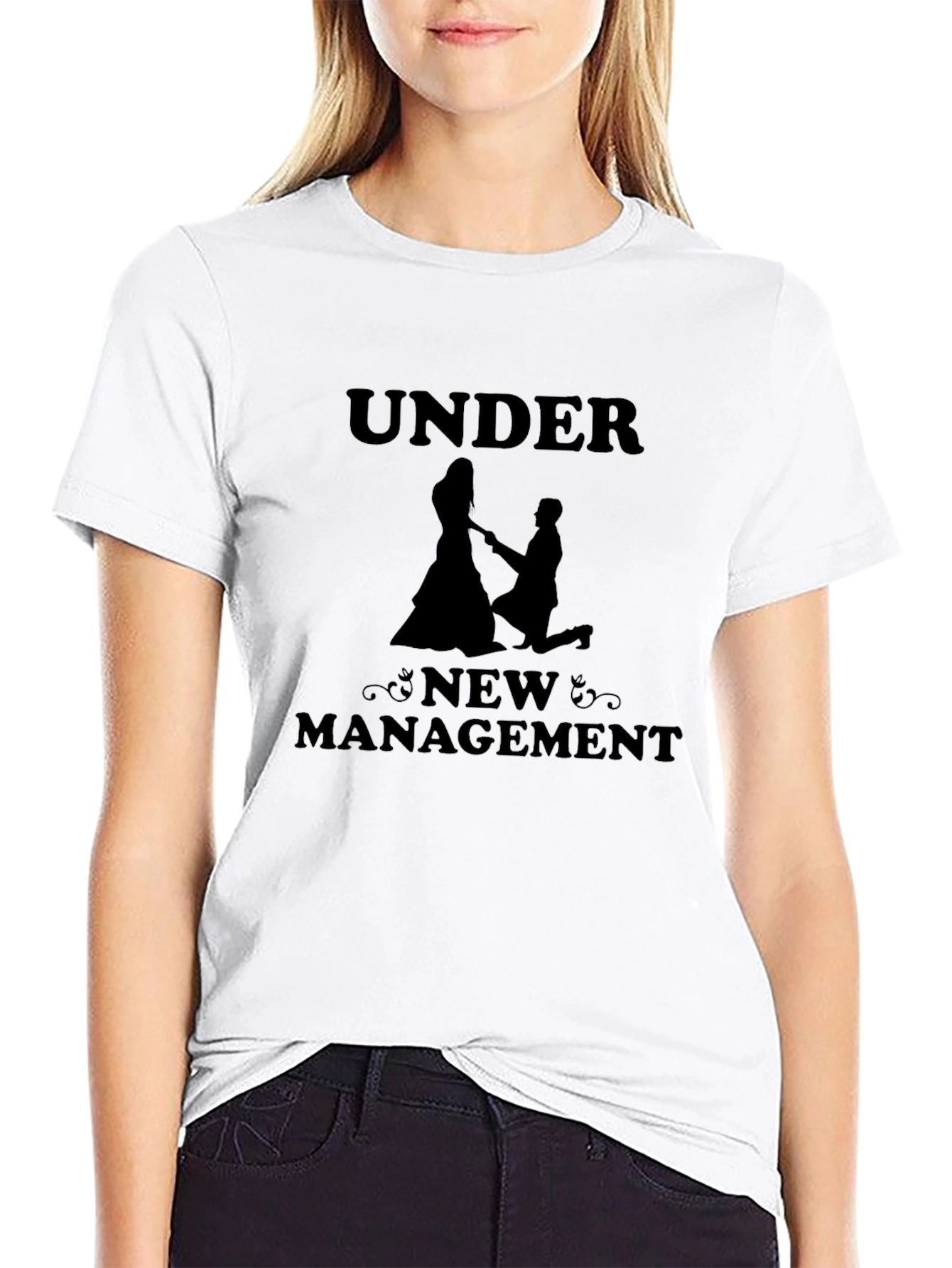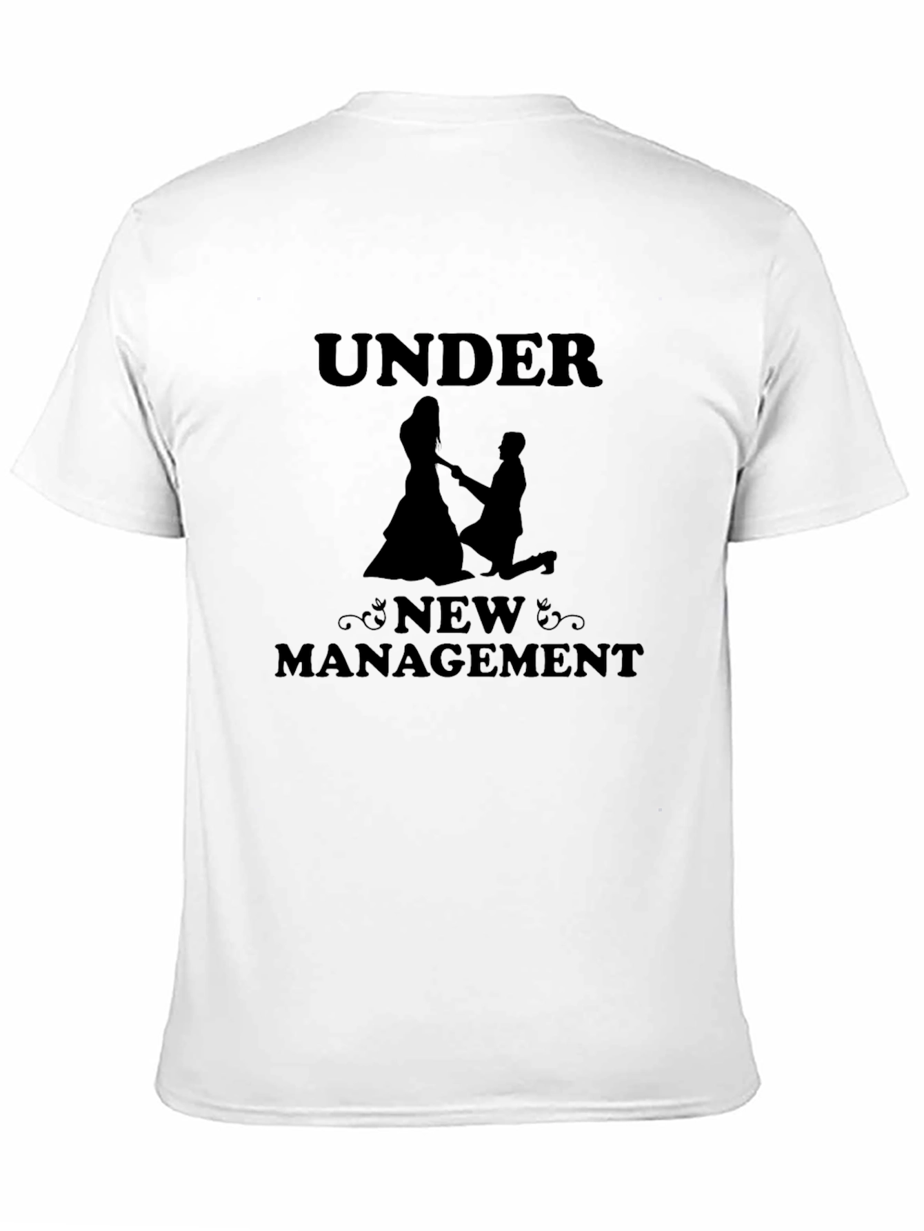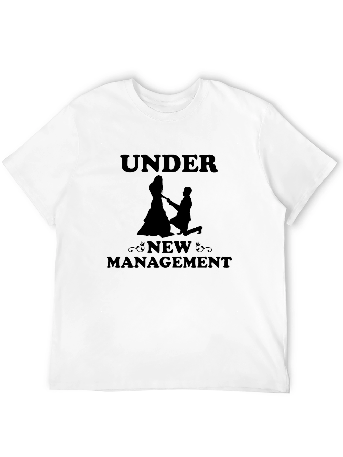 This black t-shirt features a bold graphic design that's perfect for newlyweds or anyone celebrating a new chapter! The design includes the words "UNDER" and "NEW MANAGEMENT" stacked with a silhouette of a marriage proposal between them. It is made from a soft, comfortable fabric. Perfect for casual wear or a fun gift for a soon-to-be-married couple! Show off your new status or celebrate a friend's wedding with this unique and stylish tee.