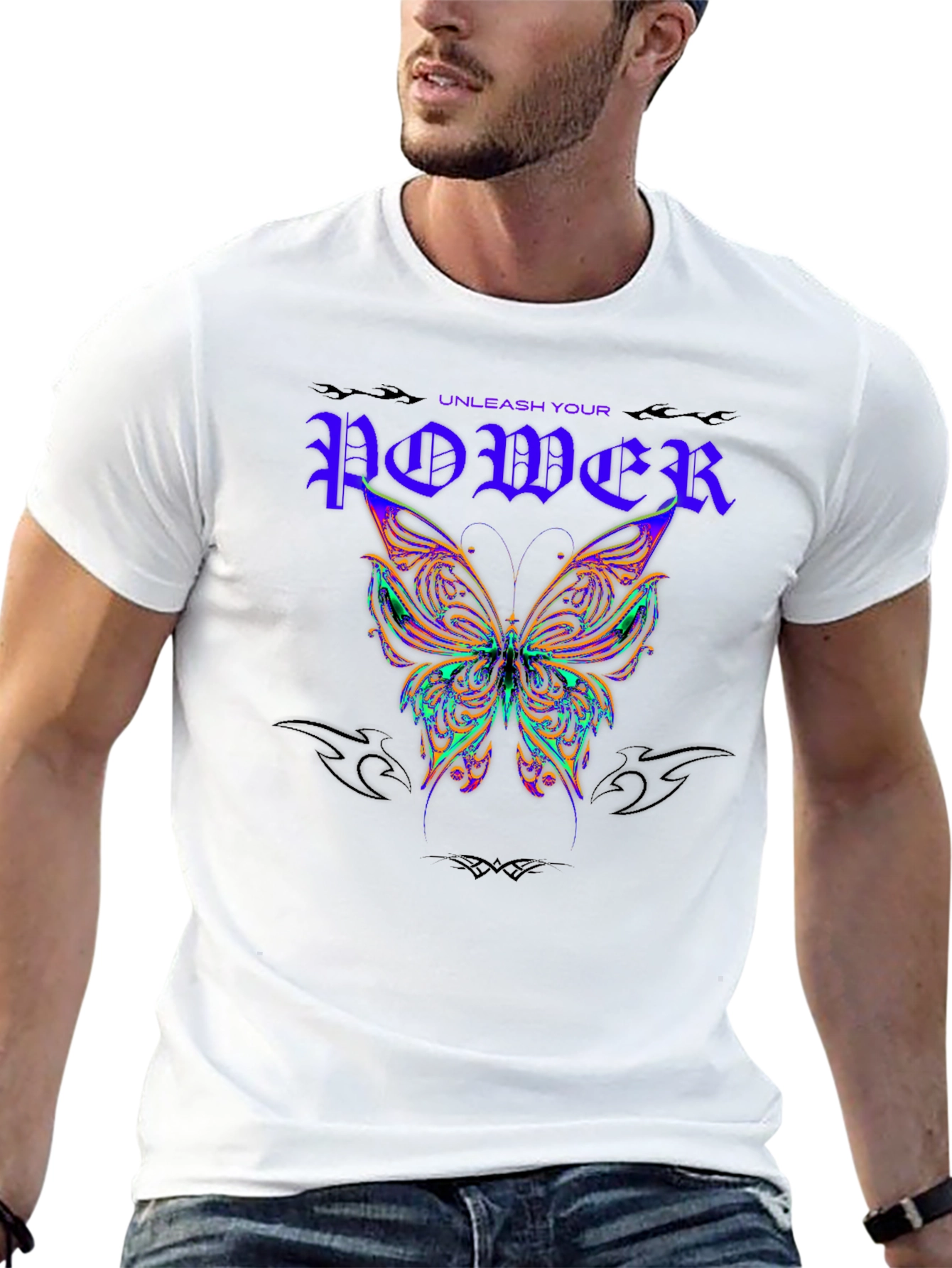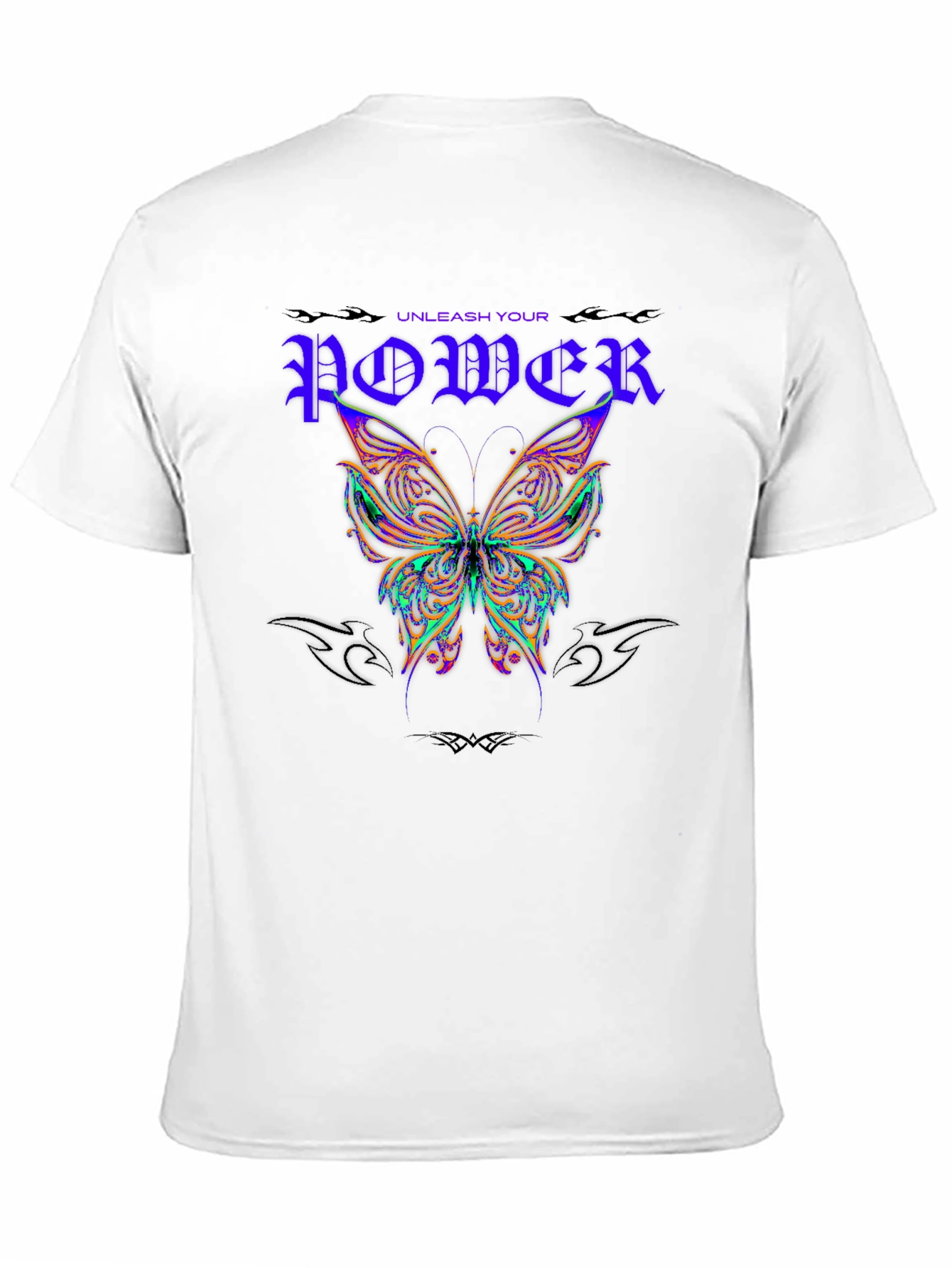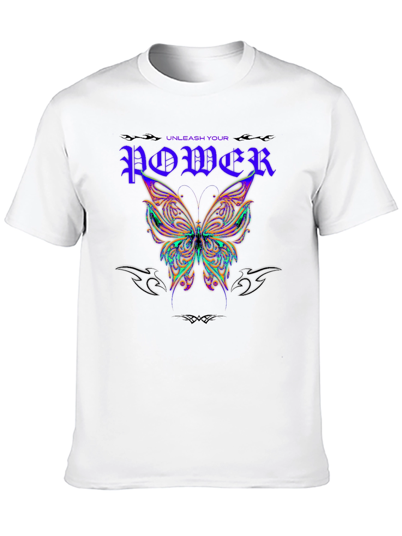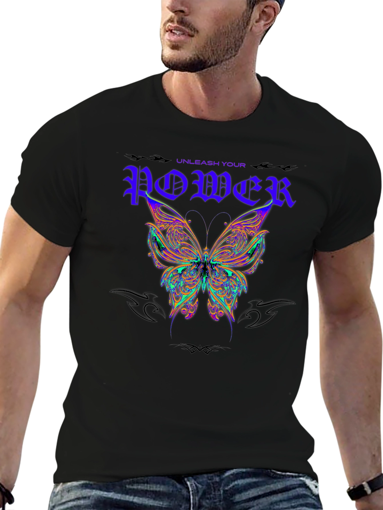 Show your inner strength with this eye-catching black t-shirt. Featuring a vibrant, intricately designed butterfly graphic with "Unleash Your Power" text, this tee is perfect for making a bold statement. The detailed, colorful butterfly design stands out against the classic black backdrop. Made from a comfortable, breathable fabric, it's ideal for everyday wear. Whether you're expressing your individuality or simply love unique graphic tees, this shirt will turn heads. Add a touch of edgy style to your wardrobe today. This is a must-have for anyone seeking a blend of comfort, style, and self-expression.